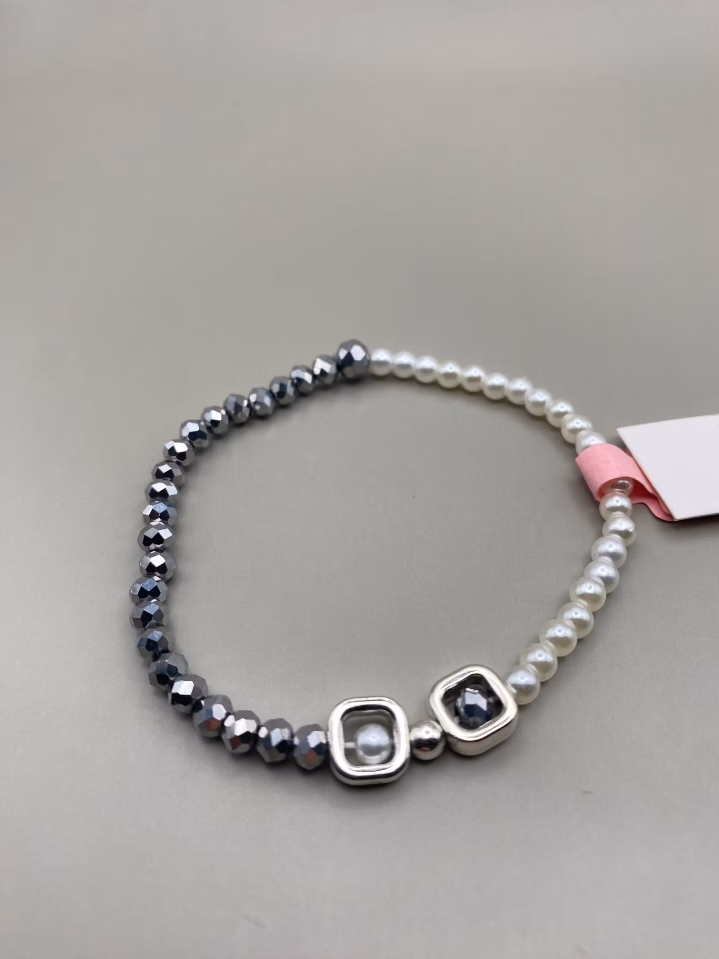 Fint stiligt armband av små benvita pärlor på ena sidan av armbandet, silverstålgråfärgade glasstenar på andra sidan av armbandet. Silverfärgade fyrkantiga höljen kring vardera benvit pärla och silver stålgrå glaspärla i blickfånget.