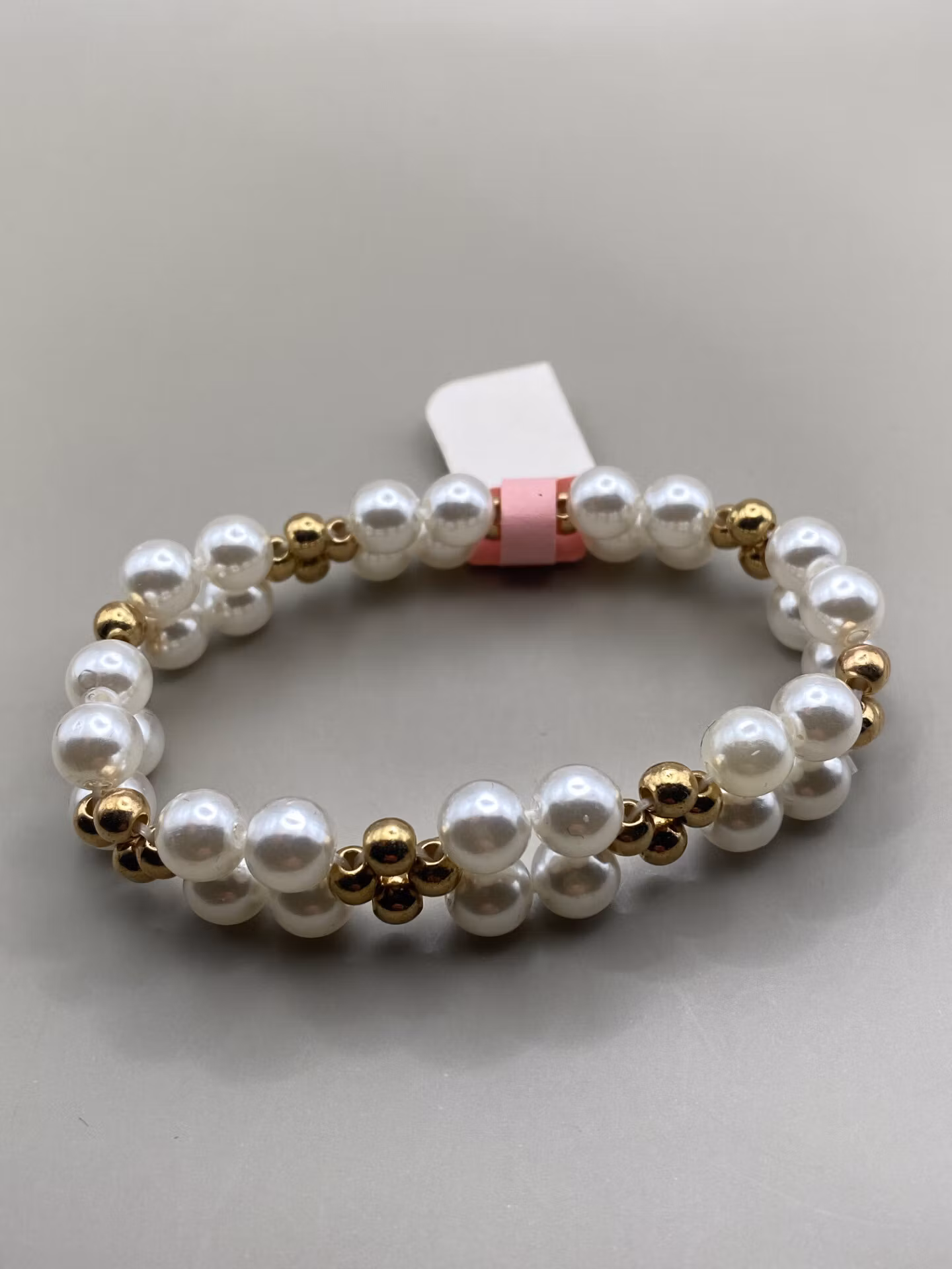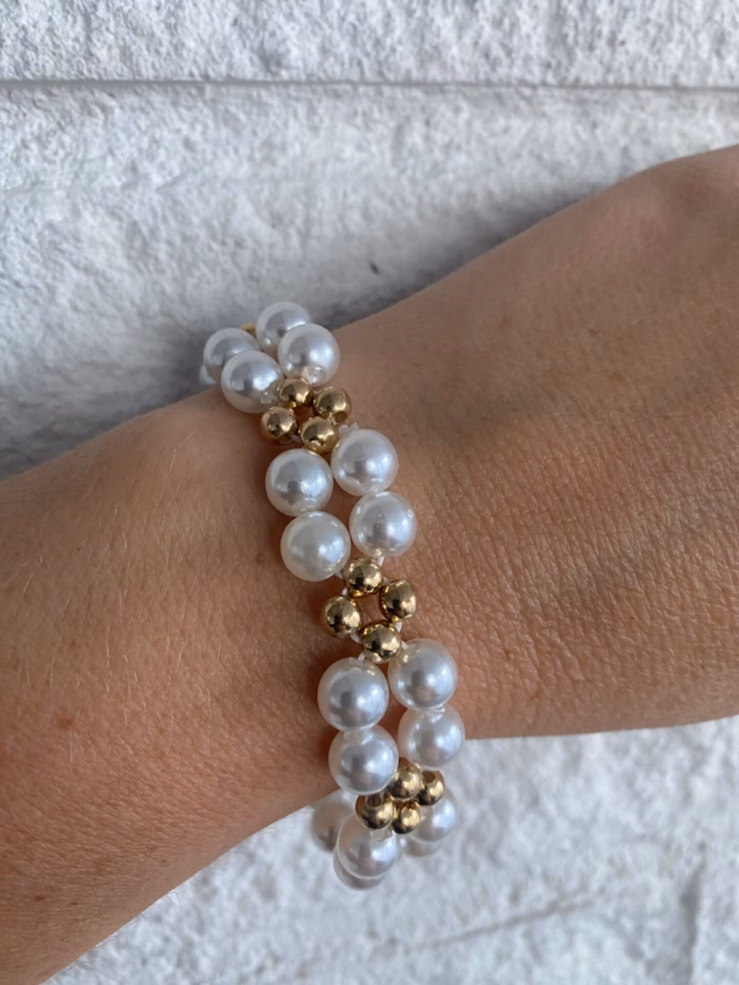 Fint vackert flerradigt armband i varvat mönster av benvita stora pärlor och guldfärgade mindre pärlor.Pärlor 8mm, 6mmVisas produkten "Tillfälligt slut" efter a