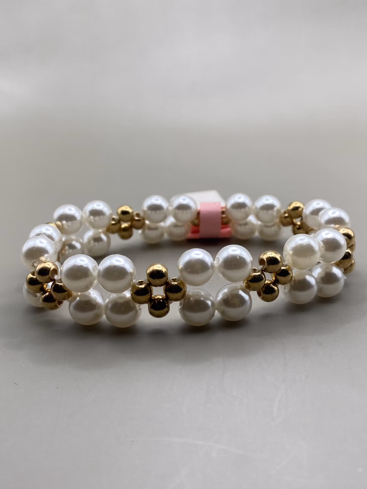 Fint vackert flerradigt armband i varvat mönster av benvita stora pärlor och guldfärgade mindre pärlor.