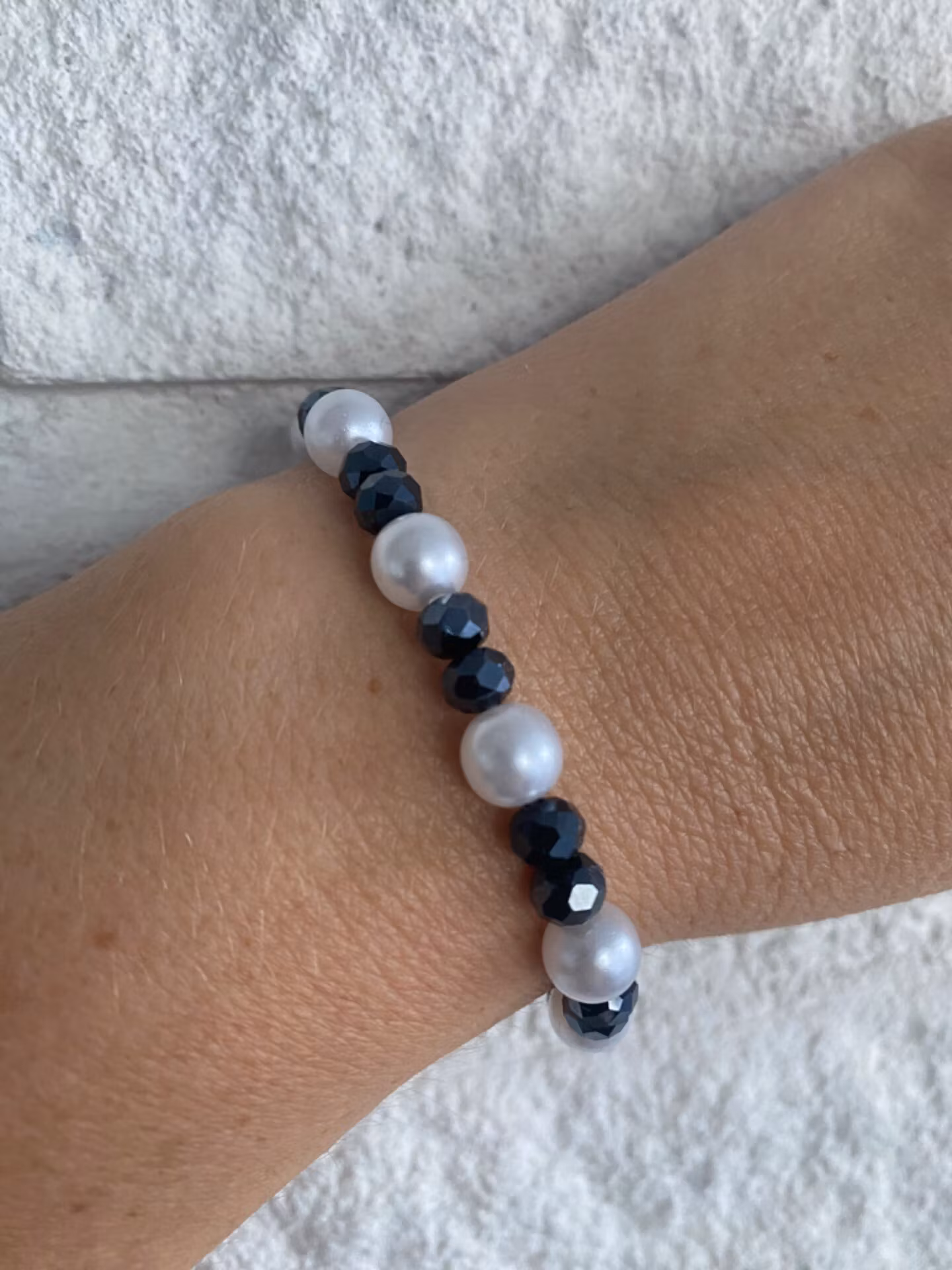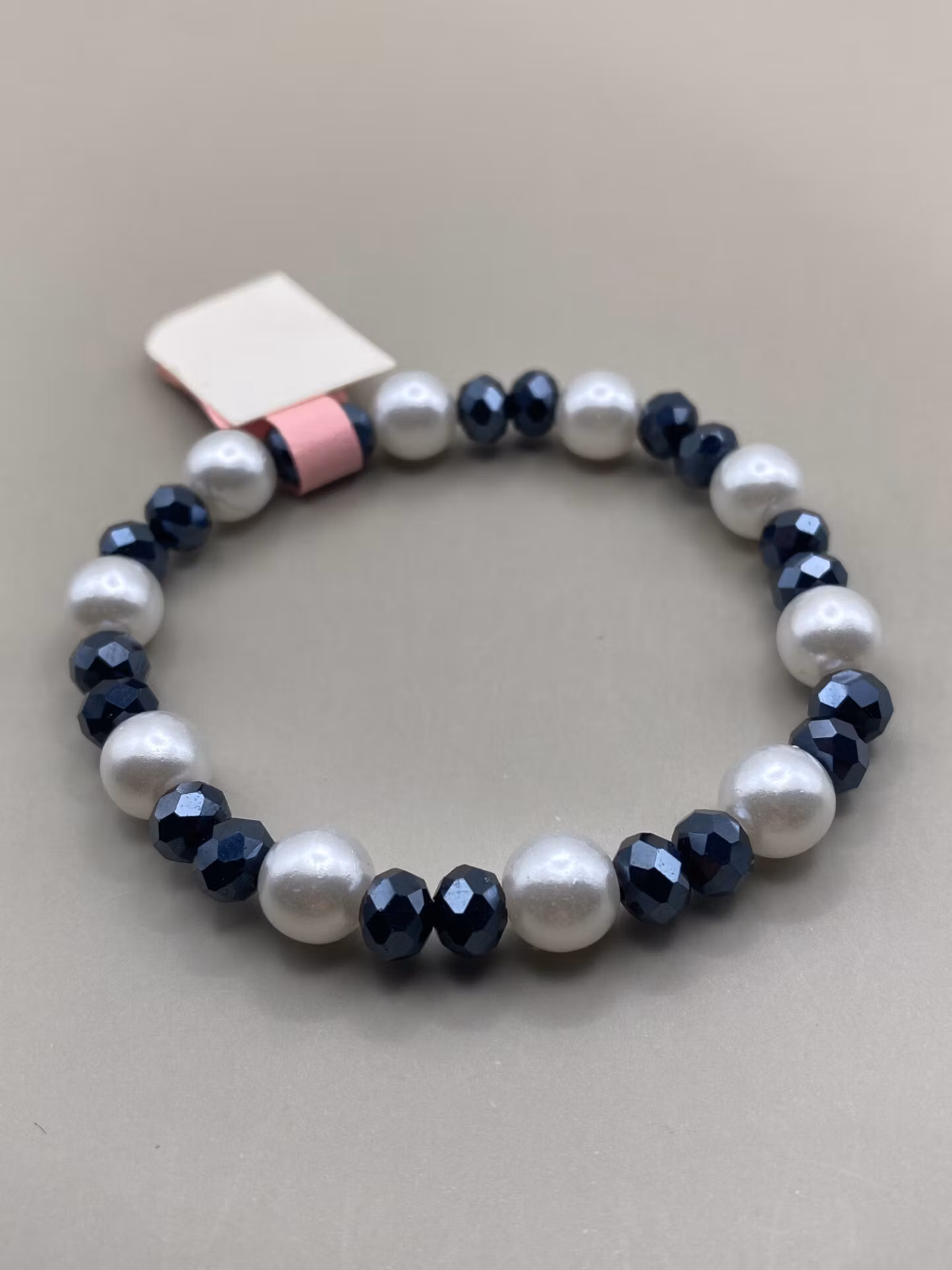 Armband i varvat mönster av vita pärlor och skimrande midnattsblå glaspärlor