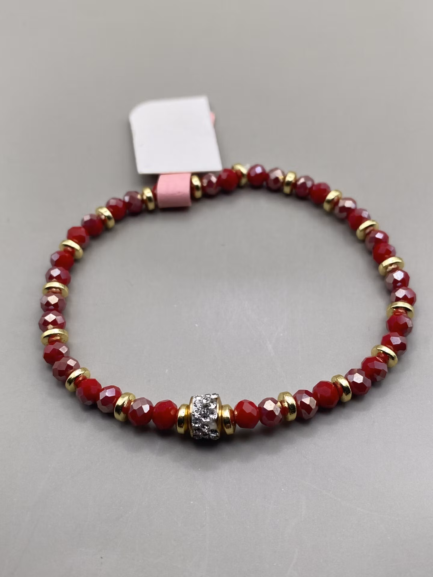 Snyggt stilrent armband i fint mönster av små klarröda skimrande glaspärlor och 18K guldfärgade hematit samt en strassdetalj i blickfånget.