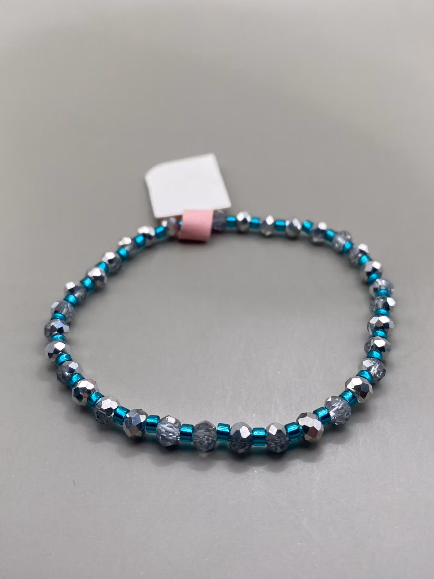 Snyggt skimrande arband i varvat ljust silvergrå färgade glaspärlor och turkosa miniglaspärlor.