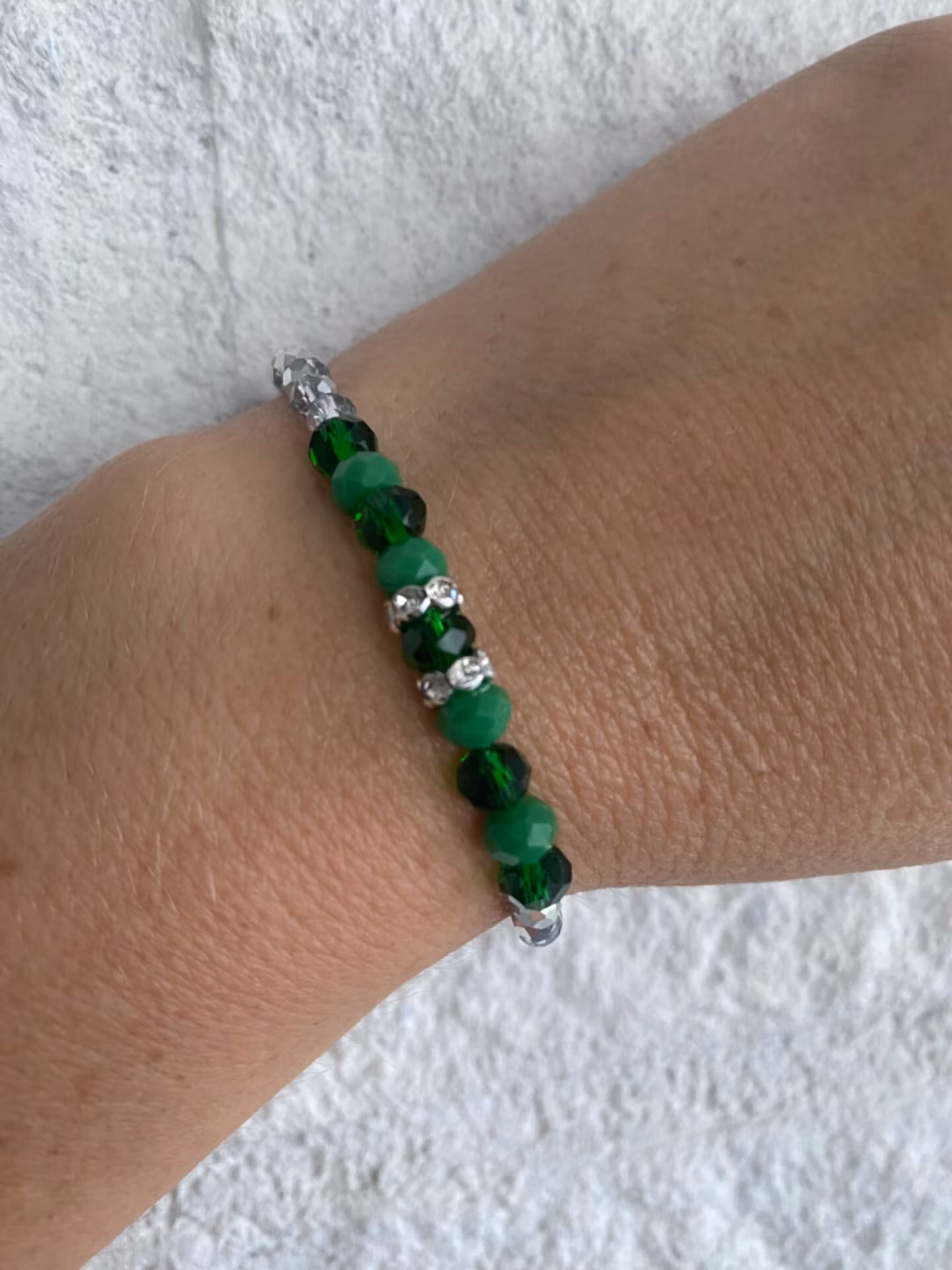 Snyggt stiligt armband i ljusgråsilverfärgade glaspärlor, varvat genomskinliga gröna glaspärlor med gröna helfärgade pärlor, silverfärgad strass i blickfånget. Perfekt komplement till den gröna dressen.