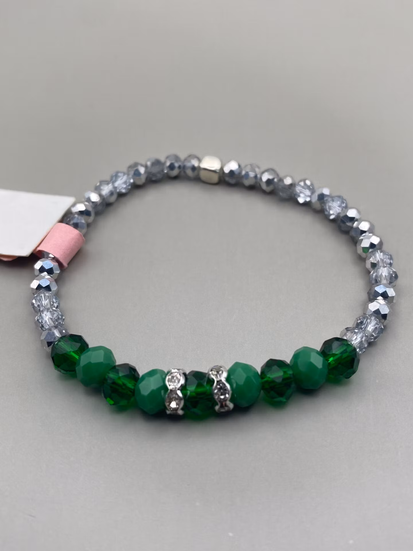 Snyggt stiligt armband i ljusgråsilverfärgade glaspärlor, varvat genomskinliga gröna glaspärlor med gröna helfärgade pärlor, silverfärgad strass i blickfånget.