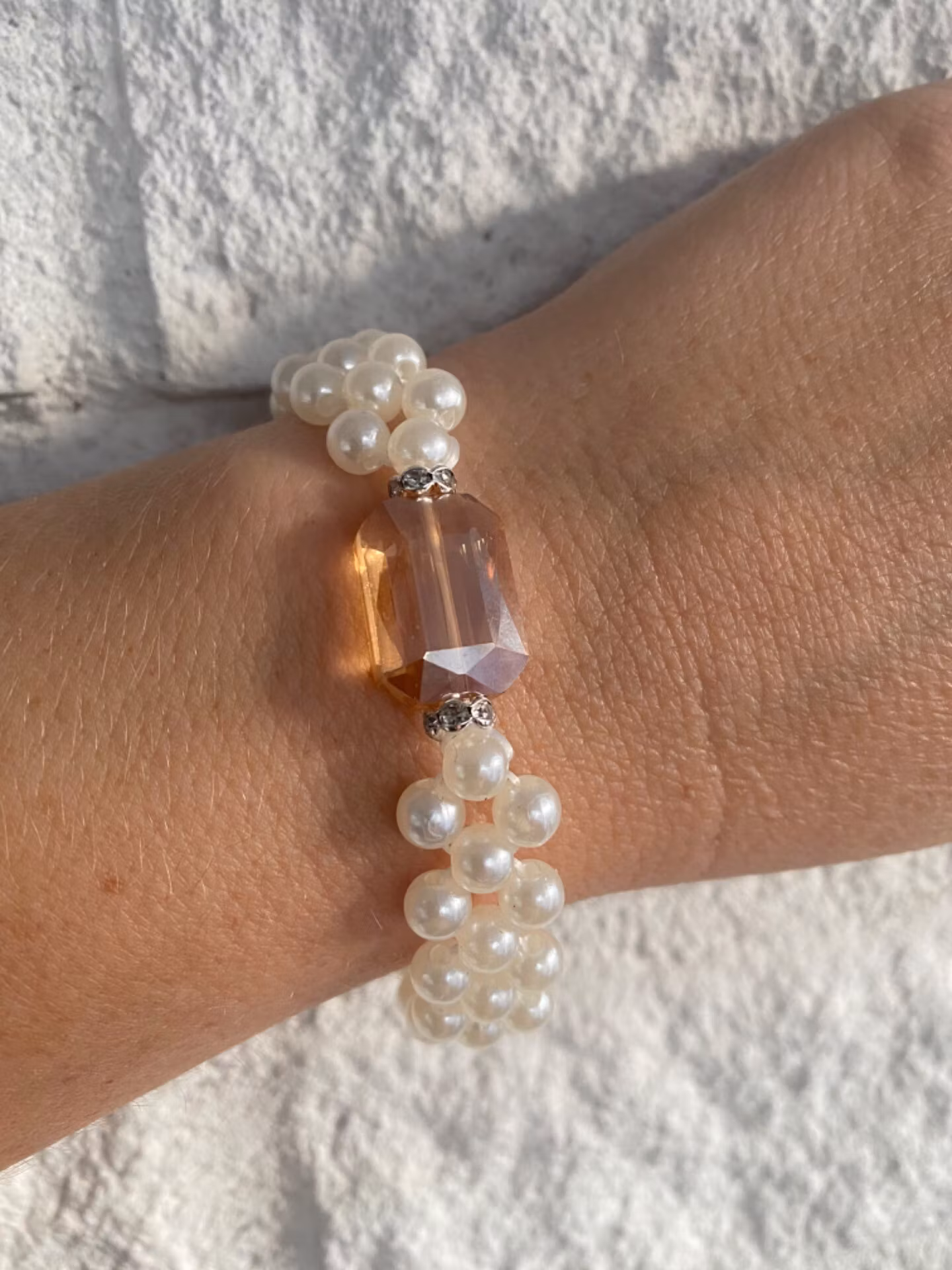 Stilren och vackert armband brett mönster av benvita glansiga pärlor, stor champagnefärgad glaspärla med strass på vardera sida i blickfånget