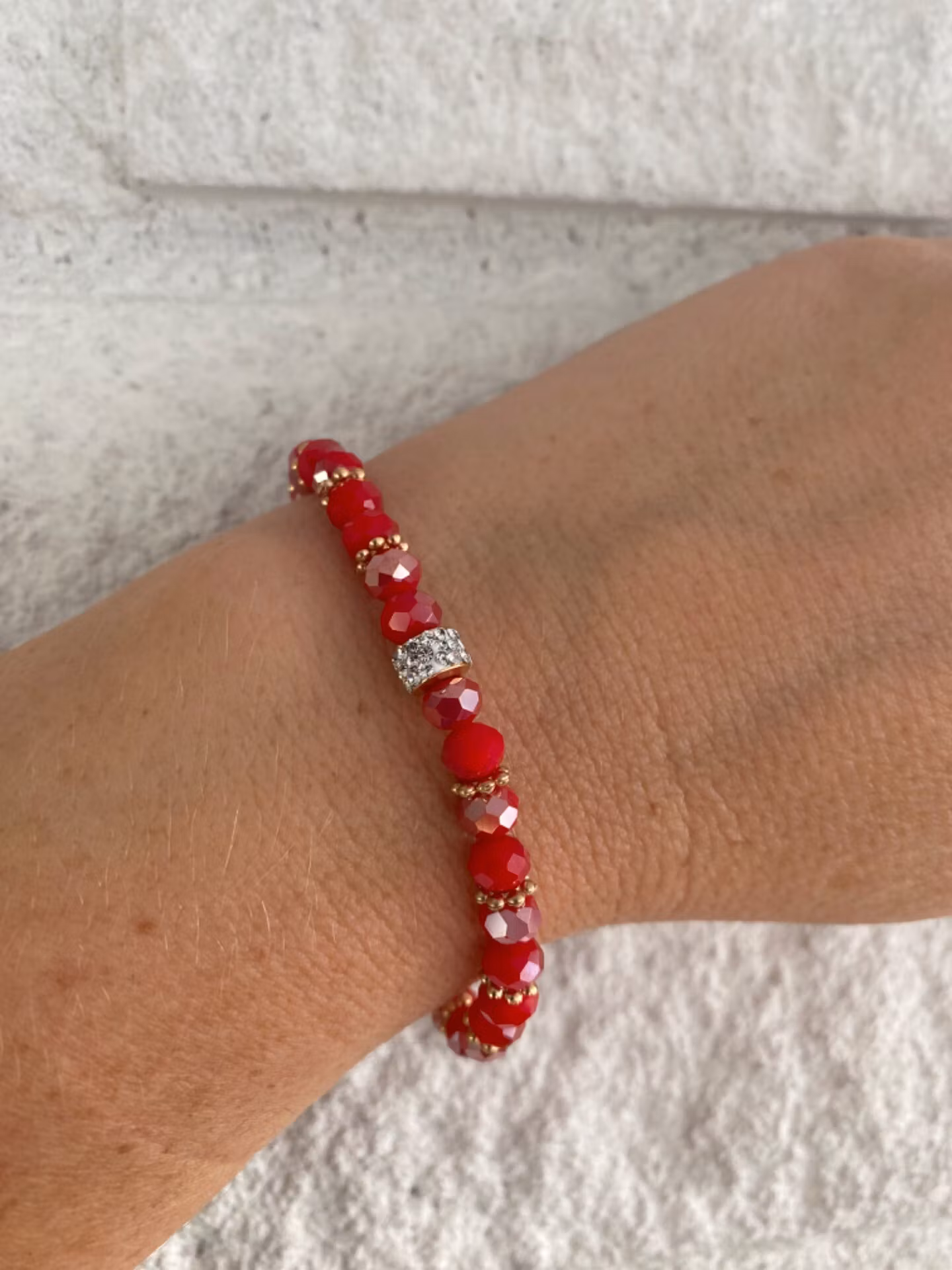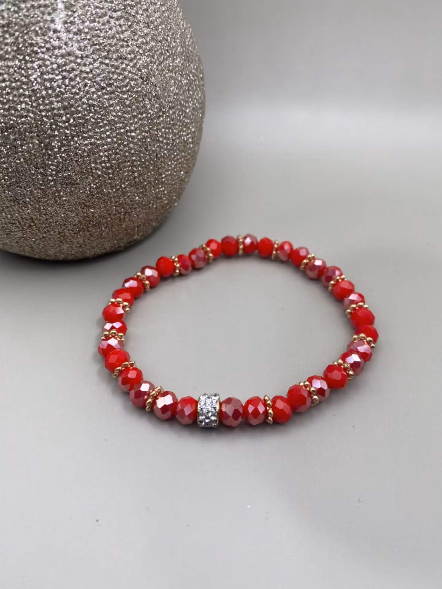 Vackert armband i julkänsla - rödskimrigt mellerade fasetterade glaspärlor varvat med guldfärgade distanser och strassdetalj i blickfånget
