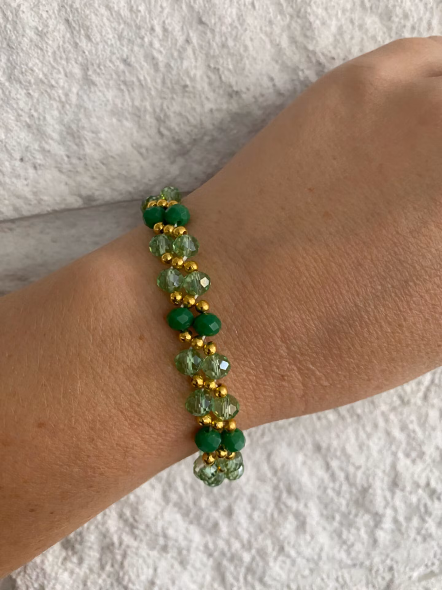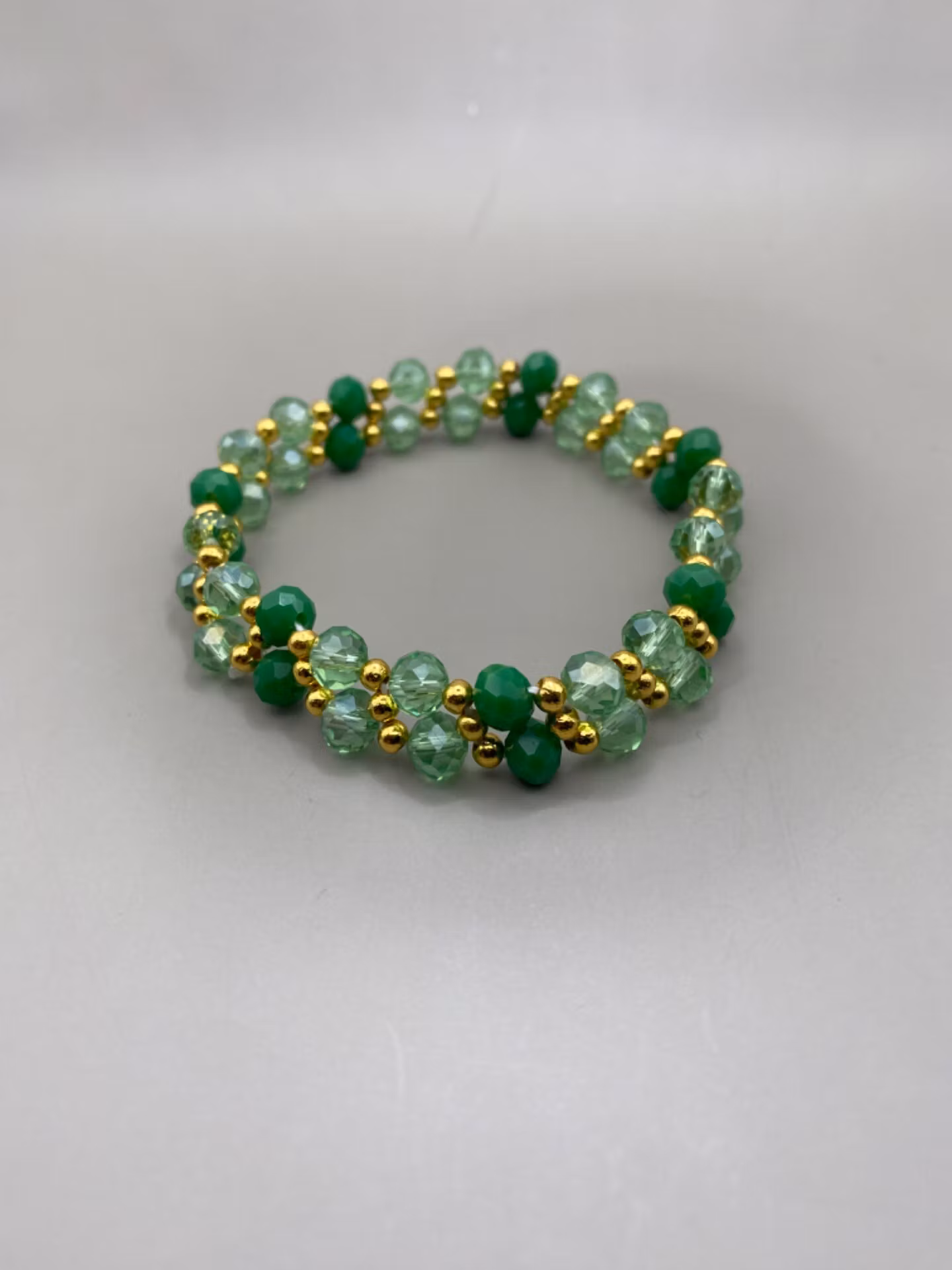 Vackert armband i tvåradigt mönster av gröna glaspärlor och genomskinliga ljusgröna glaspärlor varvat med guldfärgade små pärlor.