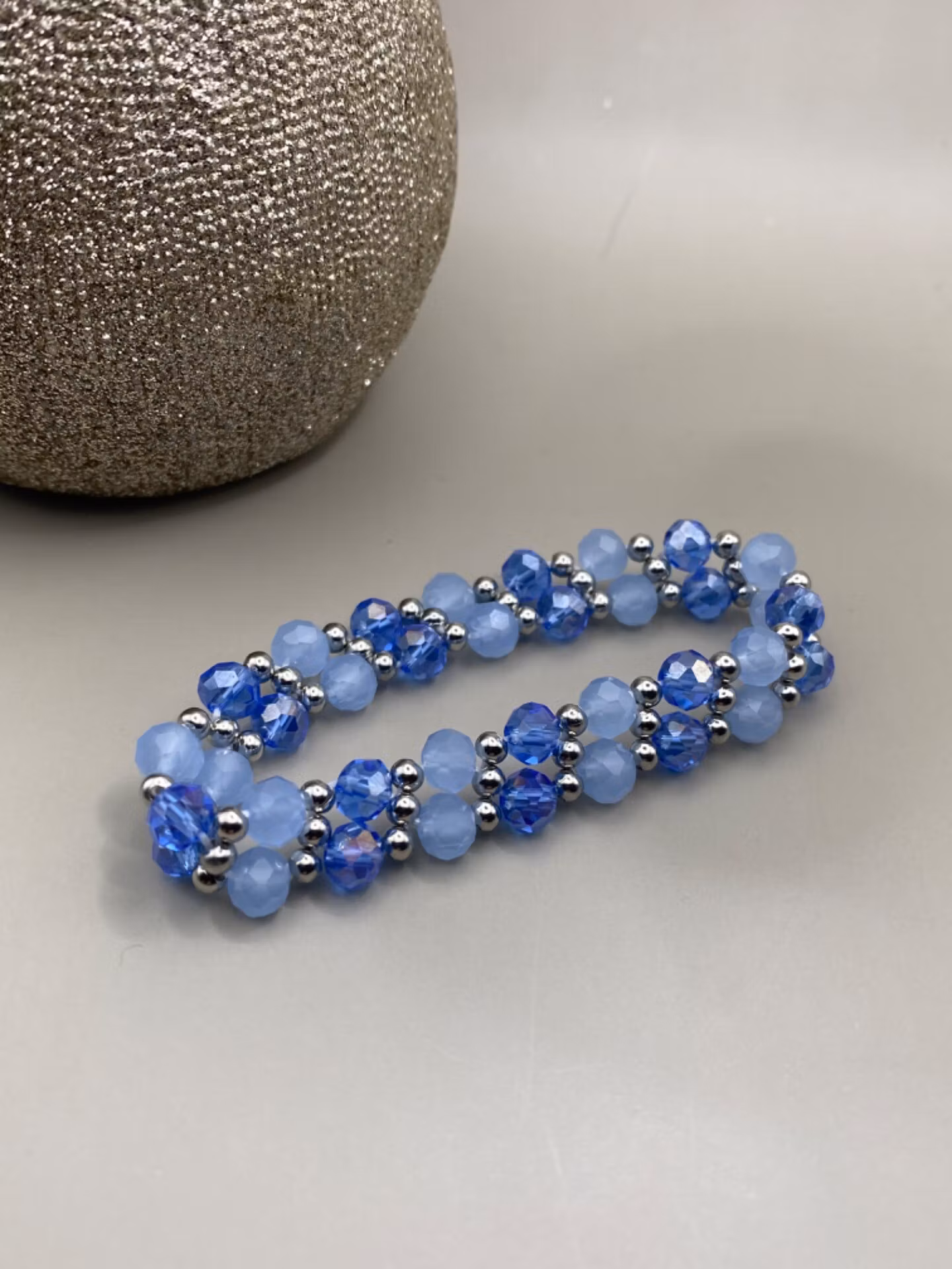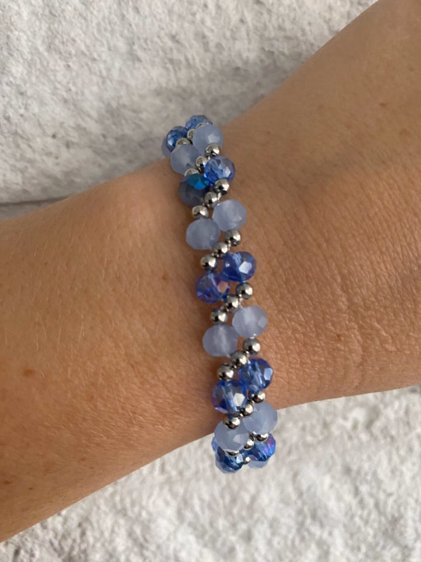 Vackert armband i tvåradigt mönster av fasetterade ljusblå glaspärlor och genomskinliga ljusblå glaspärlor varvat med silverfärgade små pärlor.Pärlor 6mm, 3mmVi