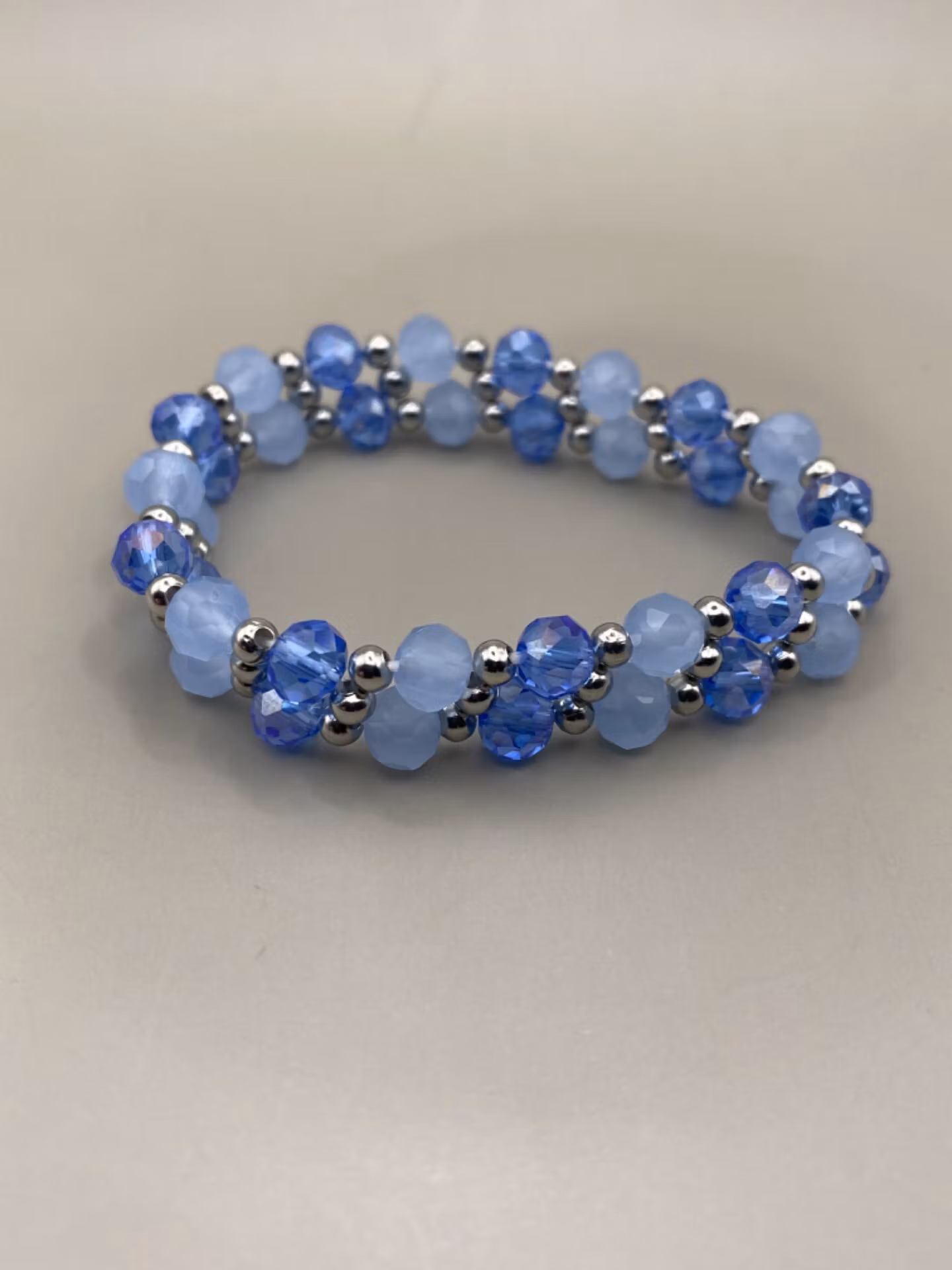 Vackert armband i tvåradigt mönster av fasetterade ljusblå glaspärlor och genomskinliga ljusblå glaspärlor varvat med silverfärgade små pärlor.