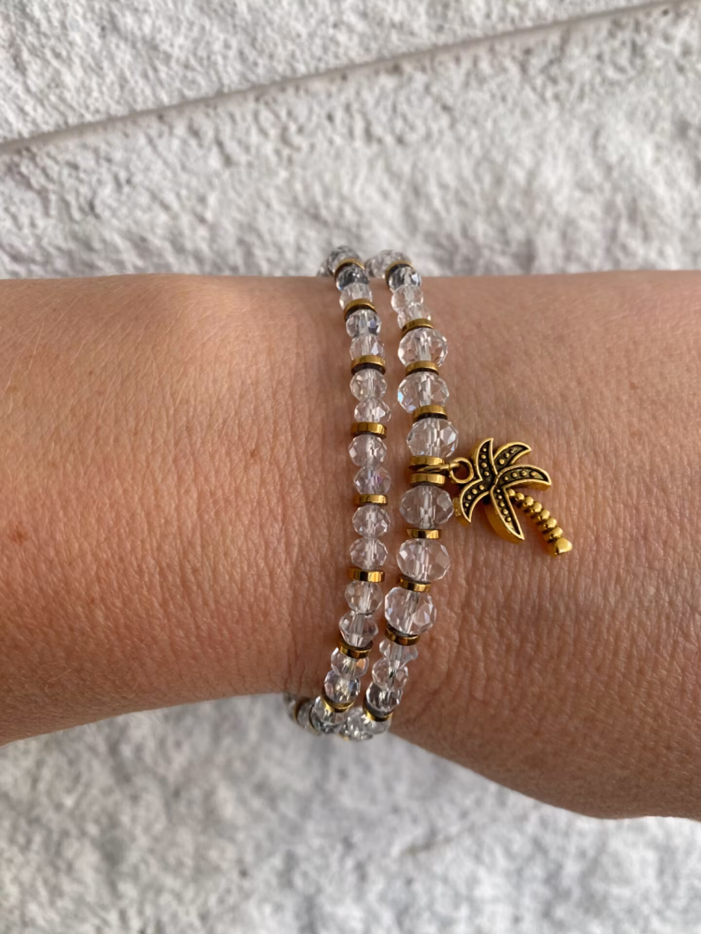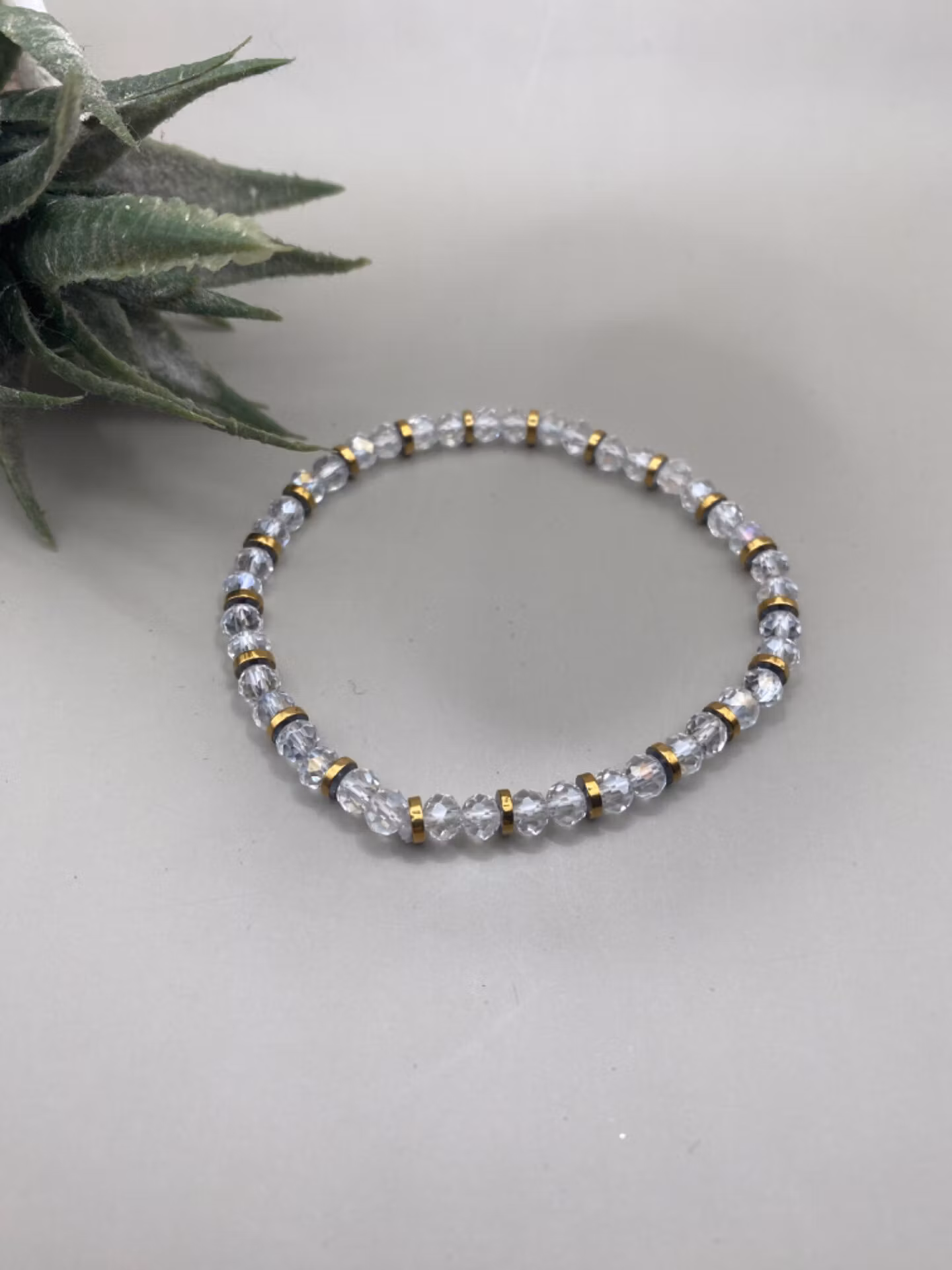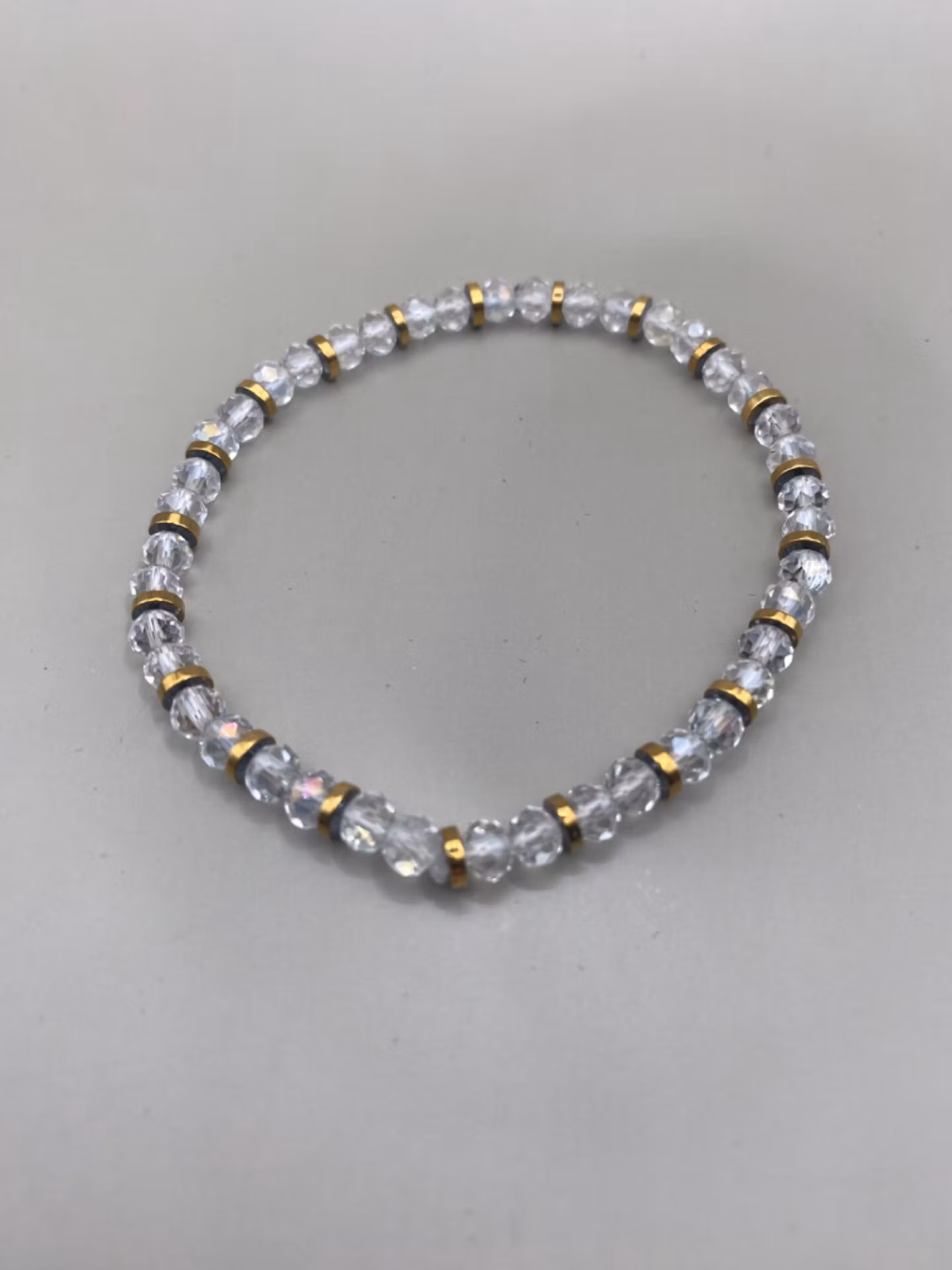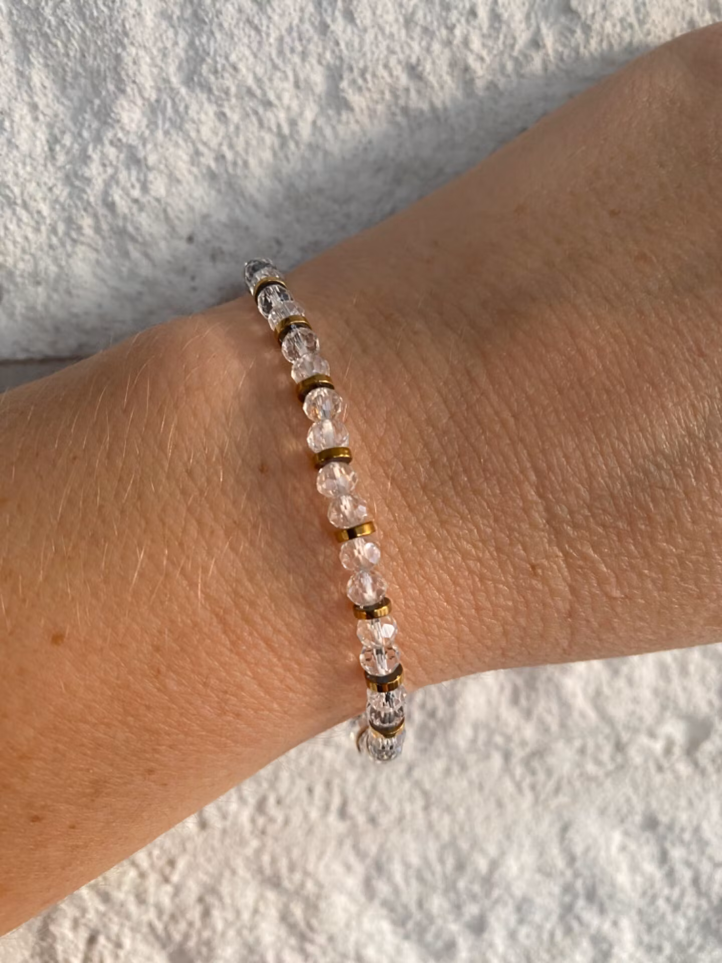 Vackert skimrande armband i varvat mönster av klara skimrande fasetterade glaspärlor varvat med stål-guldfärgade detaljer. Otroligt fint skimrande på handleden.