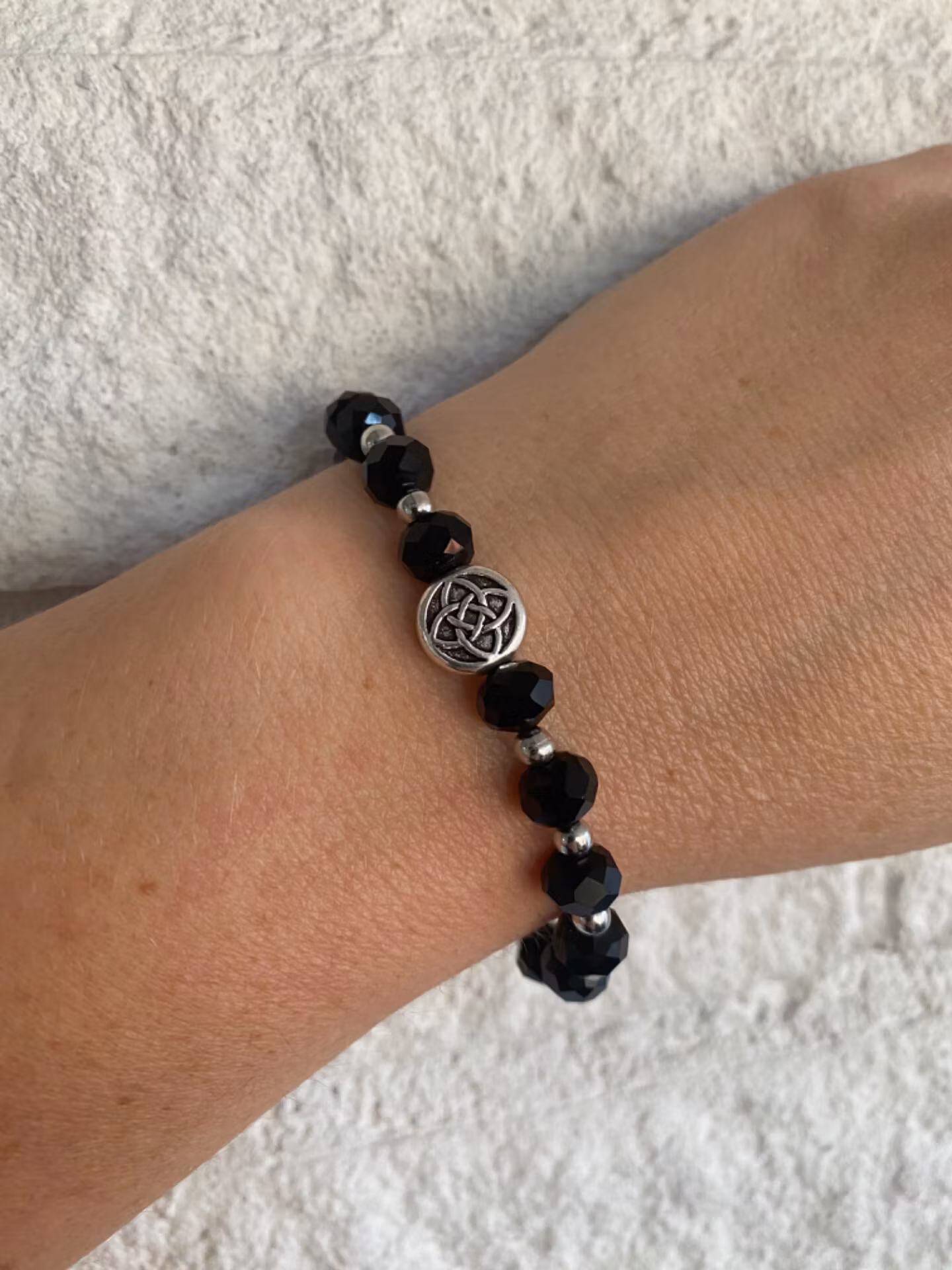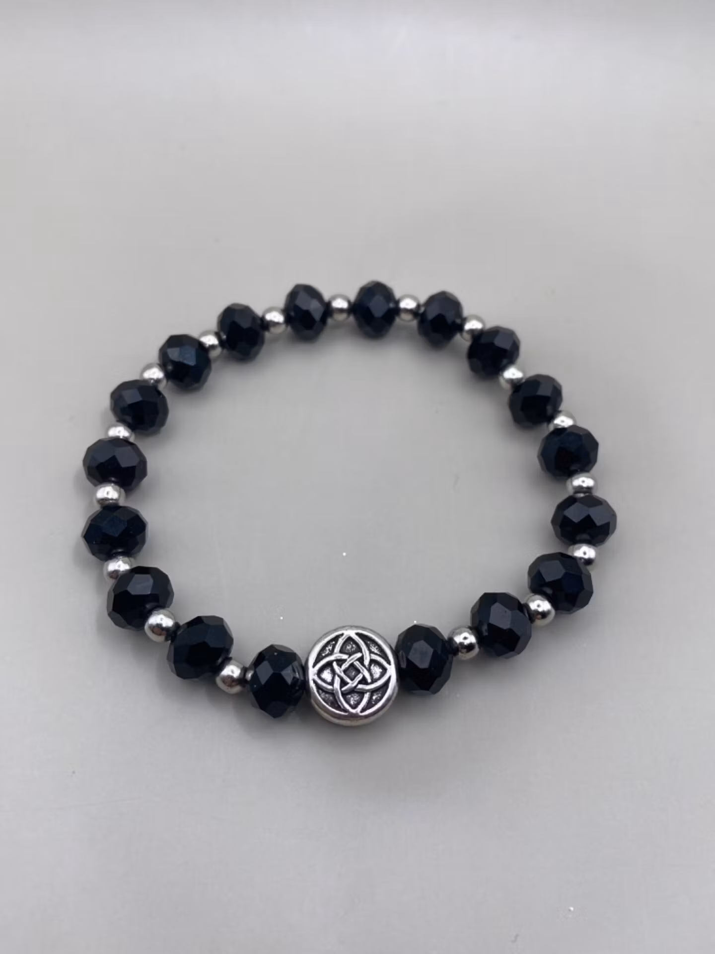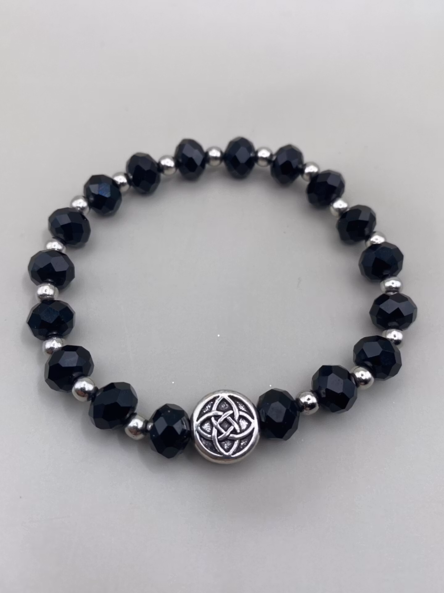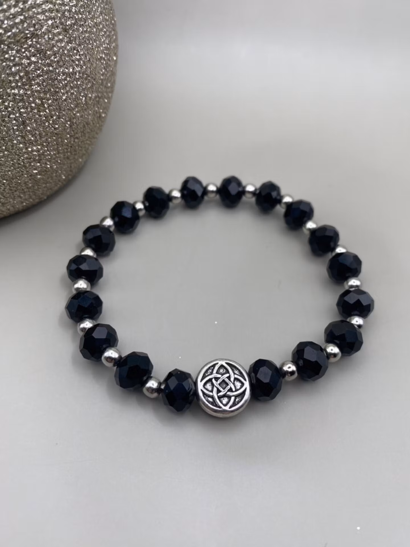 Vackert skimrande armband i varvat mönster av nattsvarta fasetterade stora glaspärlor varvat med silverfärgade pärlor. Vacker antiksilverfärgad rund berlock med mönster likt blomma i blickfånget. Otroligt fint skimrande på handleden.