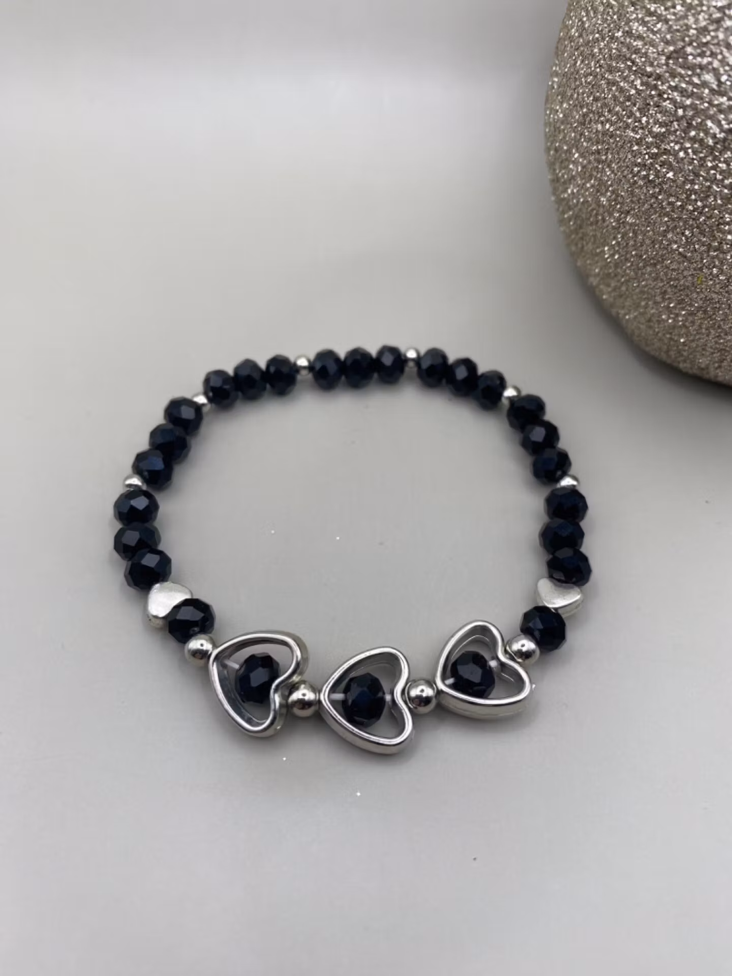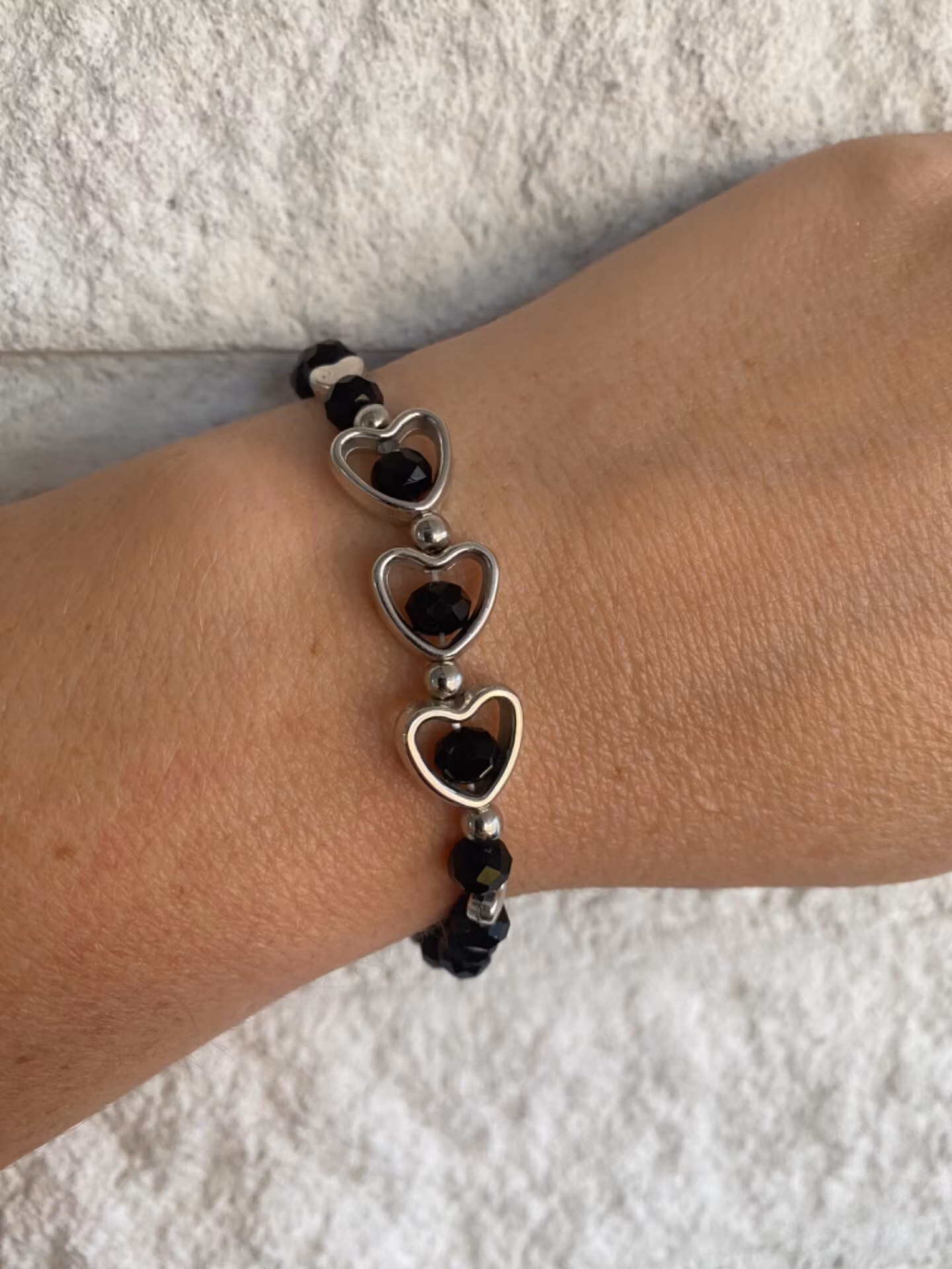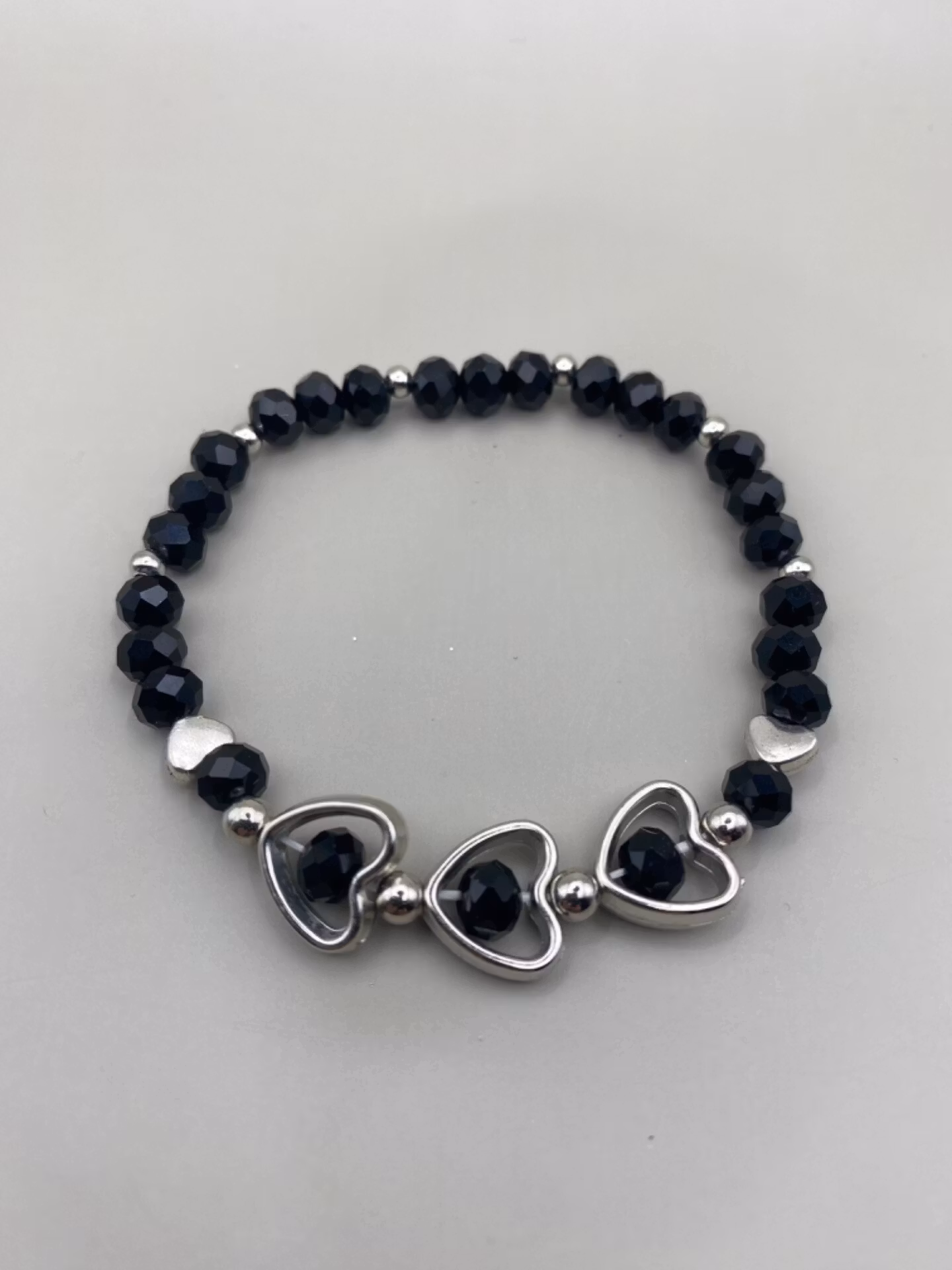 Vackert skimrande armband i varvat mönster av nattsvarta fasetterade mindre glaspärlor varvat med silverfärgade små pärlor och två små hjärtan. Tre silverfärgade hjärtformade höljen kring svarta pärlor i blickfånget. Otroligt fint skimrande på handleden.