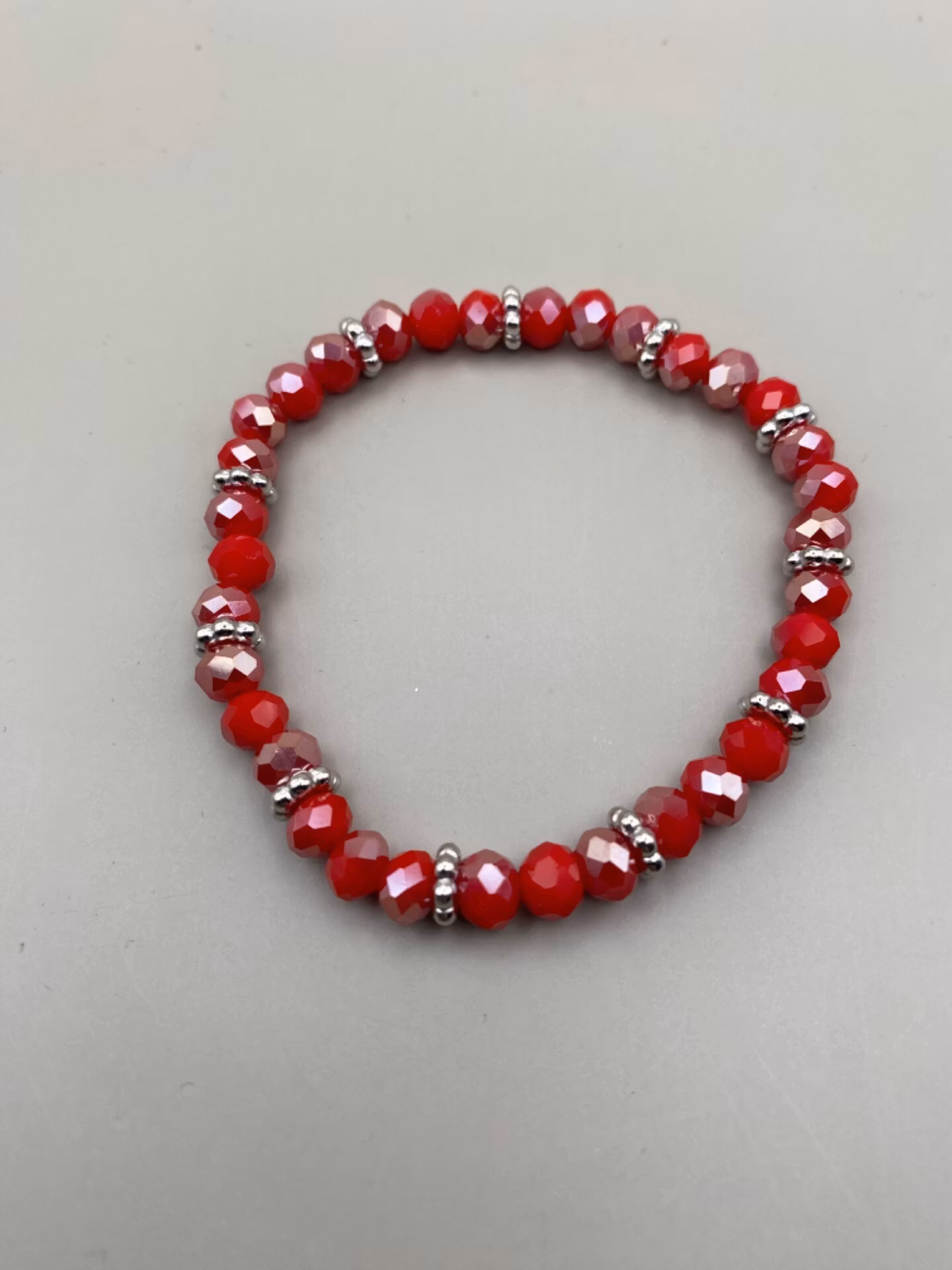 Vackert skimrande rött armband i rödmellerade fasetterade glaspärlor varvat med silverfärgade detaljer.Pärlor 6mmPassar perfekt i kombo med Luxury no.244*Visas