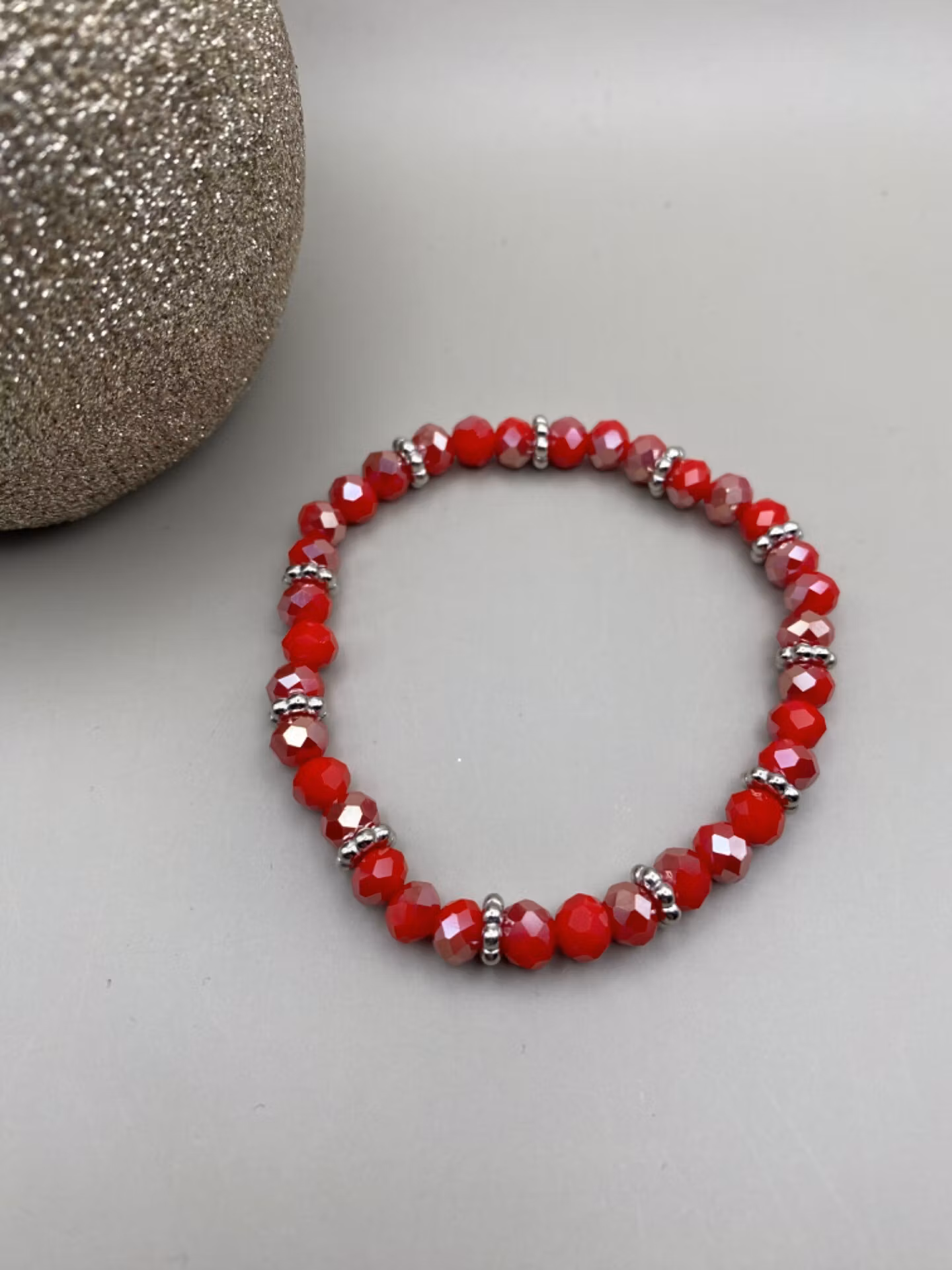 Vackert skimrande rött armband i rödmellerade fasetterade glaspärlor varvat med silverfärgade detaljer.