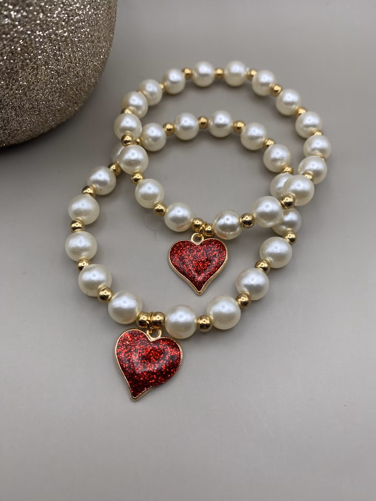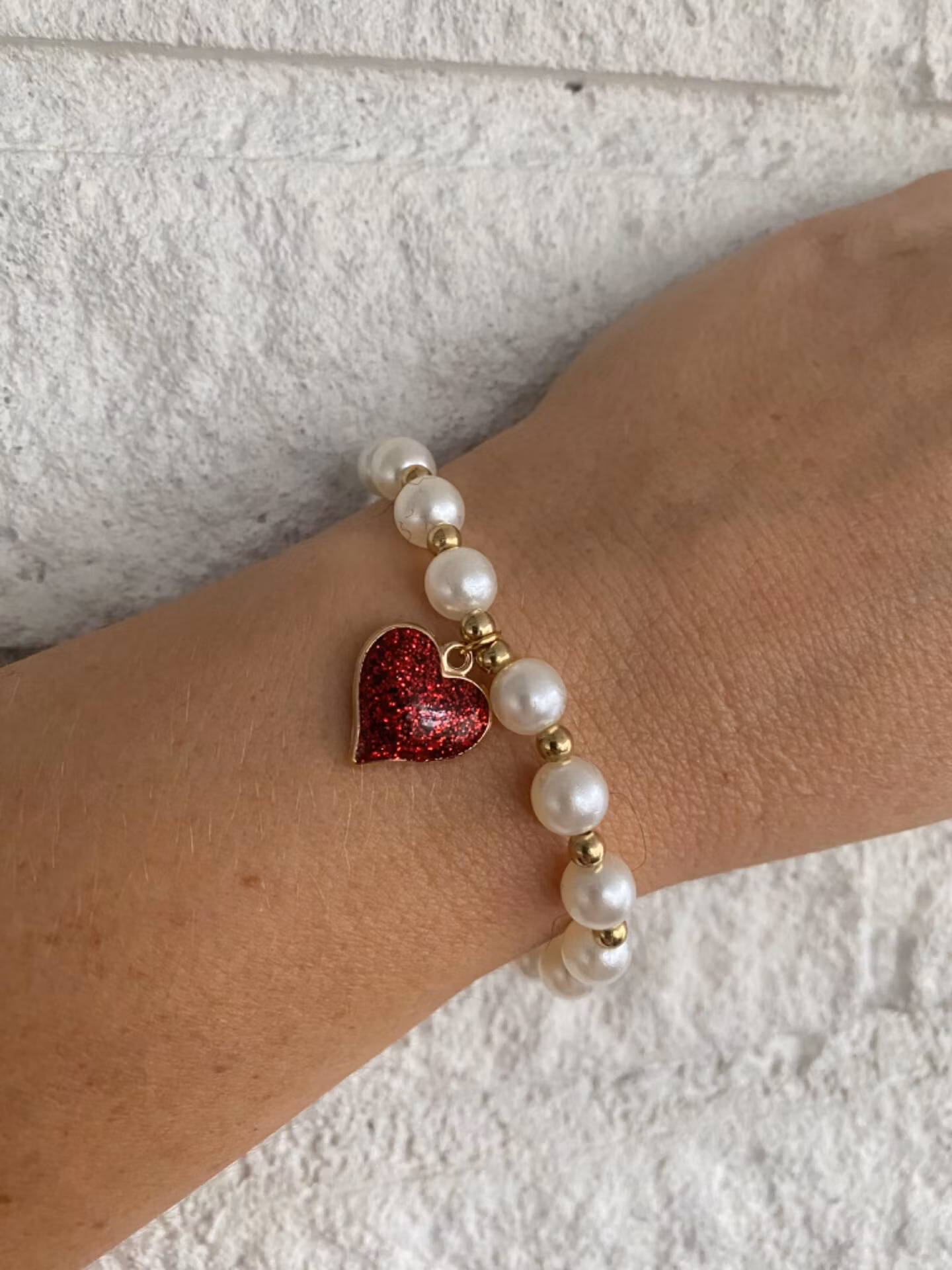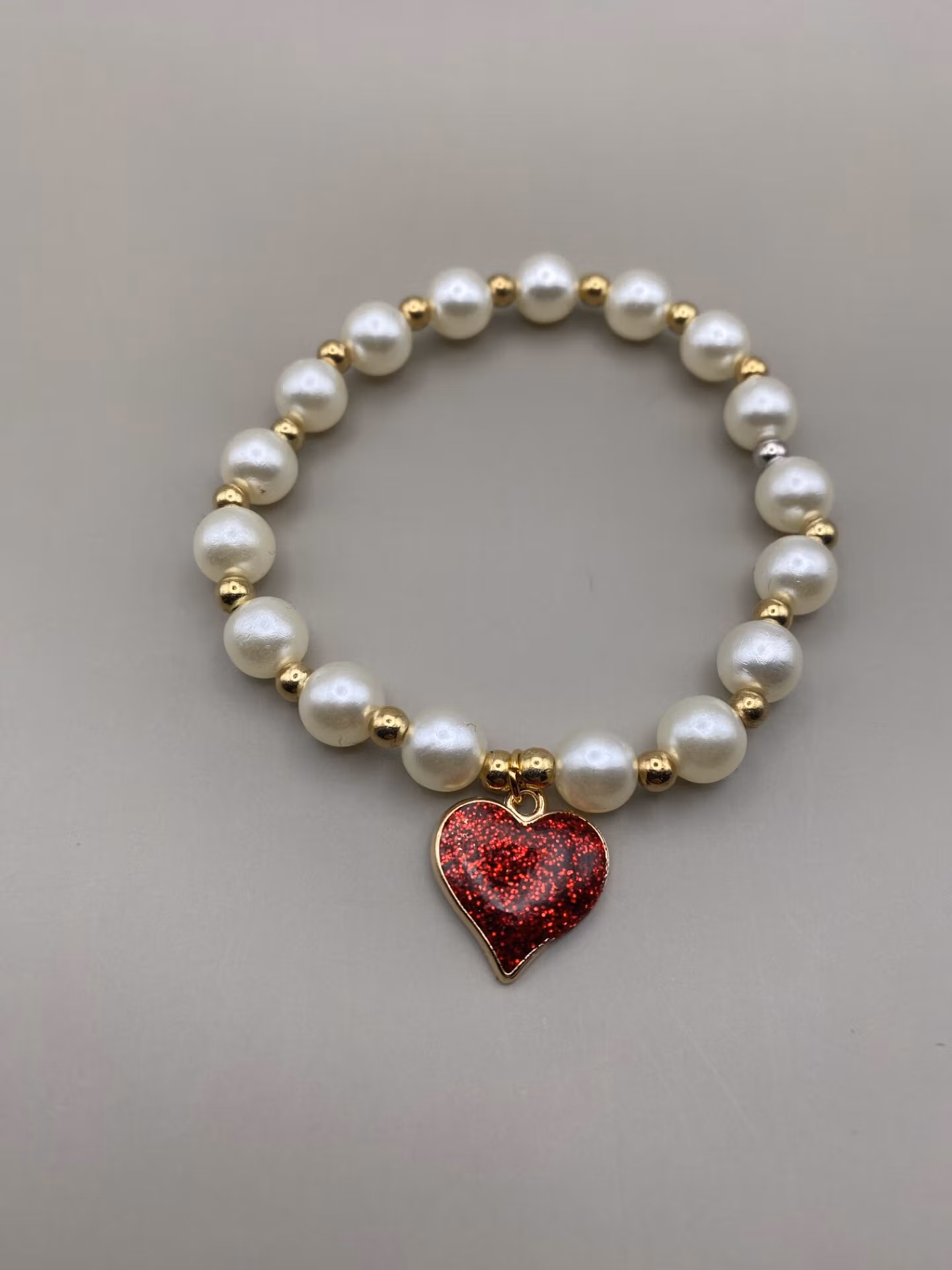 Vackert lyxigt skimrande armband av högblanka större vita pärlor varvat med små guldfärgade pärlor och vacker berlock i form av rött glittrigt glansigt hjärta i