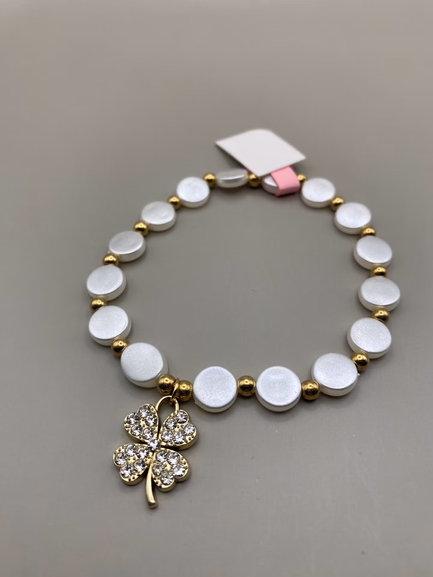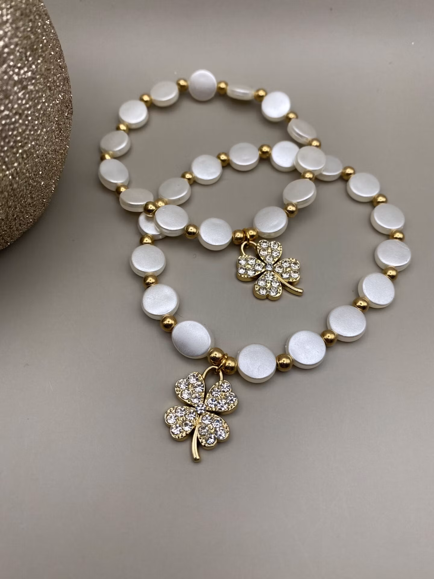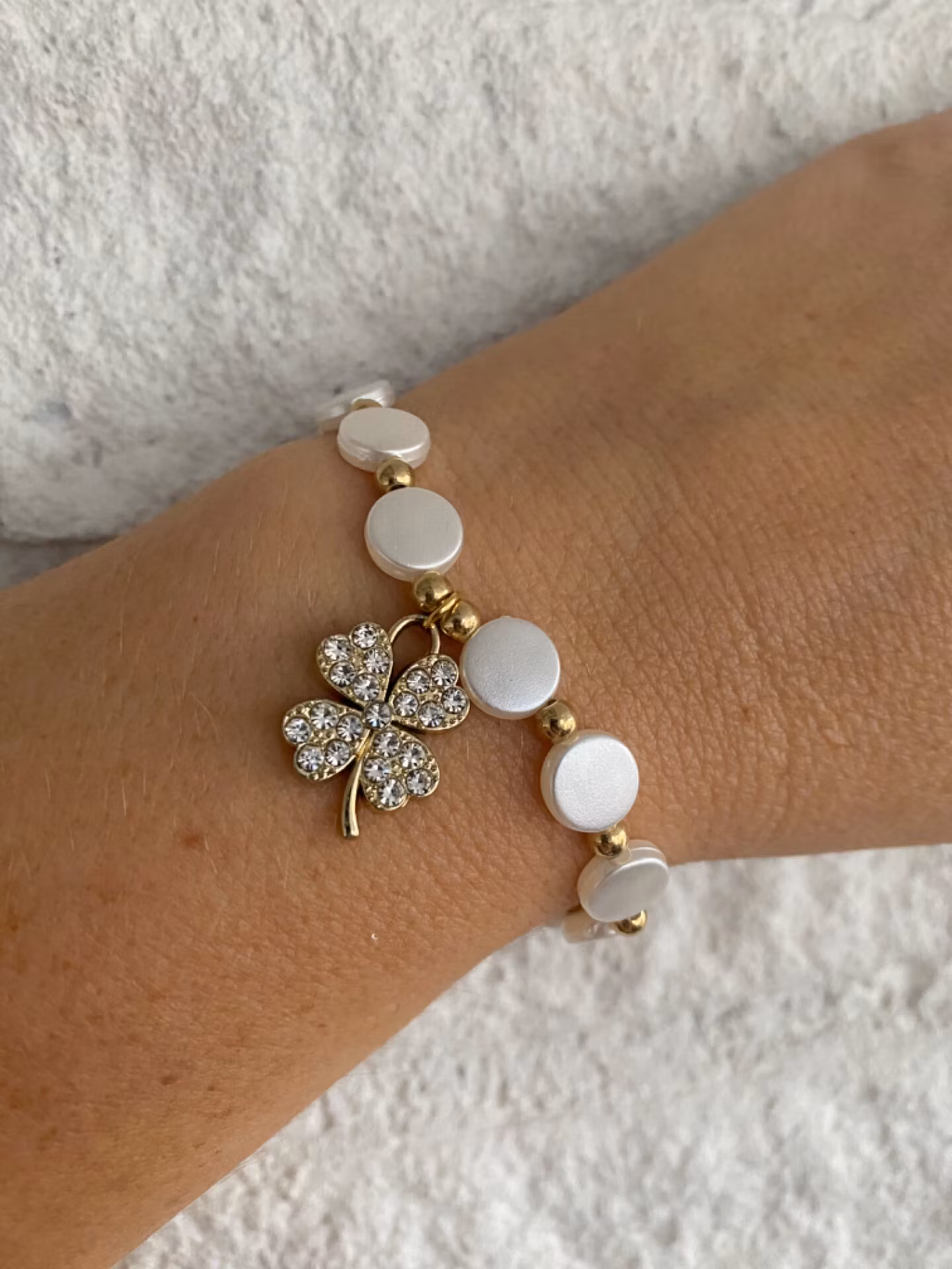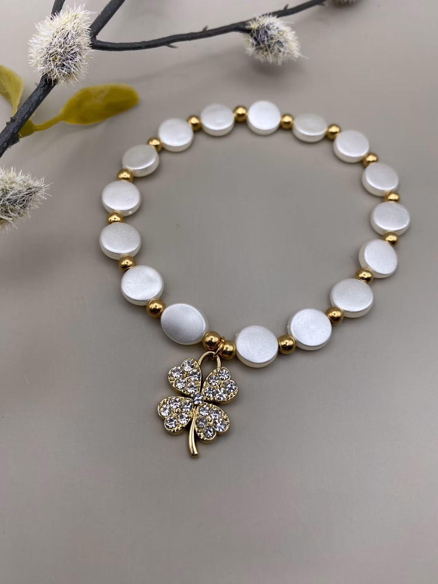 Vackert lyxigt skimrande armband av blanka platta större vita pärlor varvat med små guldfärgade pärlor och vacker berlock i form av guldfärgat fyrklöver med strass i blickfånget.