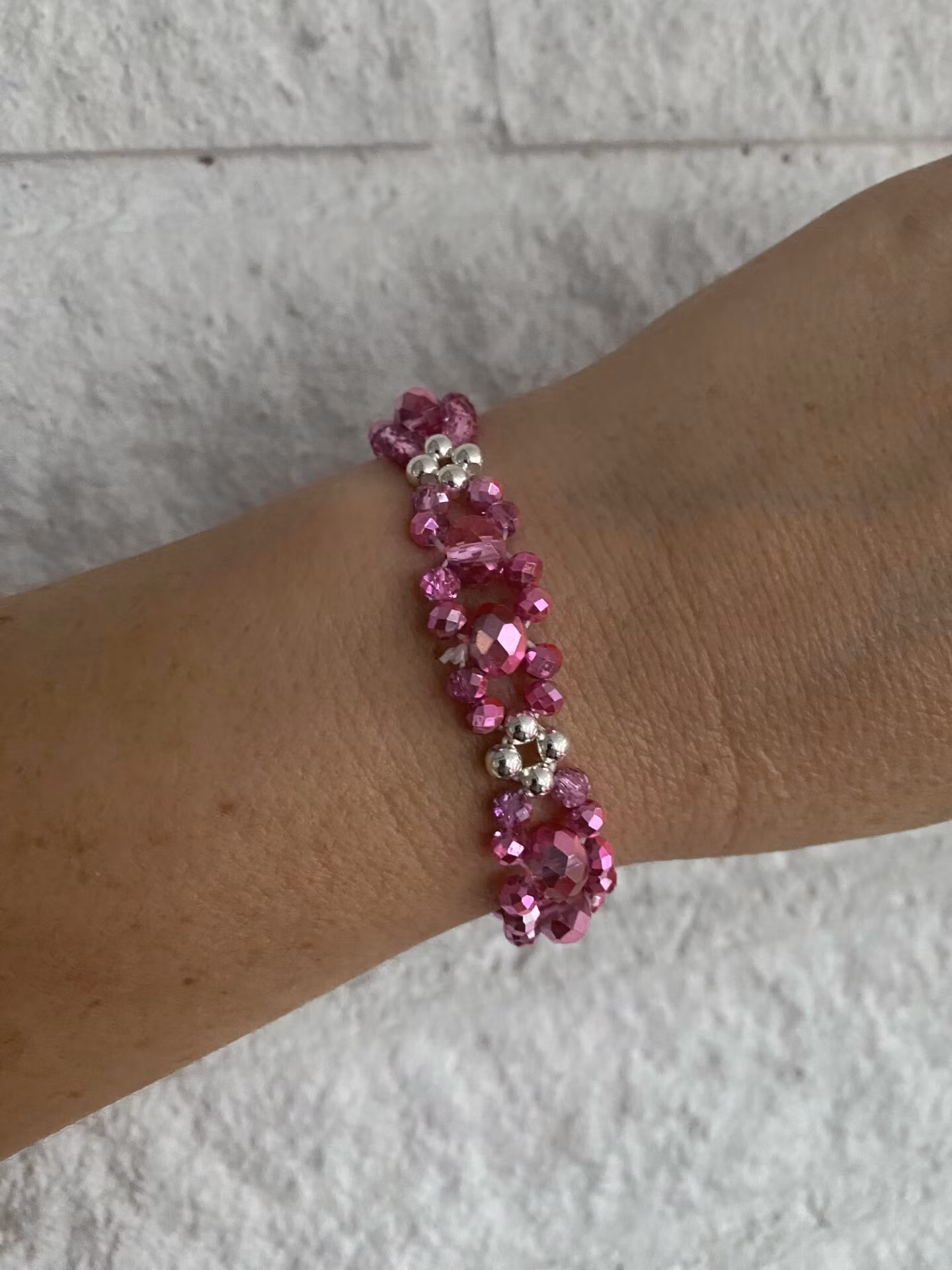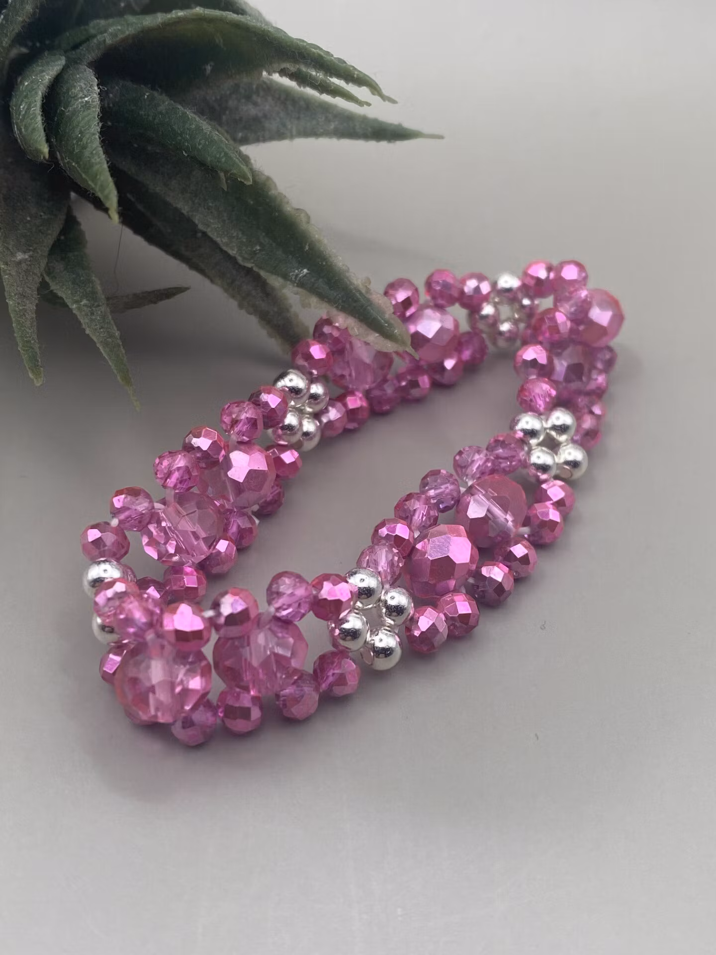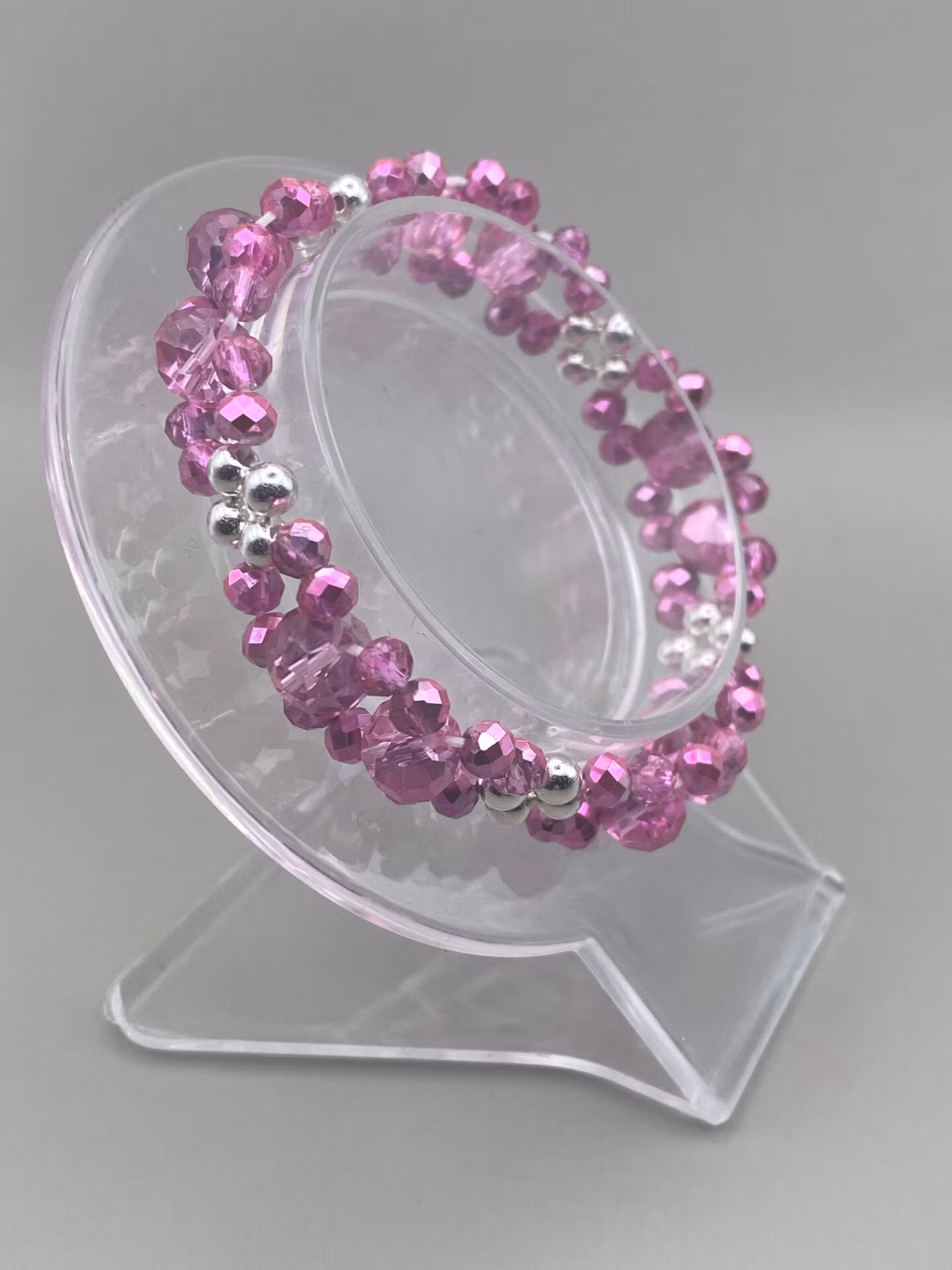 Vackert skimrande treradigt armband av skimrande rosamellerade fasetterade glaspärlor i olika stolekar samt små silverfärgade pärlor