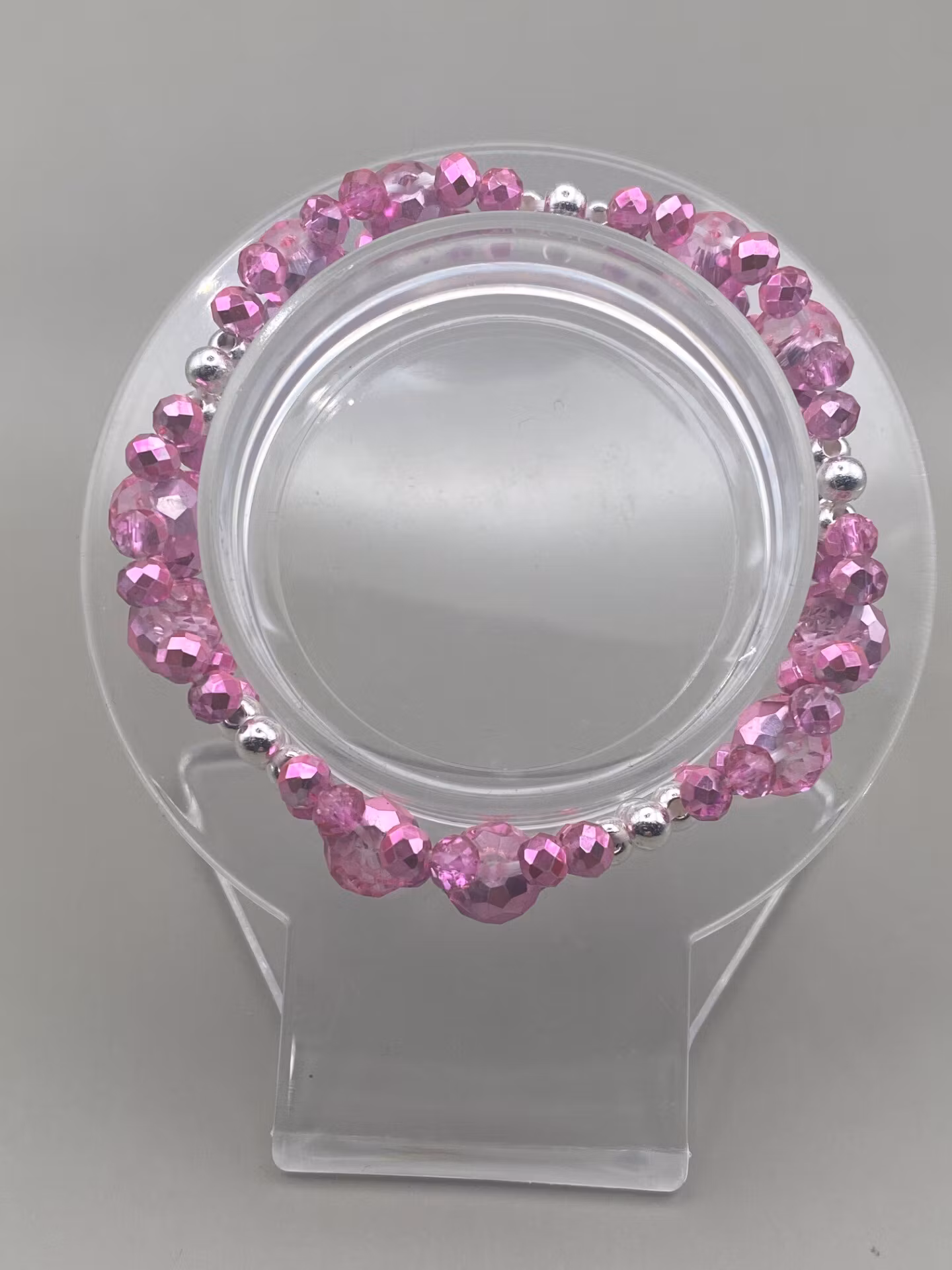 Vackert skimrande treradigt armband av skimrande rosamellerade fasetterade glaspärlor i olika stolekar samt små silverfärgade pärlorPärlor 8mm, 4mm, 3mmVisas pr