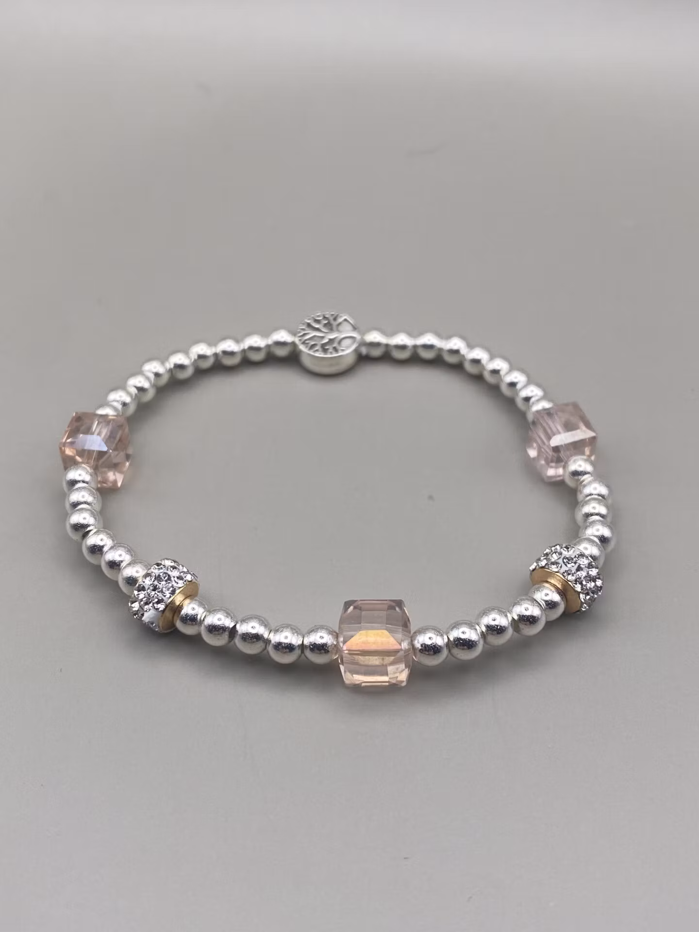 Vackert avskalat armband i silverfärgade små pärlor varvat med tre fyrkantiga svagt rosa glaspärlor och två strasspärlor. (finns även som deluxe-modell med spän
