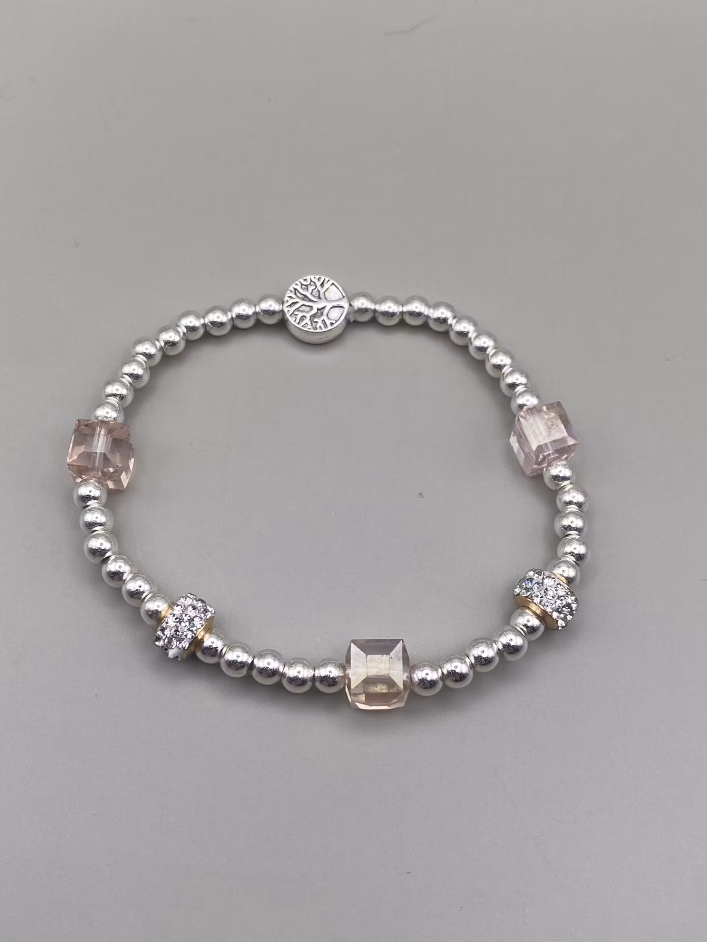Vackert avskalat armband i silverfärgade små pärlor varvat med tre fyrkantiga svagt rosa glaspärlor och två strasspärlor. (finns även som deluxe-modell med spänne)