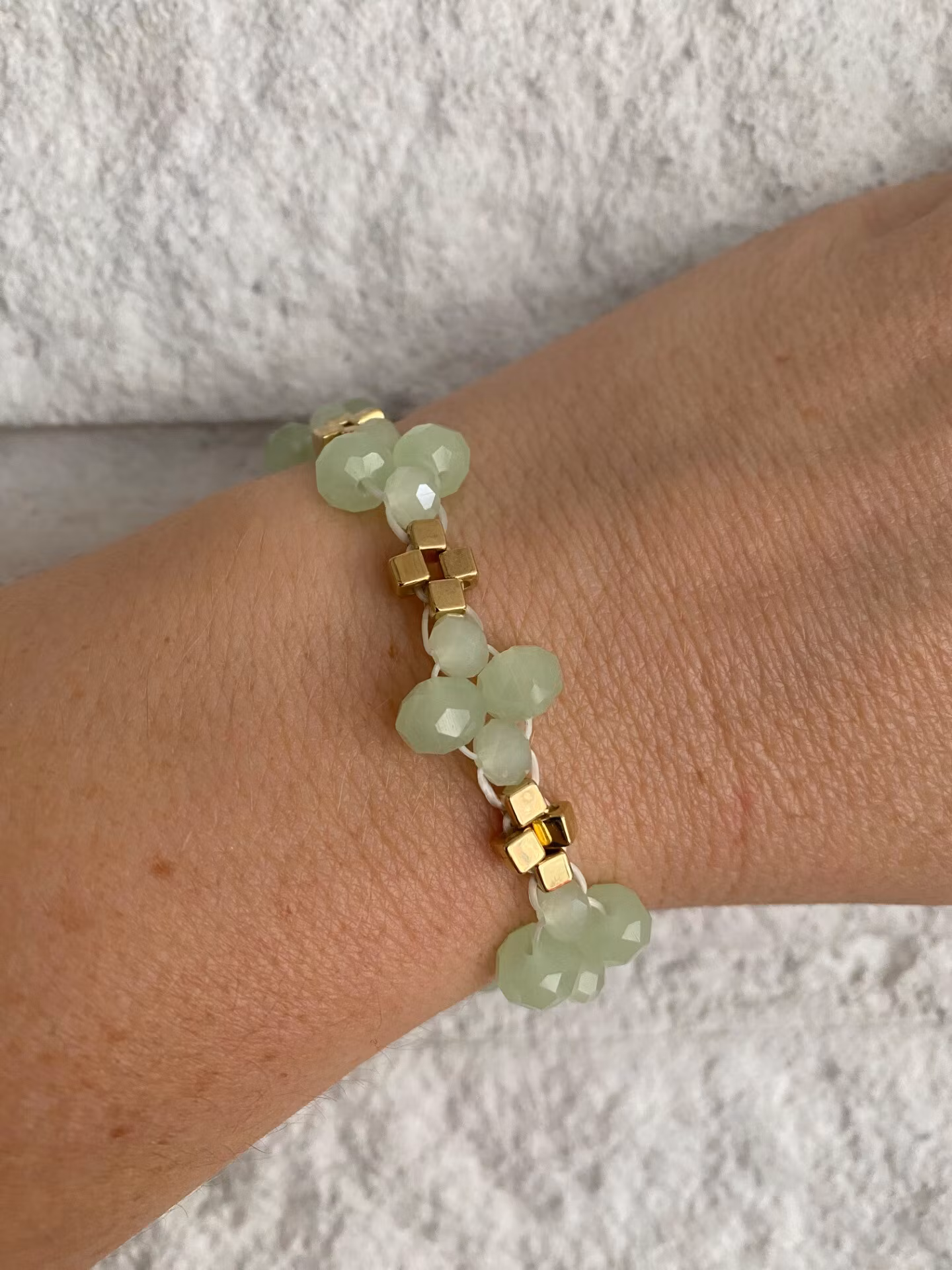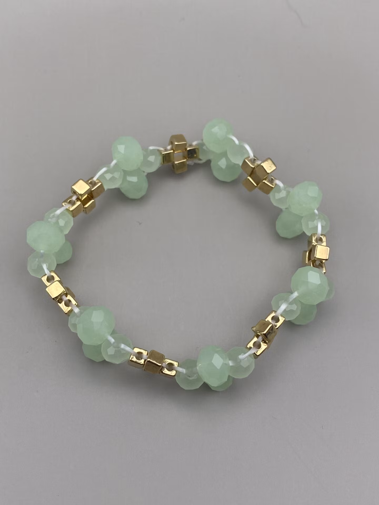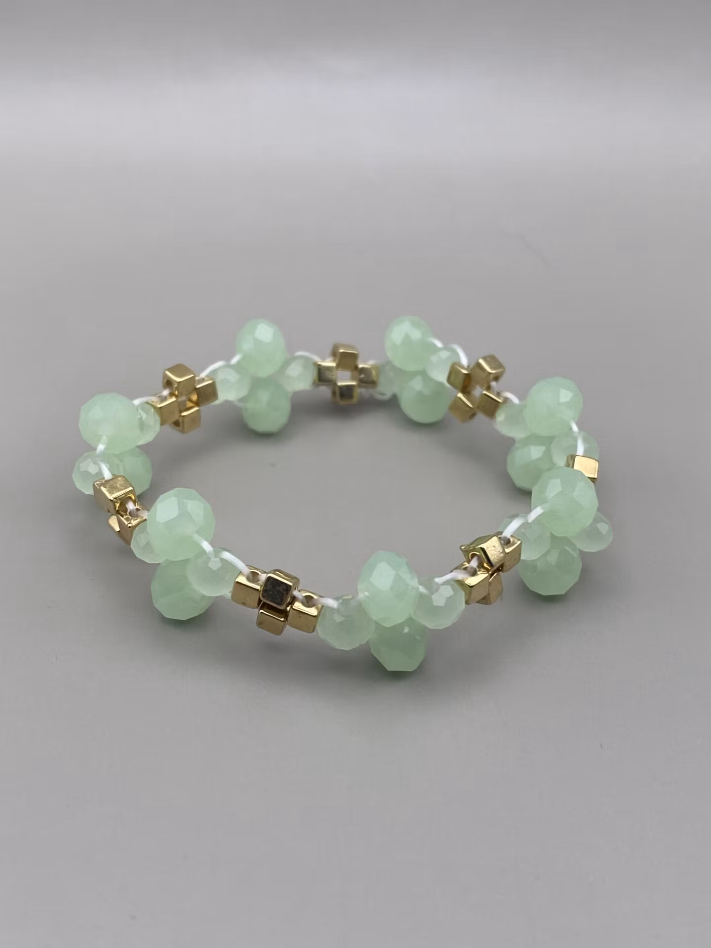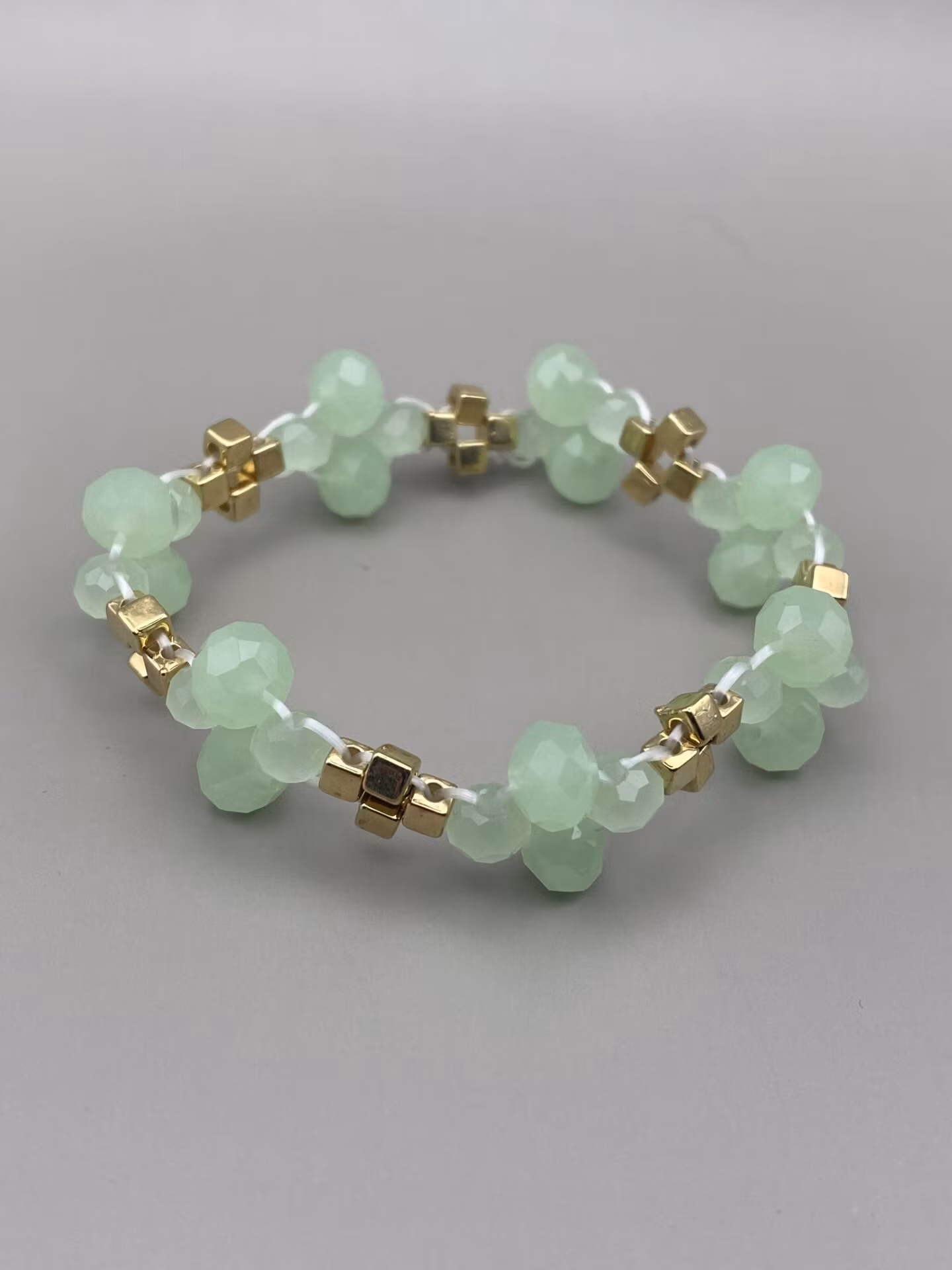 Fint armband i tvåradigt mönster av ljusgröna fasetterade dimmiga glaspärlor och fyrkantiga guldfärgade pärlor.