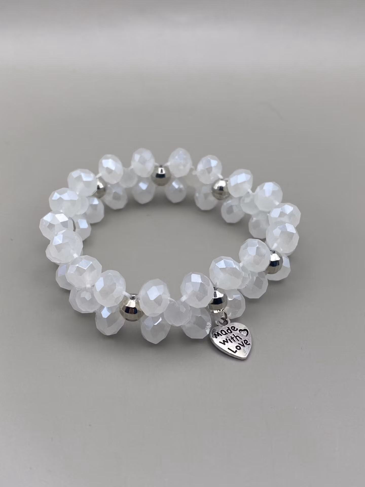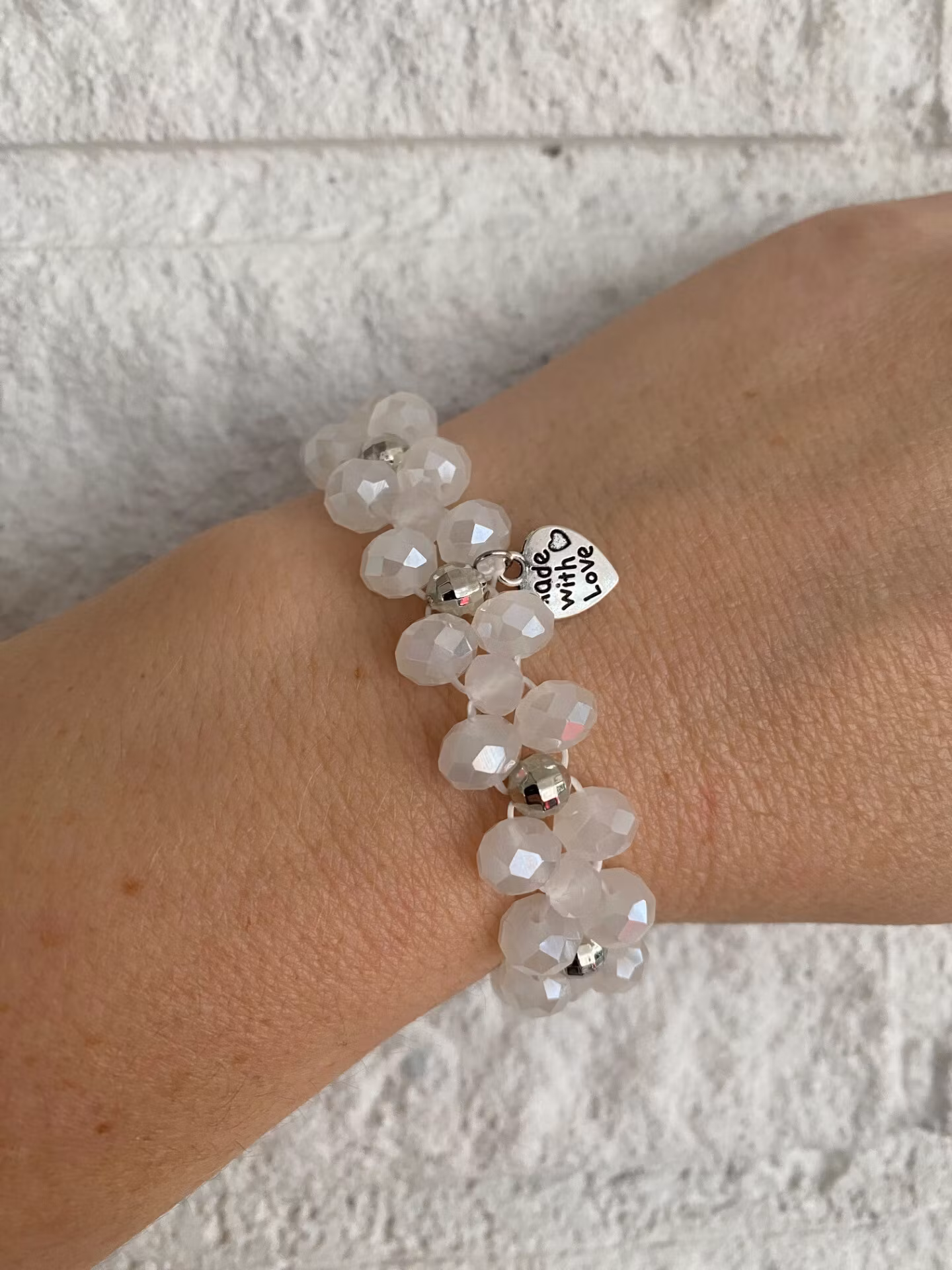 Fint armband i treradigt mönster av glansigt vita frostade fasetterade glaspärlor och silverfärgade discopärlor och fin berlock i blickfånget.