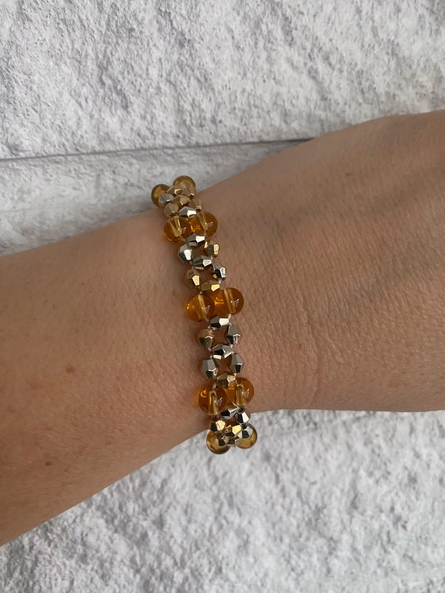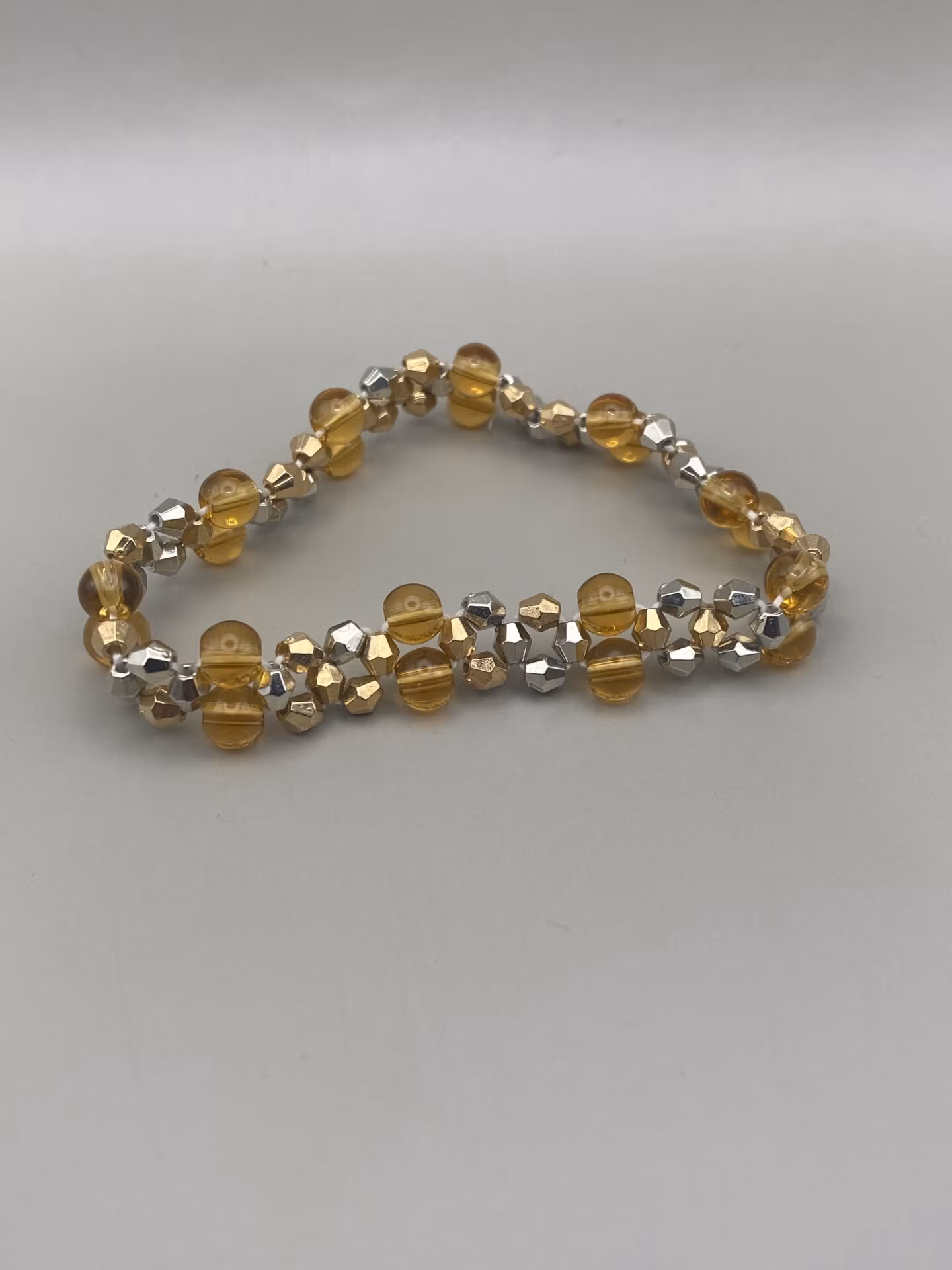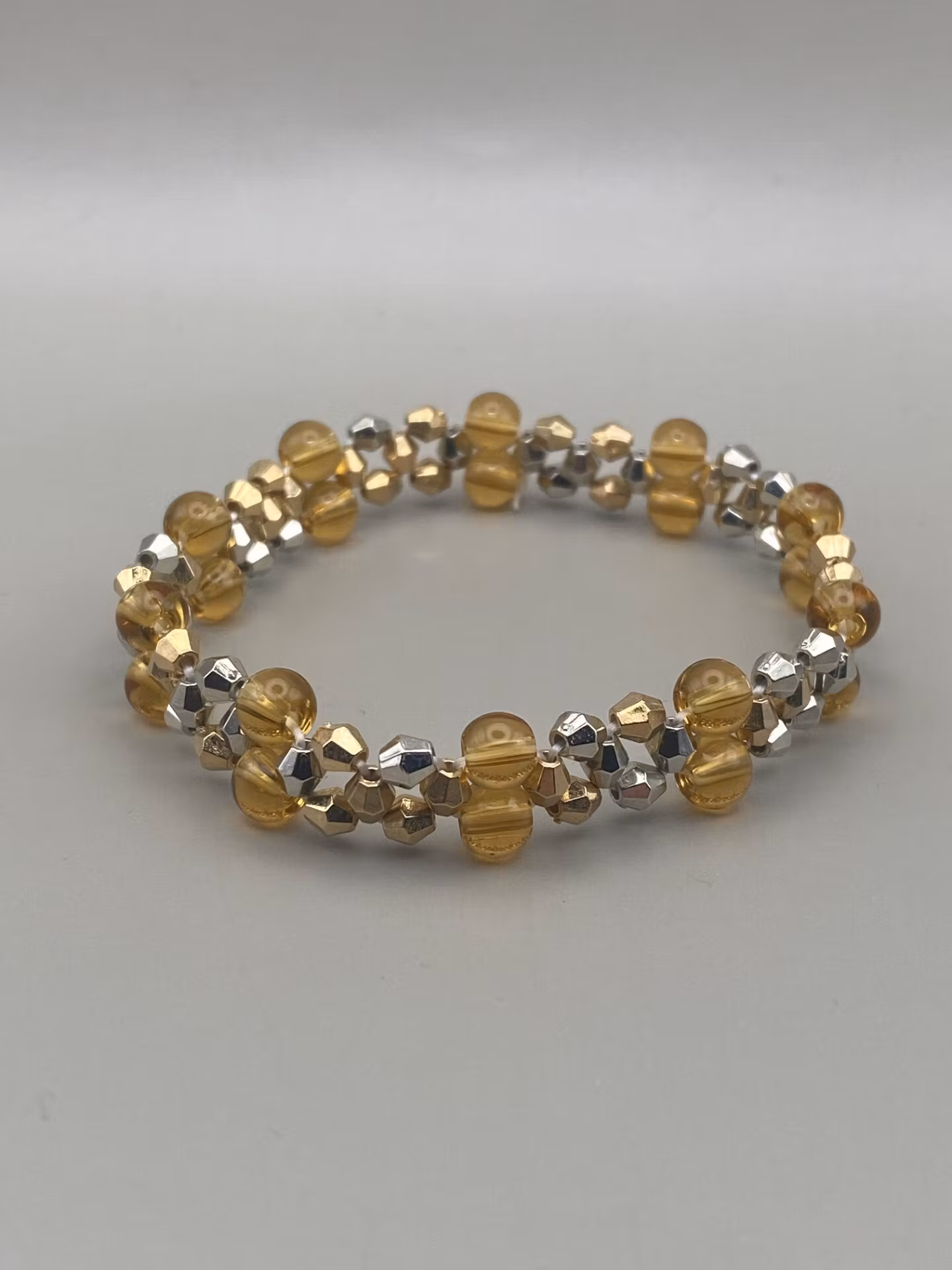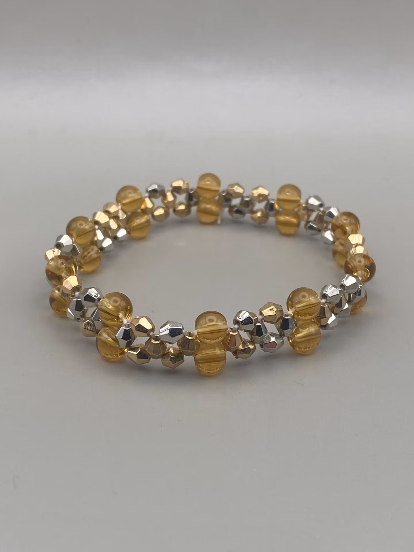Vackert skimrande treradigt armband av skimrande blandat små silver och guld pärlor och bärnstensfärgade glaspärlorPärlor 8mm, 4mmVisas produkten ”Tillfälligt s