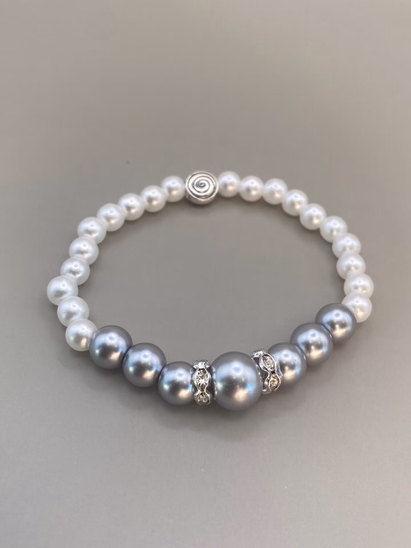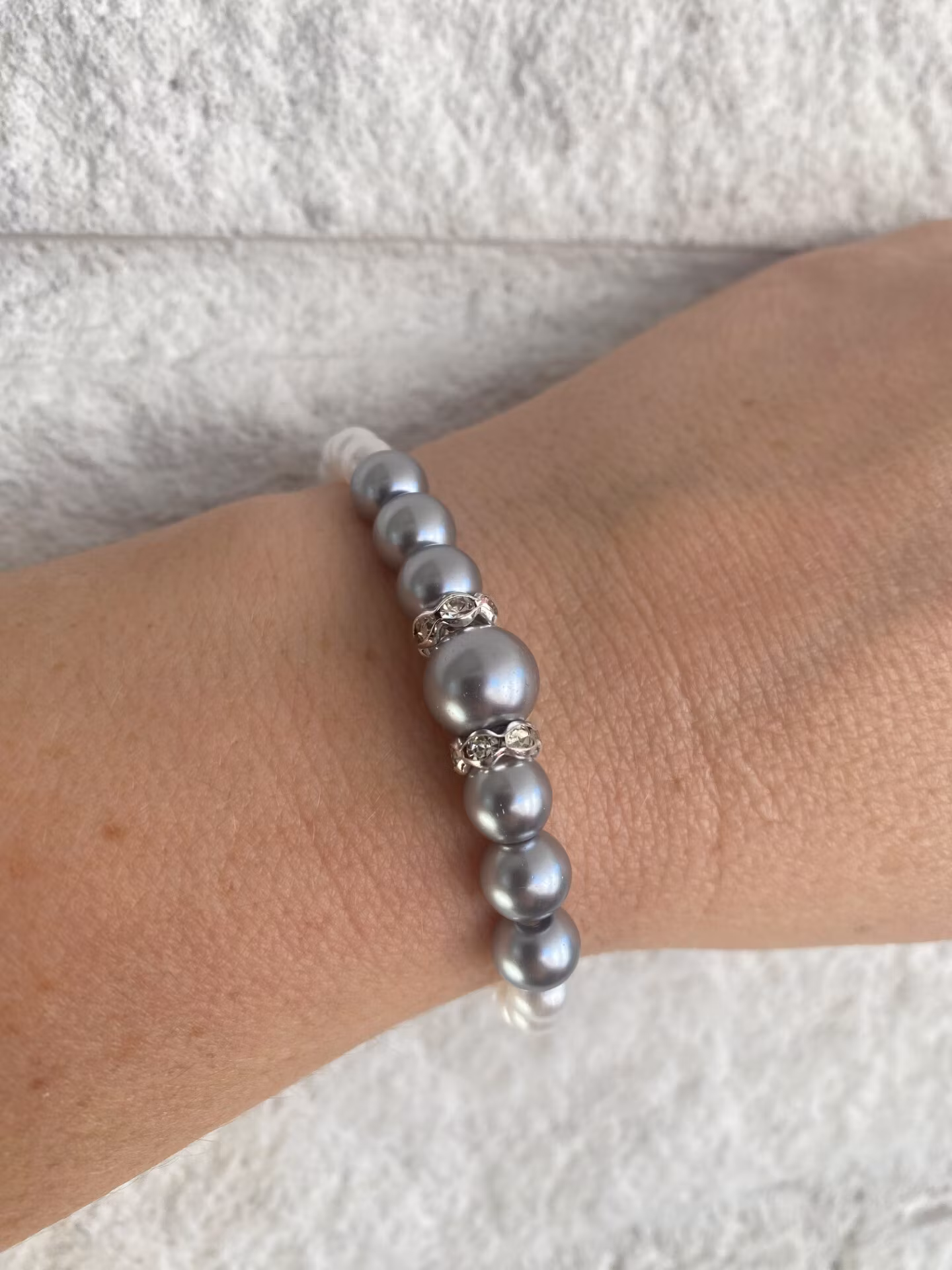 Stiligt armband i silvergrå blanka pärlor med lite tyngd för lyxig känsla och silverfärgad strass runt en modell större pärla i blickfånget. Kritvita glansiga pärlor runt om, fin silverfärgad avslutspärla.