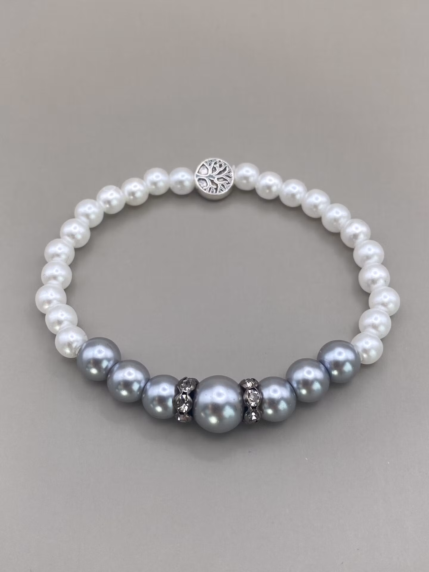 Stiligt armband i silvergrå blanka pärlor med lite tyngd för lyxig känsla och mörk stålgråfärgad strass runt en modell större pärla i blickfånget. Kritvita glansiga pärlor runt om, fin silverfärgad avslutspärla.