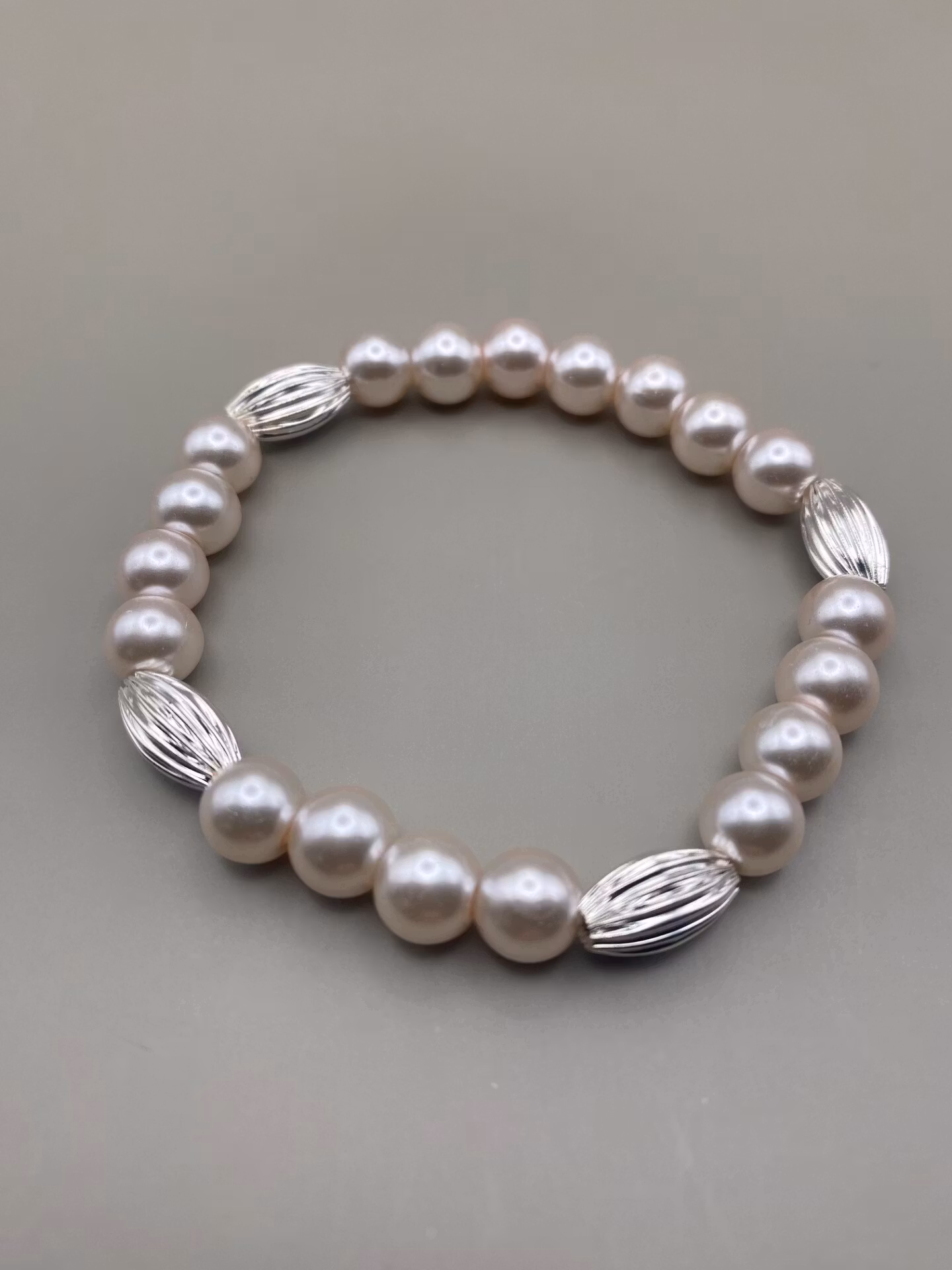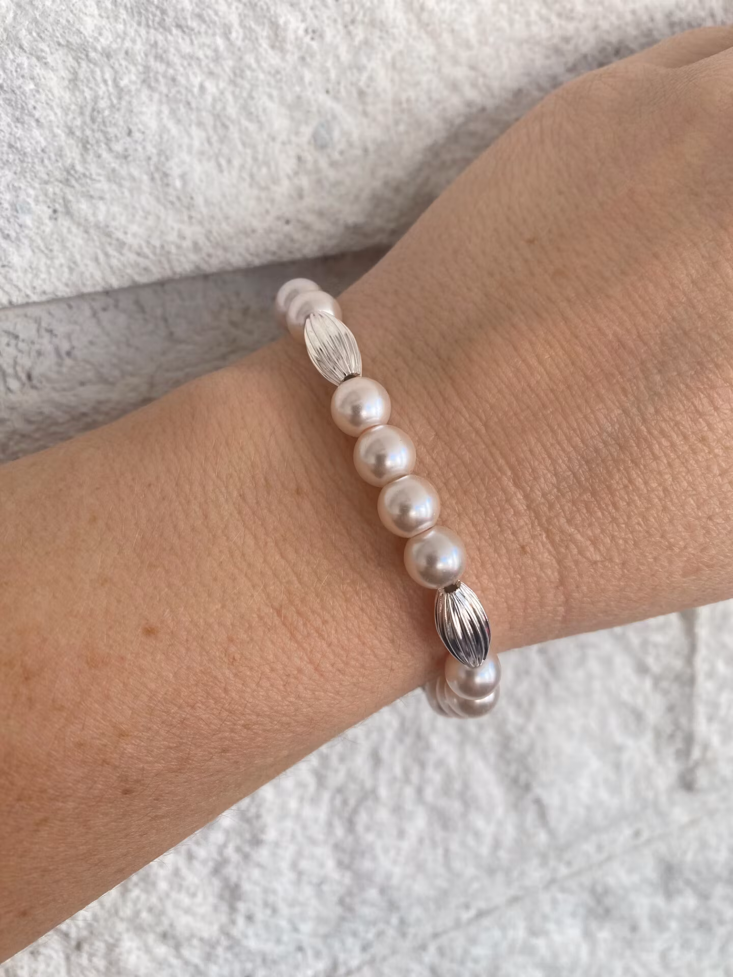 Stiligt armband i ljusrosa glansiga pärlor med lite tyngd för lyxig känsla, varvat med silverfärgade avlånga mönstrade pärlor.