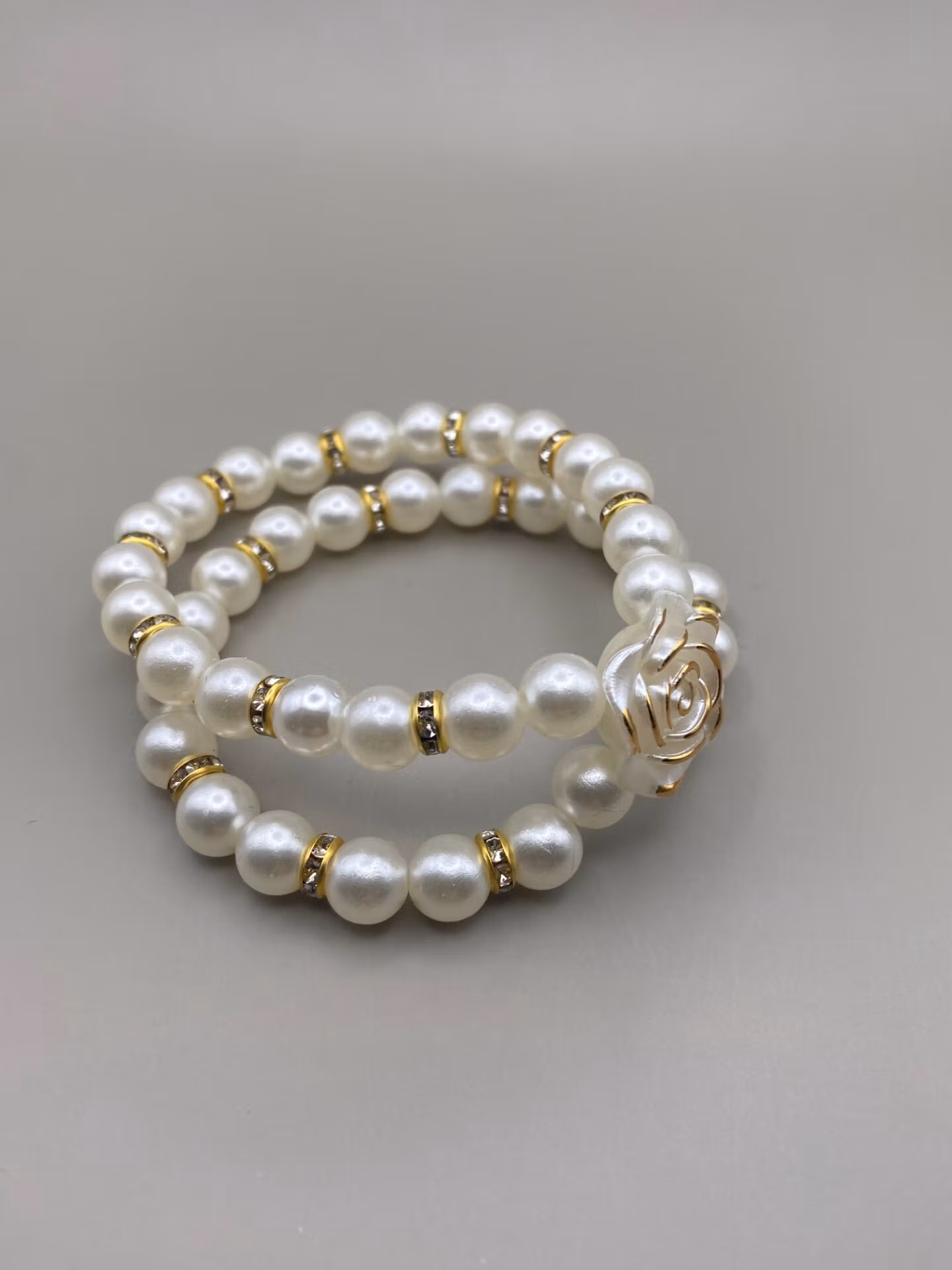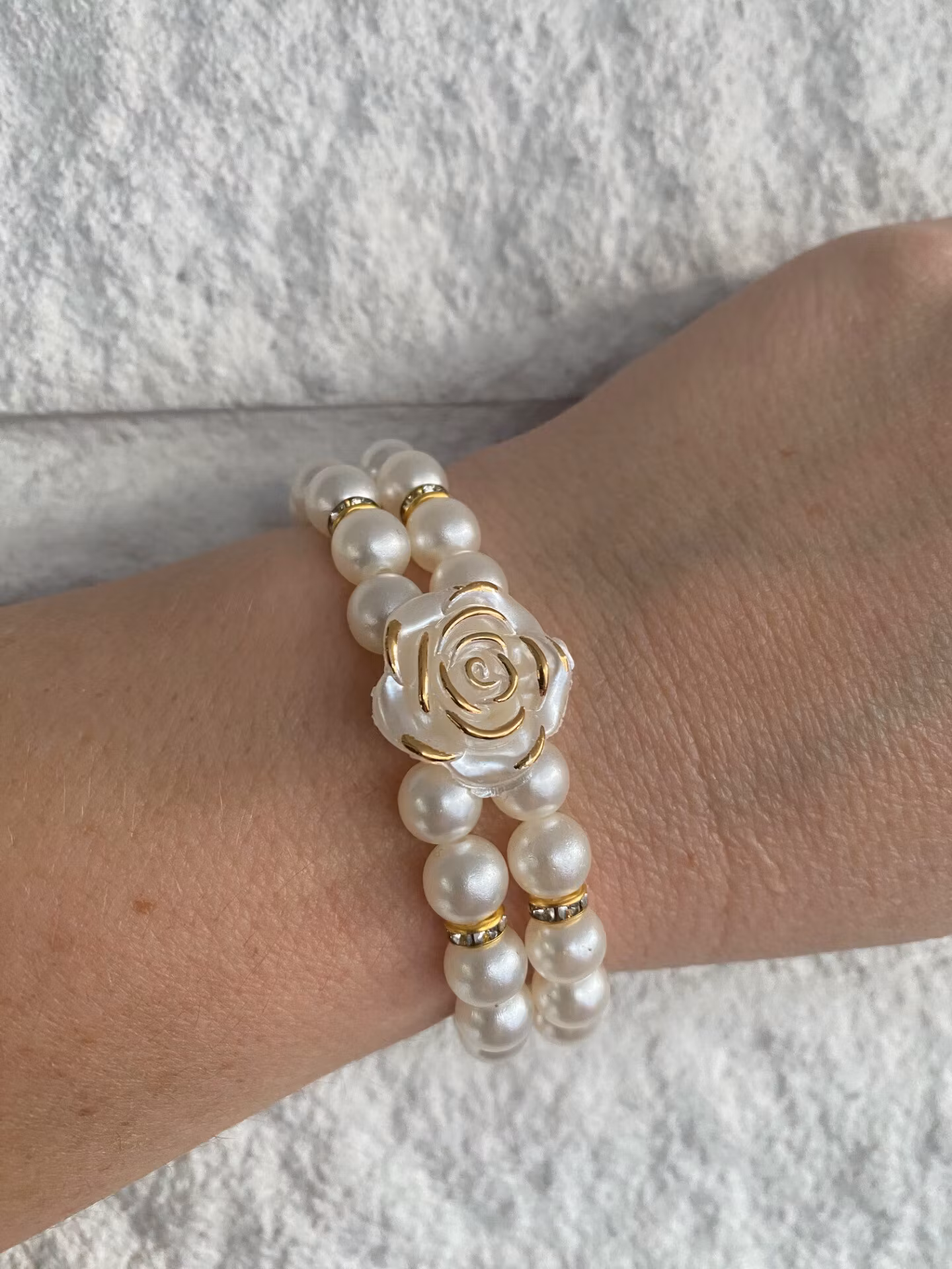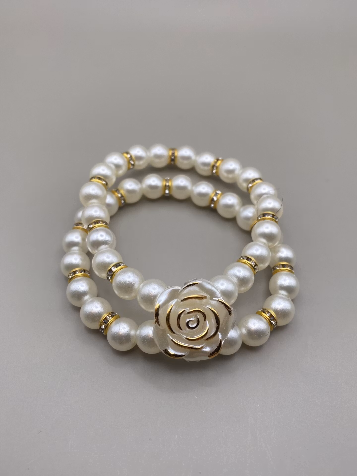 Vackert lekfullt armband i två rader av högblanka elfenbensvita pärlor varvat med guldfärgad strass och en stor vacker ros med guldfärgade kanter i blickfånget.