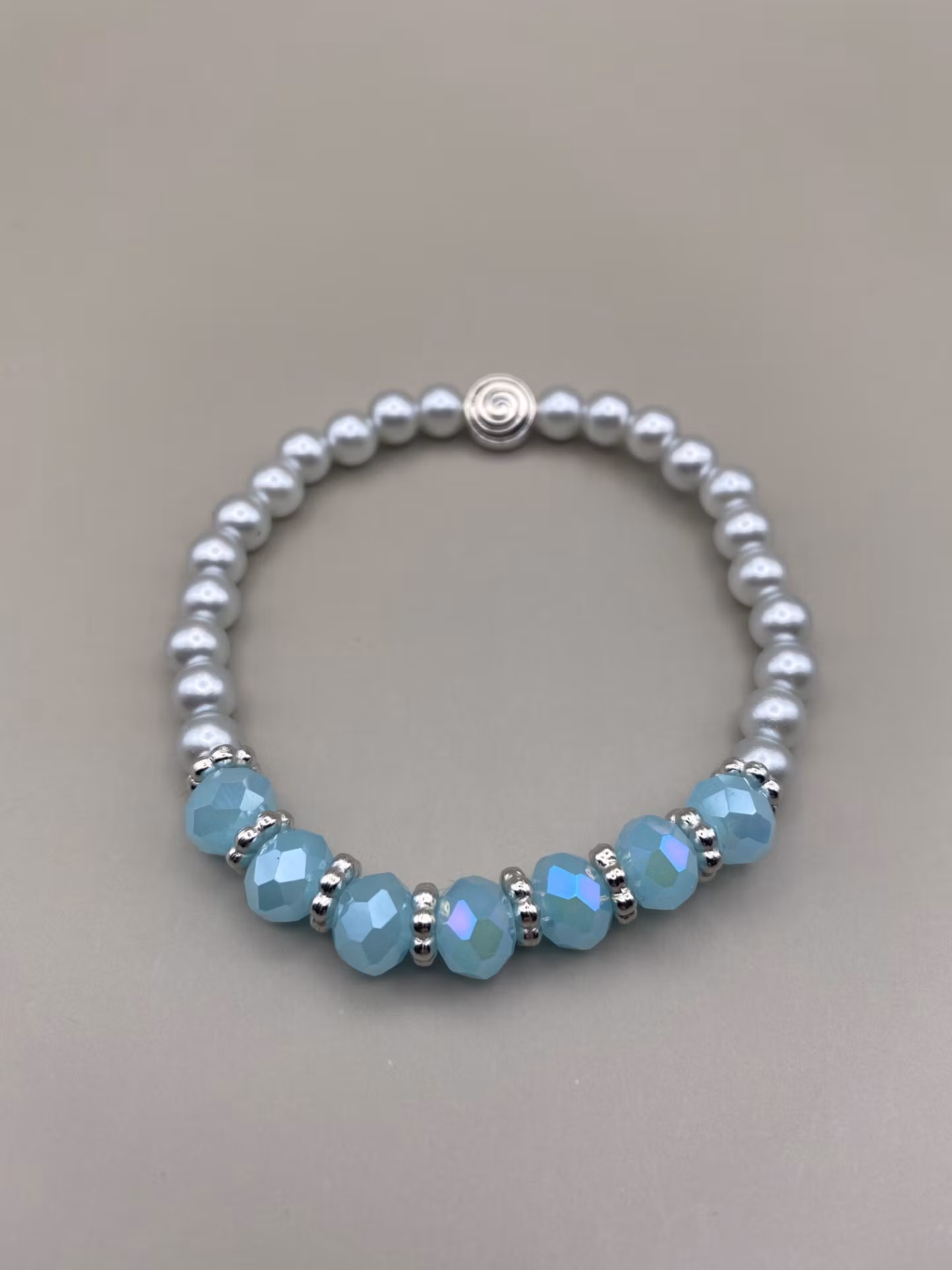 Vackert armband i dovt ljust turkosa fasetterade glaspärlor varvat med silverfärgade detaljer och ljust silvergrå glansiga pärlor runt om. Fin avslutspärlaPärlo
