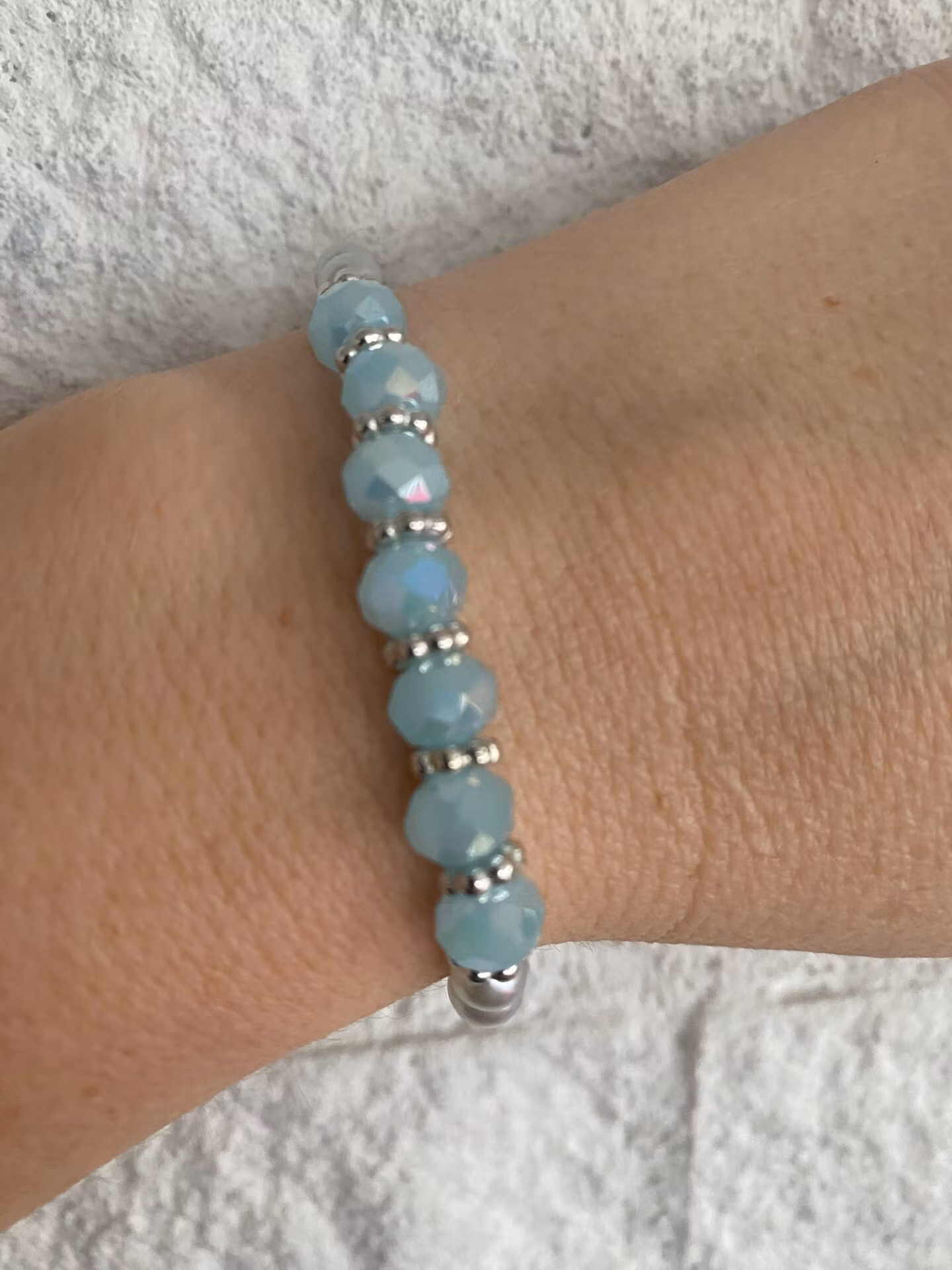 Vackert armband i dovt ljust turkosa fasetterade glaspärlor varvat med silverfärgade detaljer och ljust silvergrå glansiga pärlor runt om. Fin avslutspärla