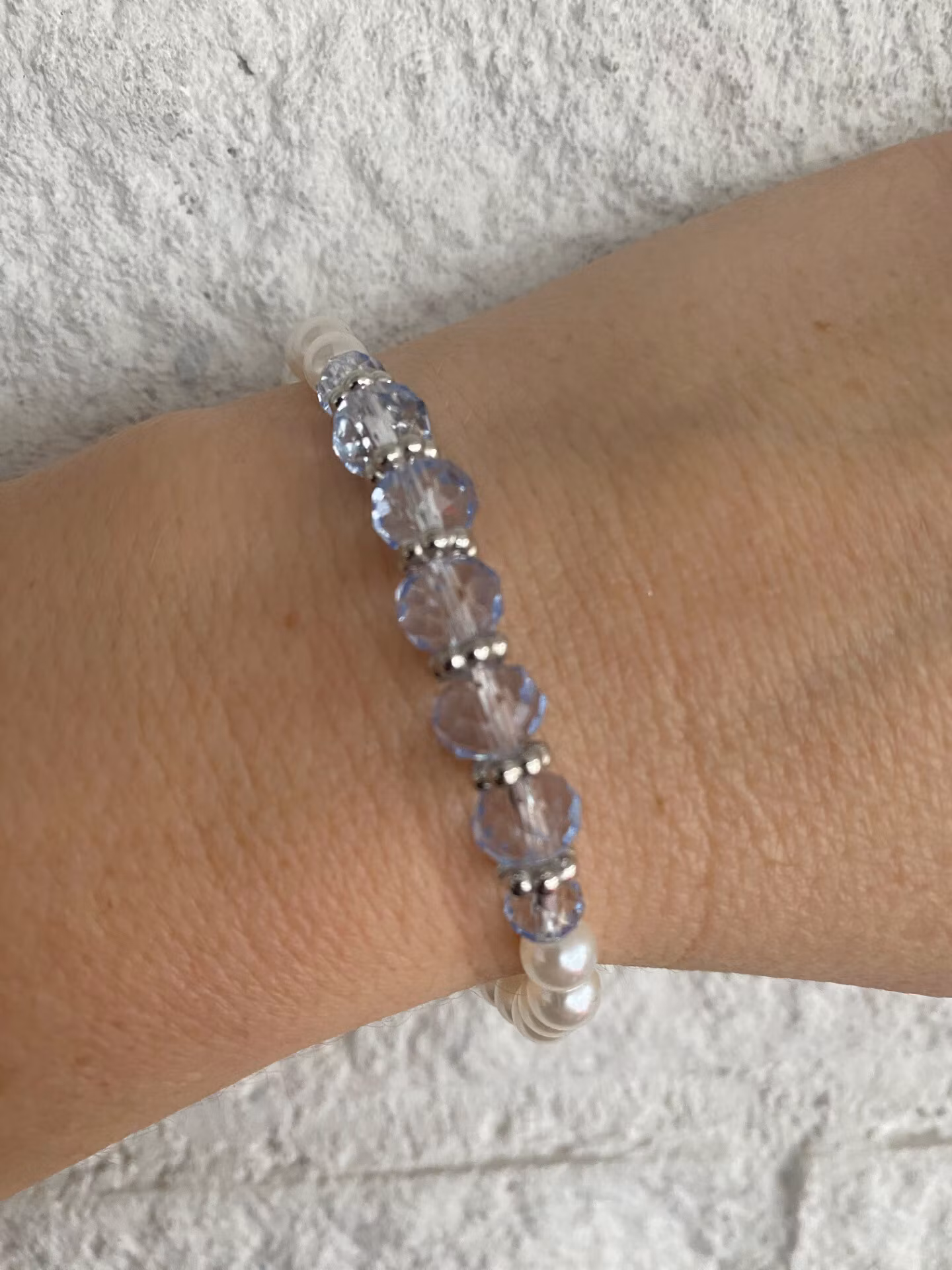 Vackert armband i svagt ljusblå fasetterade glaspärlor varvat med silverfärgade detaljer och elfenbensvita glansiga pärlor runt om. Fin avslutspärla