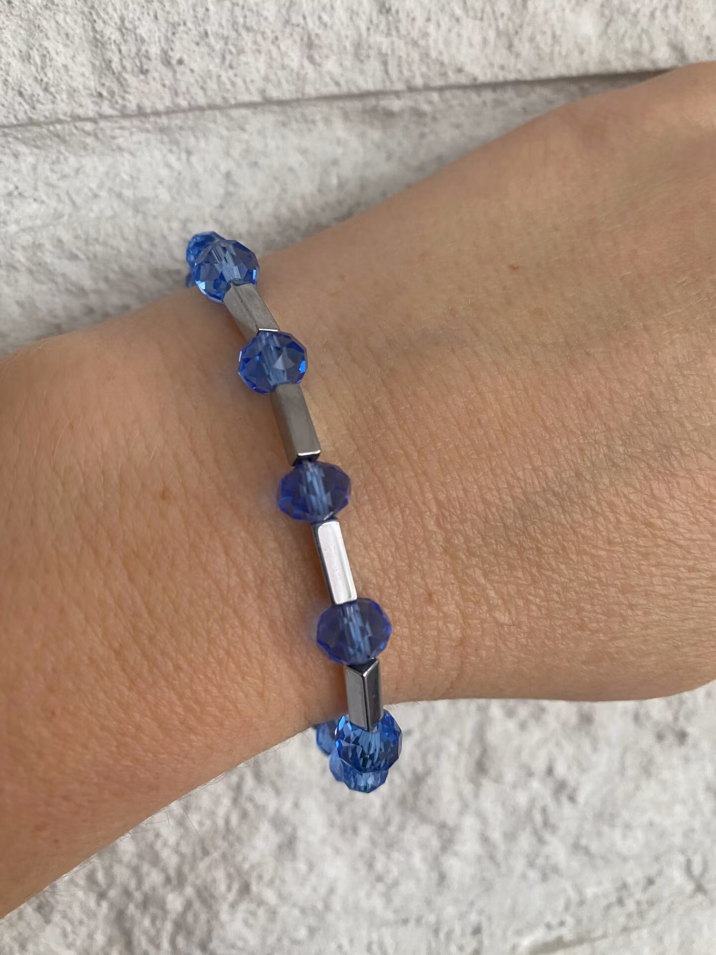 Stiligt men lekfullt armband i vackra himmelsblå genomskinliga fasetterade glaspärlor varvat med spegelblanka silverfärgade kantigt avlånga pärlor i olika storl