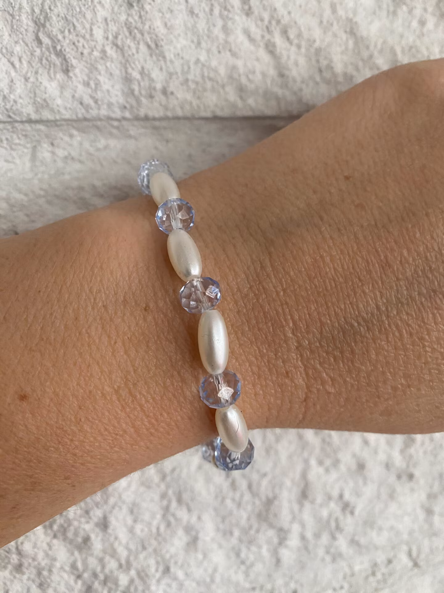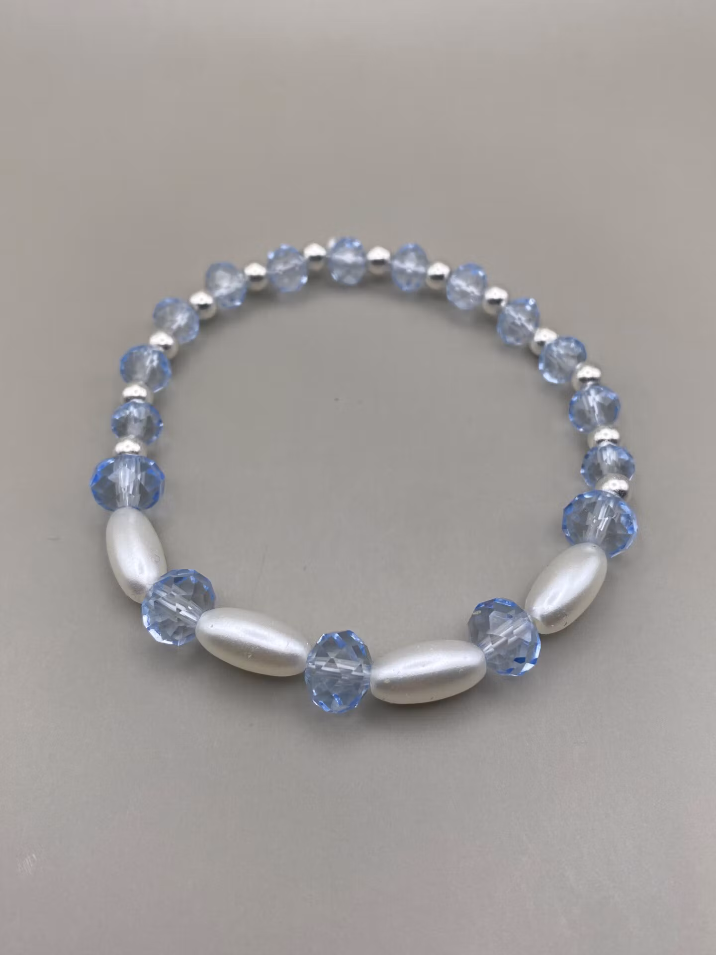 Stilrent vackert armband i svagt ljusblå flerfärgade fasetterade glaspärlor varvat med silverfärgade små pärlor runt om, större ljusblå glaspärlor varvat med benvita avlång pärlor i blickfånget.