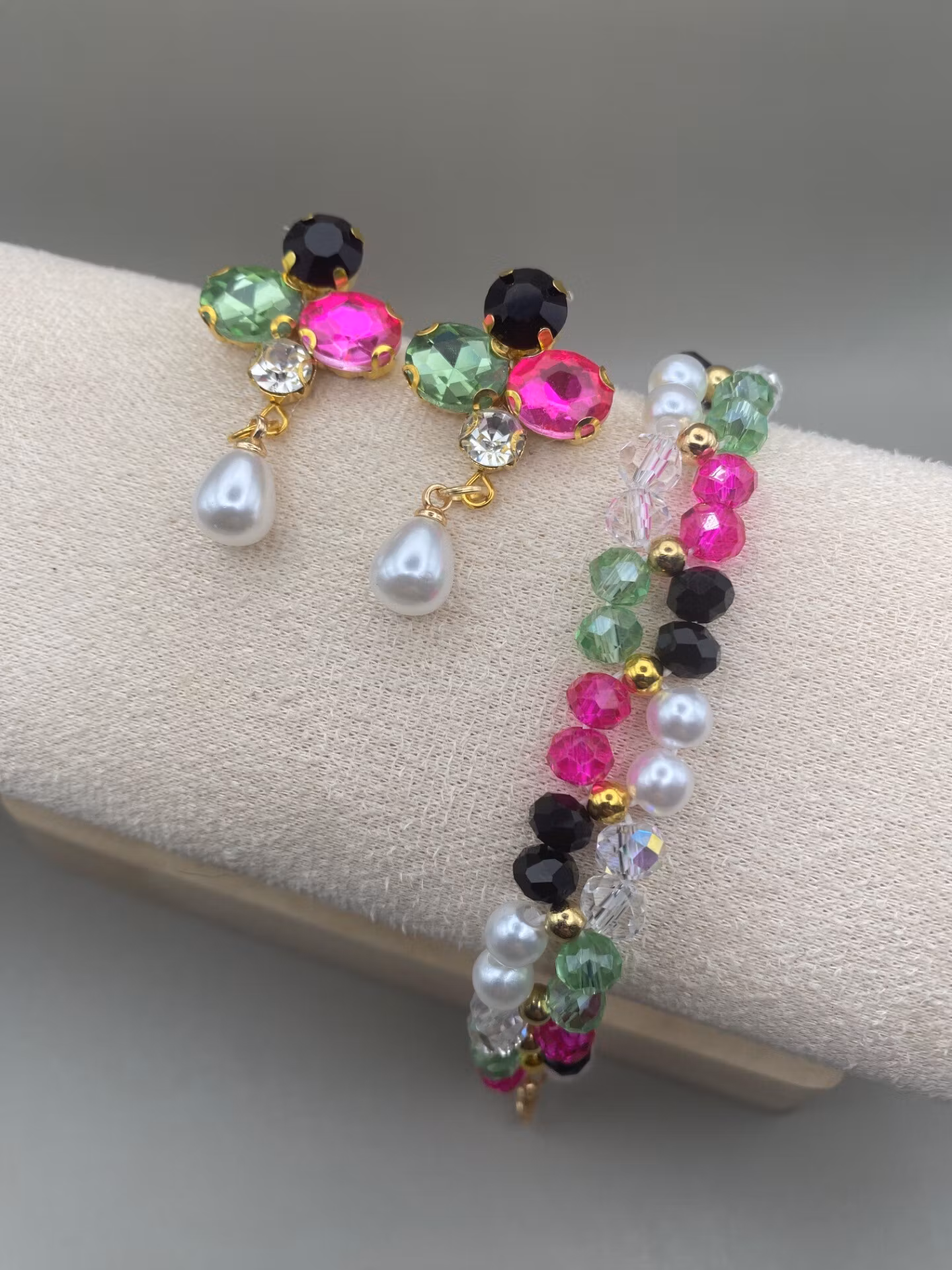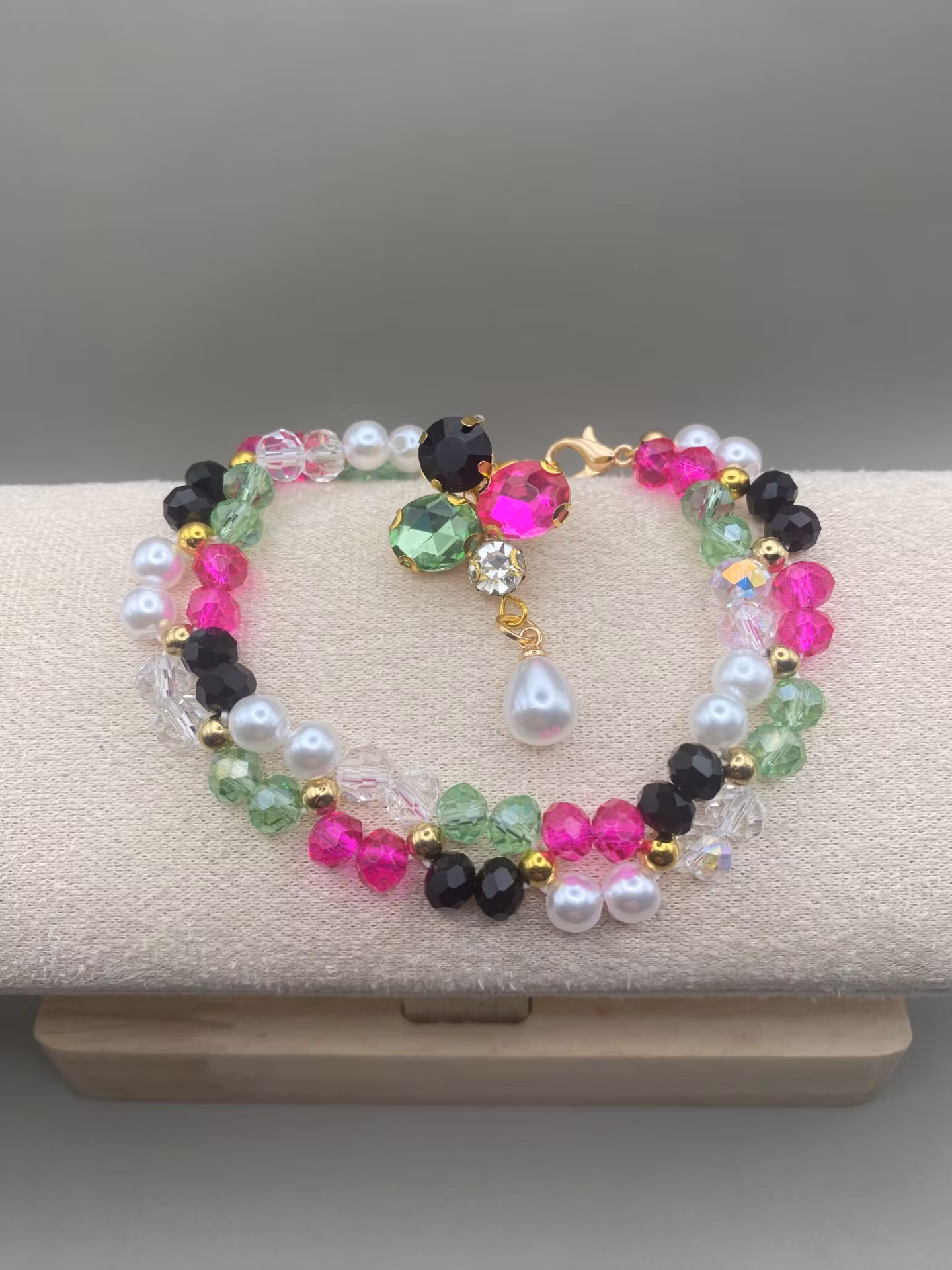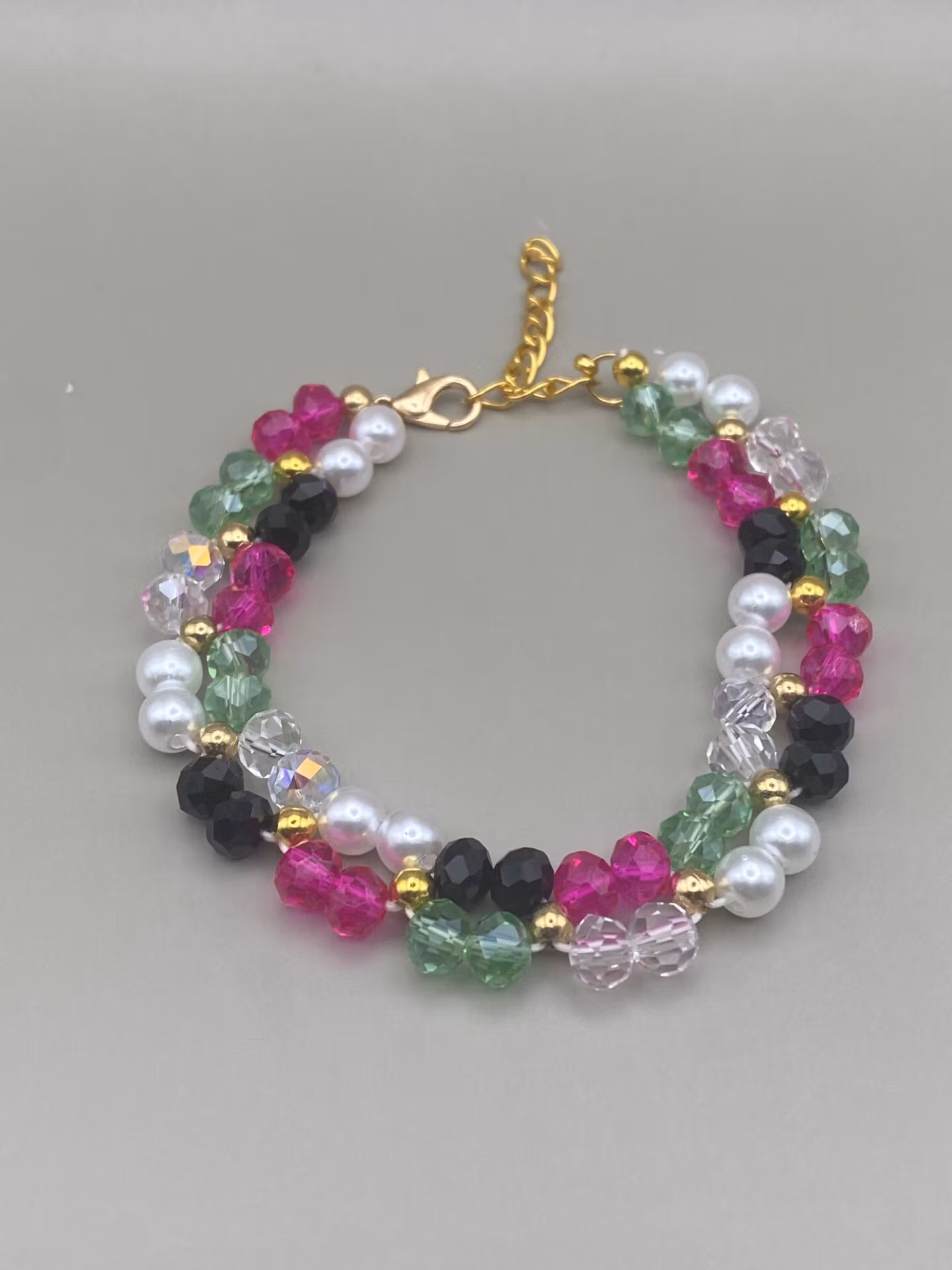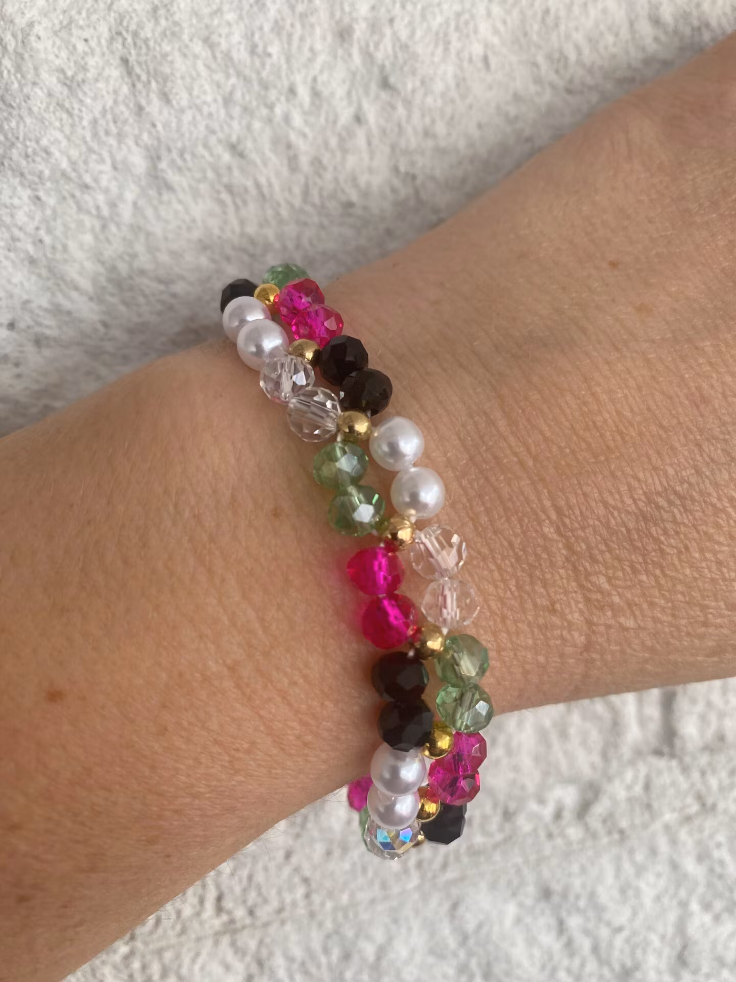 Lekfullt armband i vackert två radigt mönster med varvat fasetterade glaspärlor i färgerna rosa, grönt, klart och svart samt guldfärgade pärlor och kritvita hög