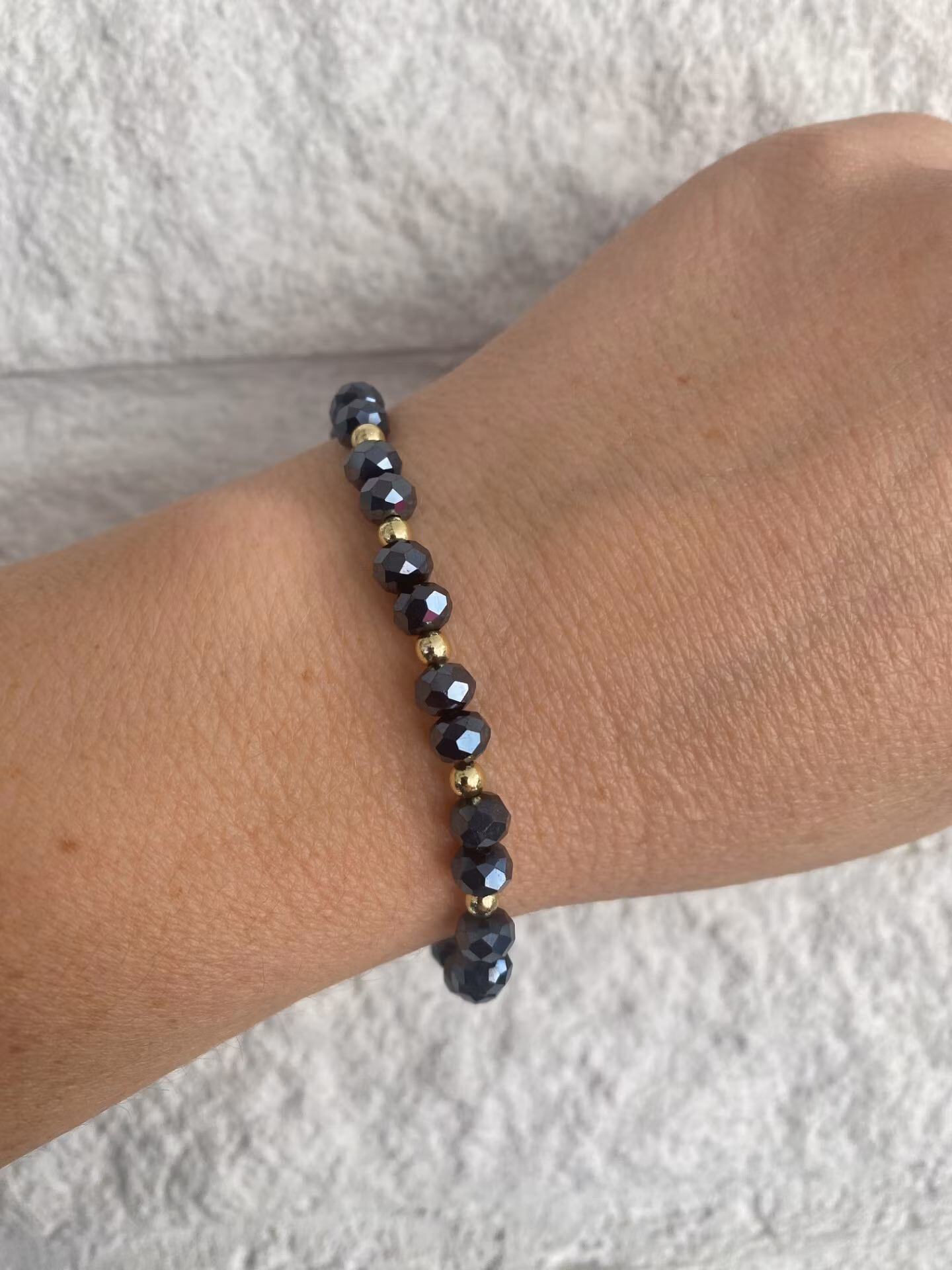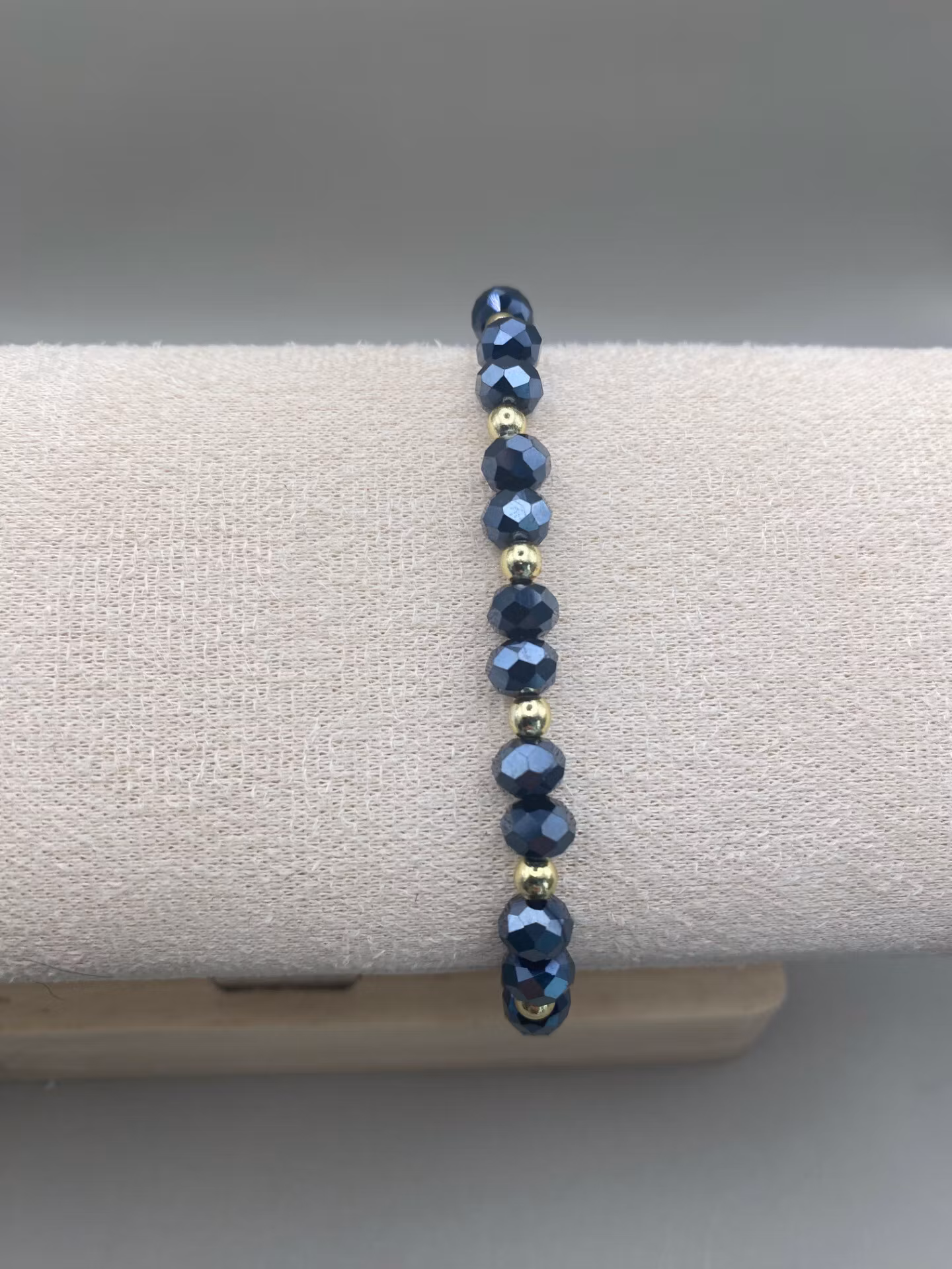 Otroligt vackert armband i fasetterade österrikiska midnattsblå glaspärlor varvat i fint mönster med små guldfärgade pärlor.