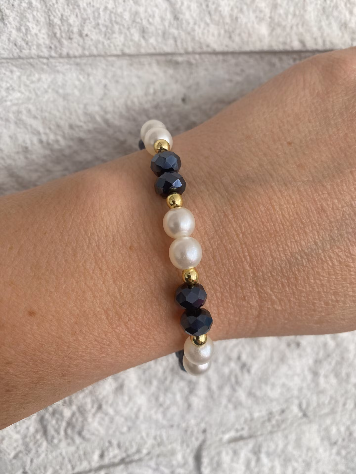Otroligt vackert armband i varvat fasetterade österrikiska midnattsblå stora glaspärlor med elfenbensvita högblanka pärlor och små guldfärgade pärlor. Vacker gu