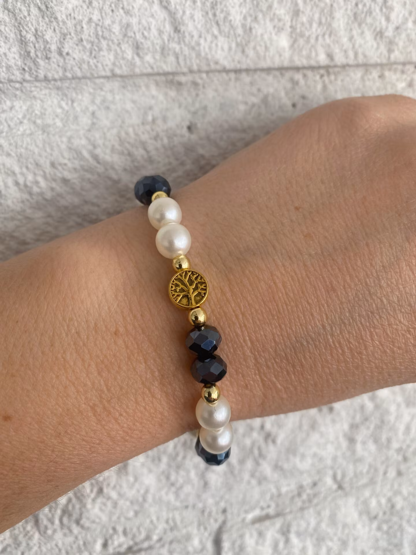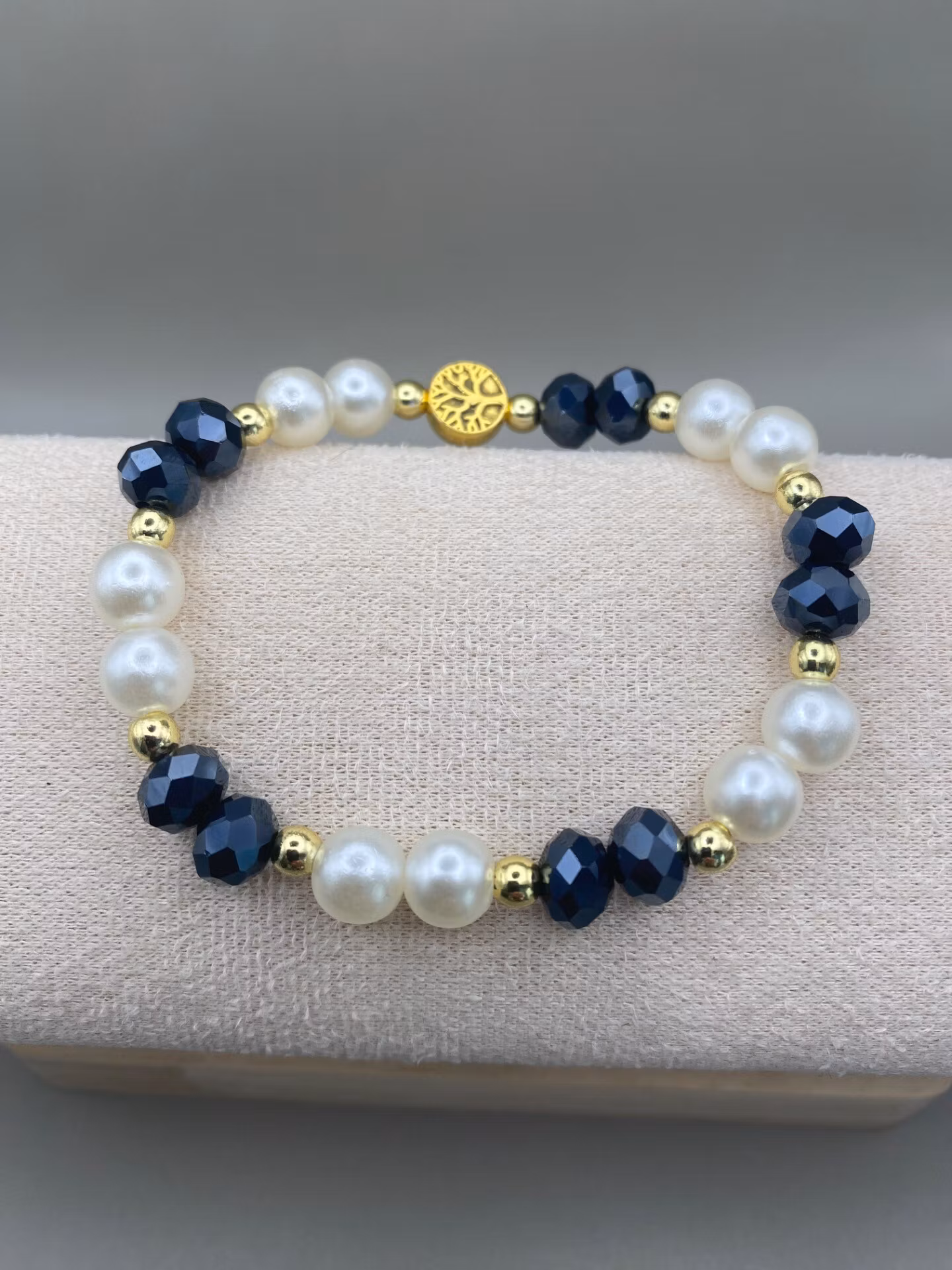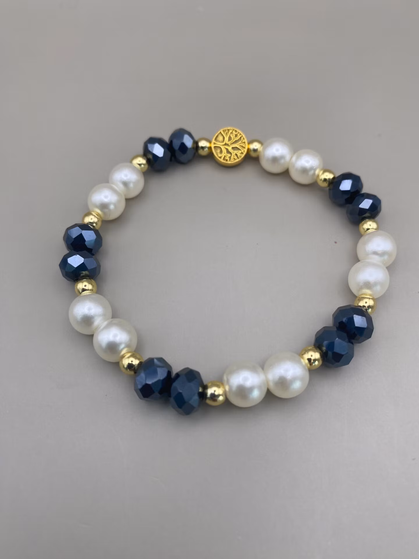 Otroligt vackert armband i varvat fasetterade österrikiska midnattsblå stora glaspärlor med elfenbensvita högblanka pärlor och små guldfärgade pärlor. Vacker guldfärgad avslutspärla i form av livets träd, kan även användas för blickfånget.