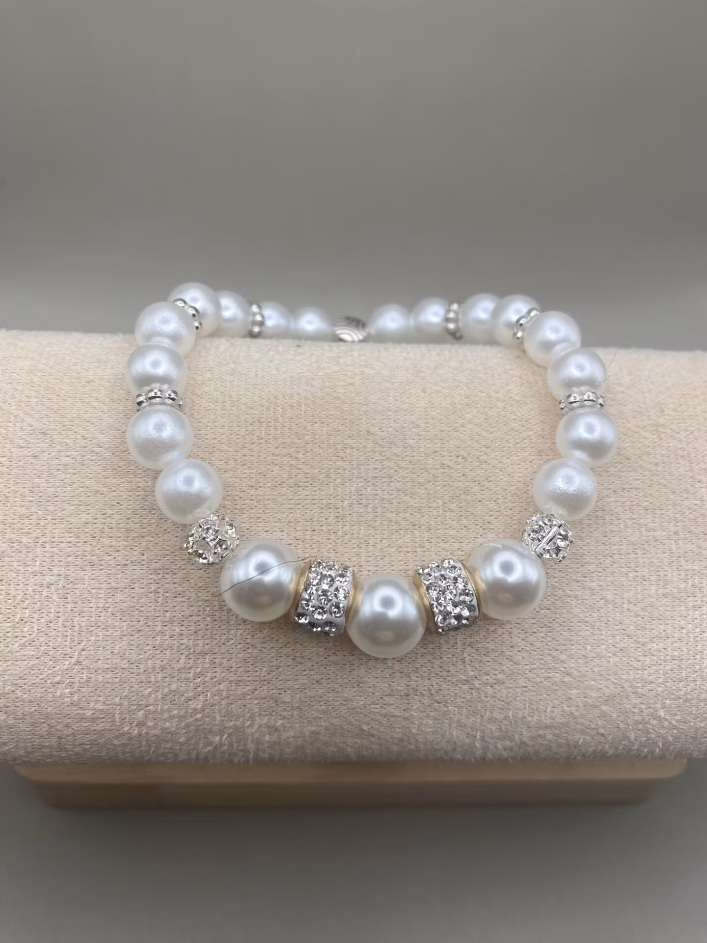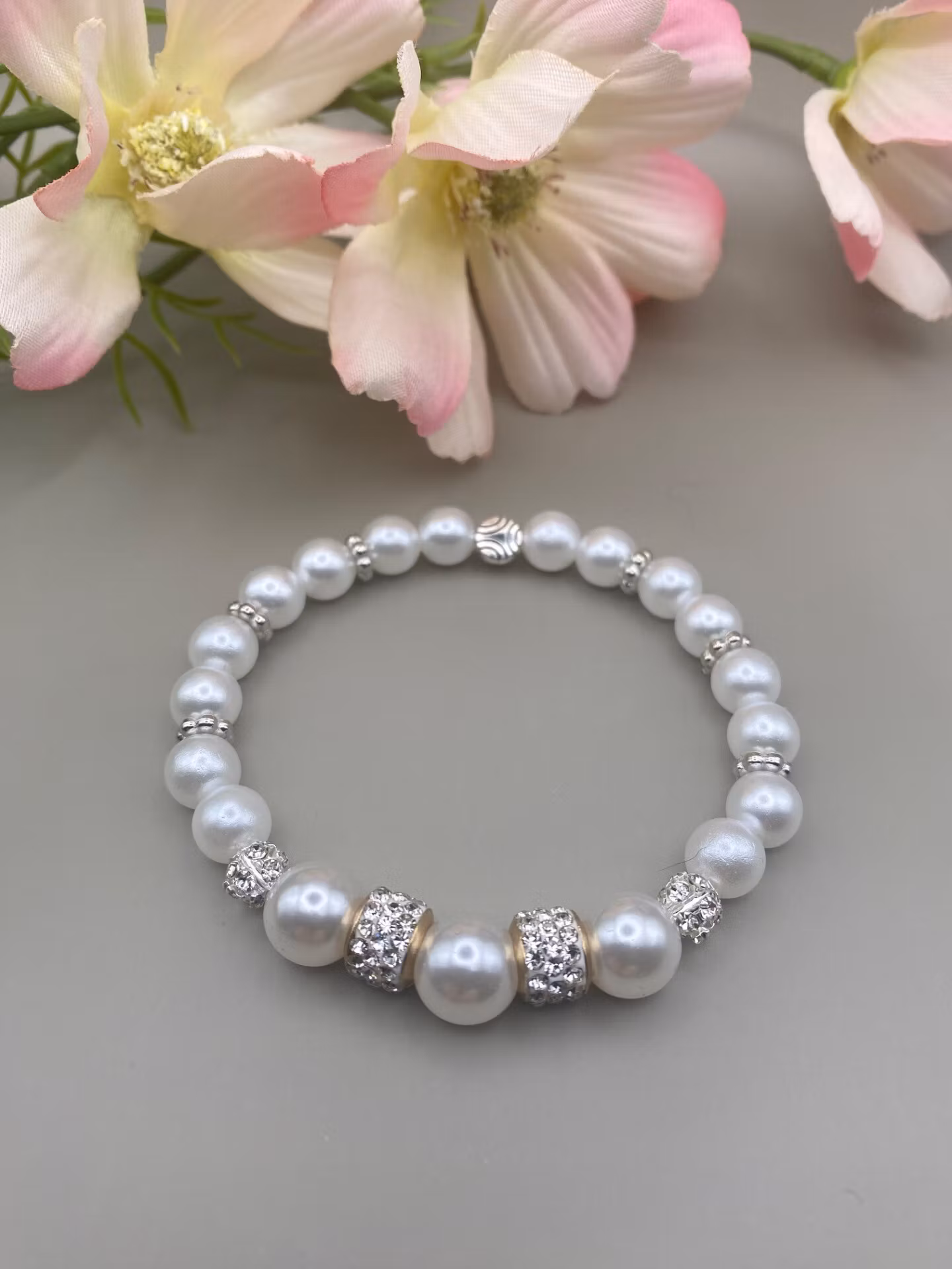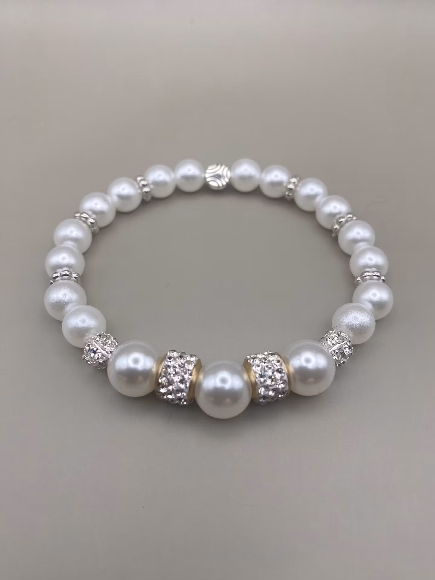 Vackert och elegant armband i högblanka kritvita pärlor, två stora strasspärlor och glitterbollar i blickfånget. silverfärgade distanser i varvat mönster med de