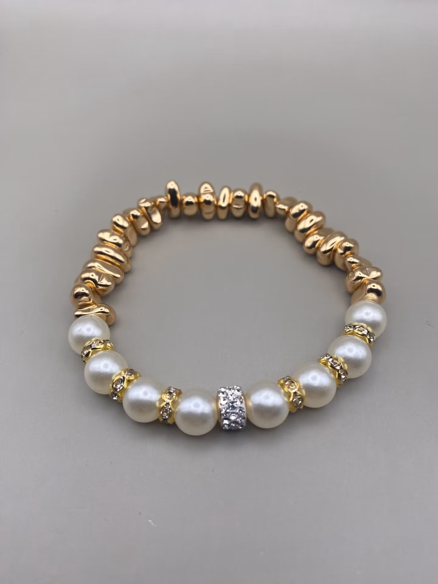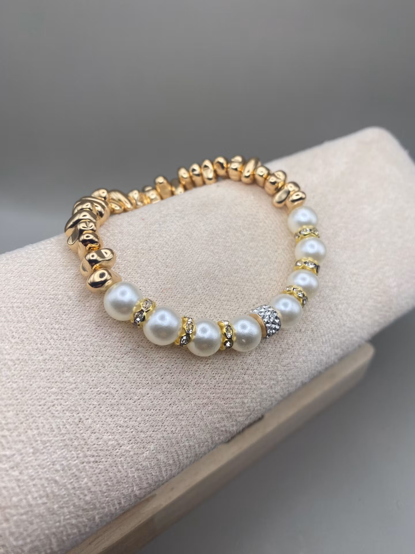 Vackert armband i benvita glansiga pärlor varvat med guldfärgad strass och en större strassdetalj i blickfånget. Oregelbundna 14K guldpläterade hematitpärlor med tyngd runt om. Armbandet känns otroligt lyxigt med tyngden.