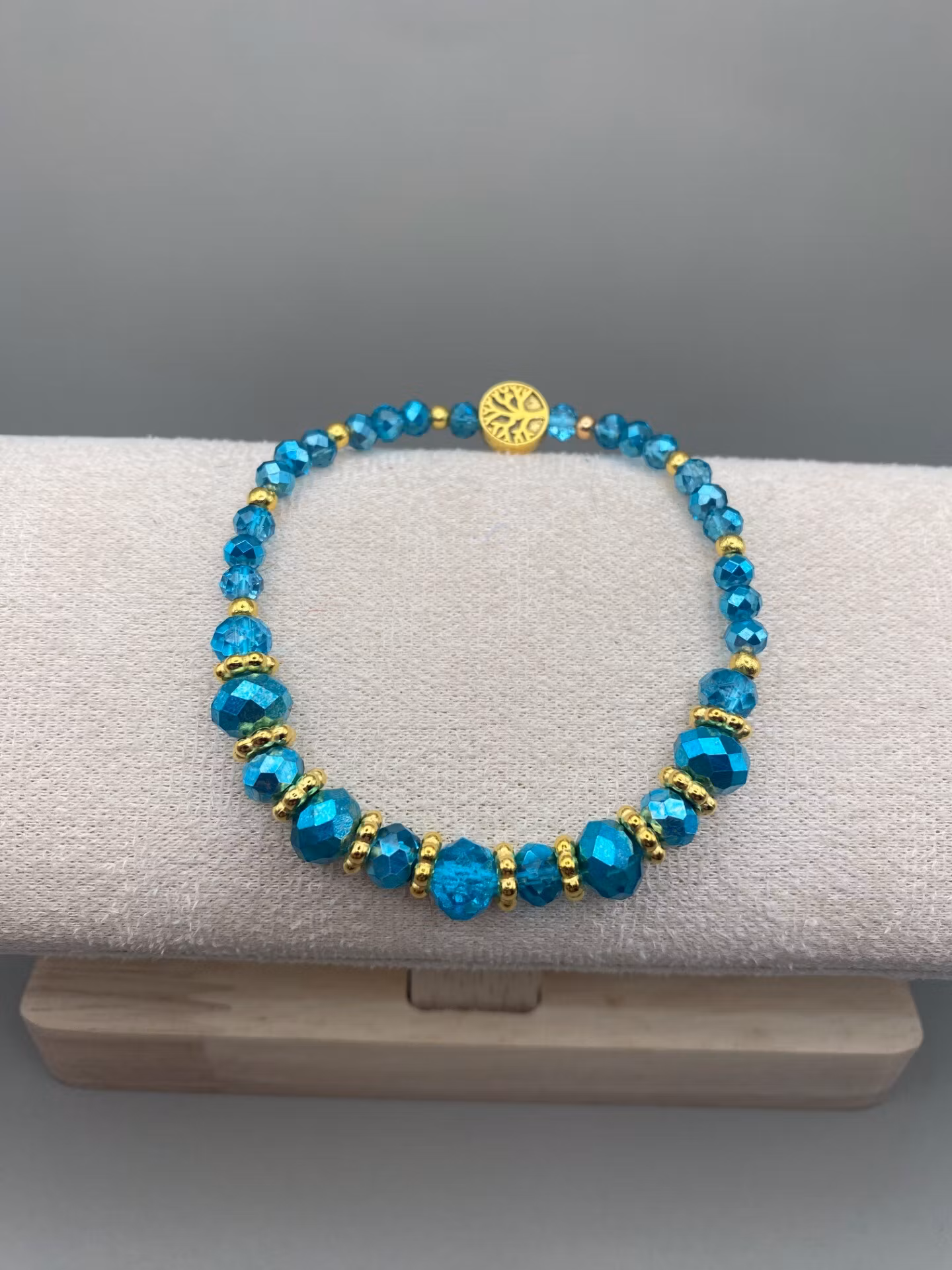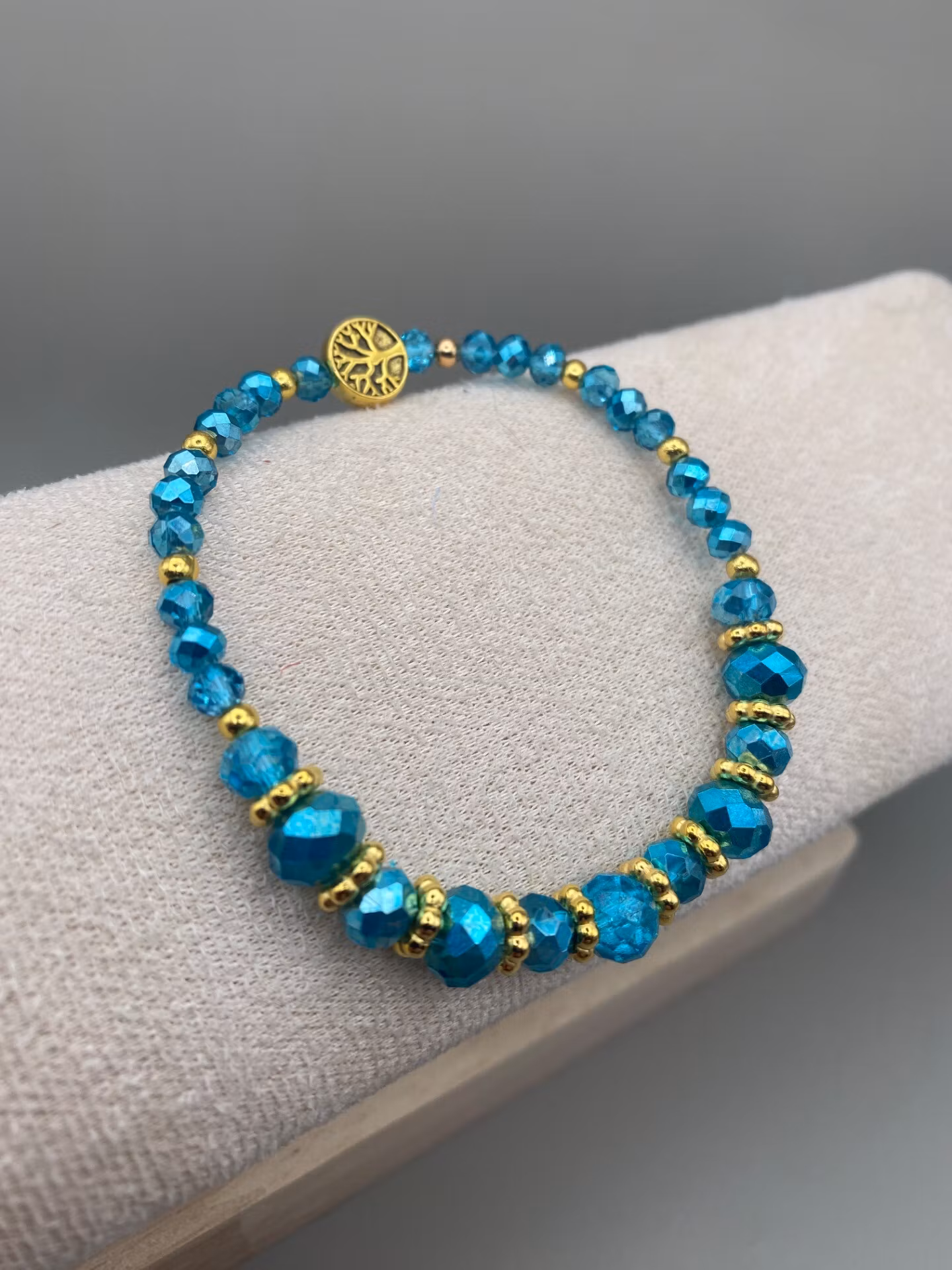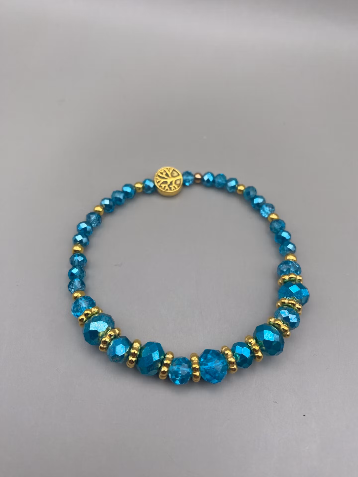 Lekfullt armband i lyxigt facetterade turkosa glaspärlor, varvat stora och något mindre och guldfärgade distanser i blickfånget. Små pärlor runt om, varvat med guldfärgade distanser. Vacker avslutspärla iform av livets träd.
