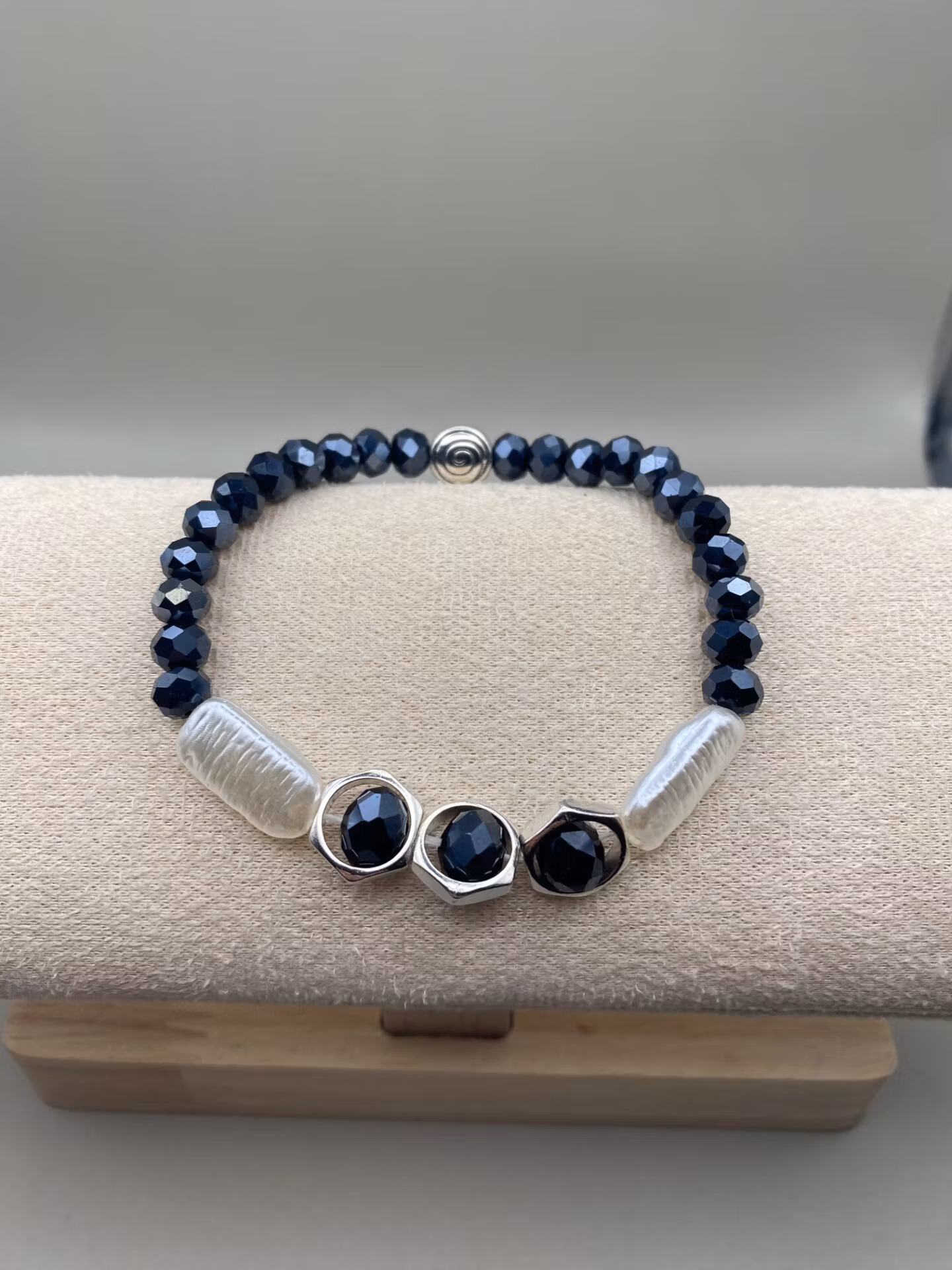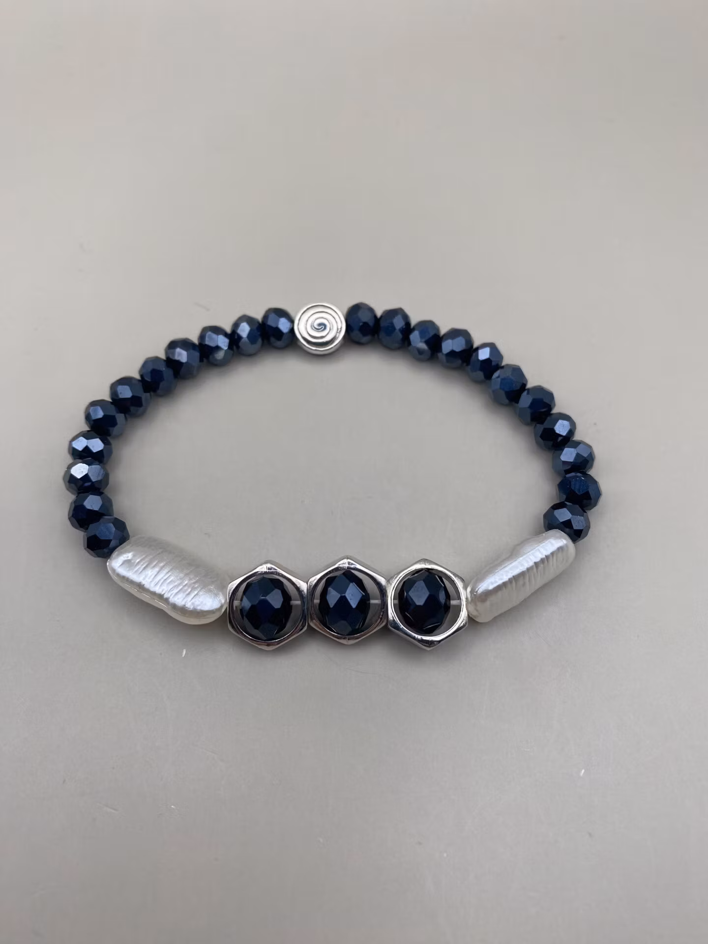 Vackert armband i lyxigt midnattsblå facetterade kristallglaspärlor runt om, i blickfånget två stora platta avlånga högblanka vita pärlor och tre stora likadan midnattsblå pärlor med silverfärgat 6-kantiga höljen.