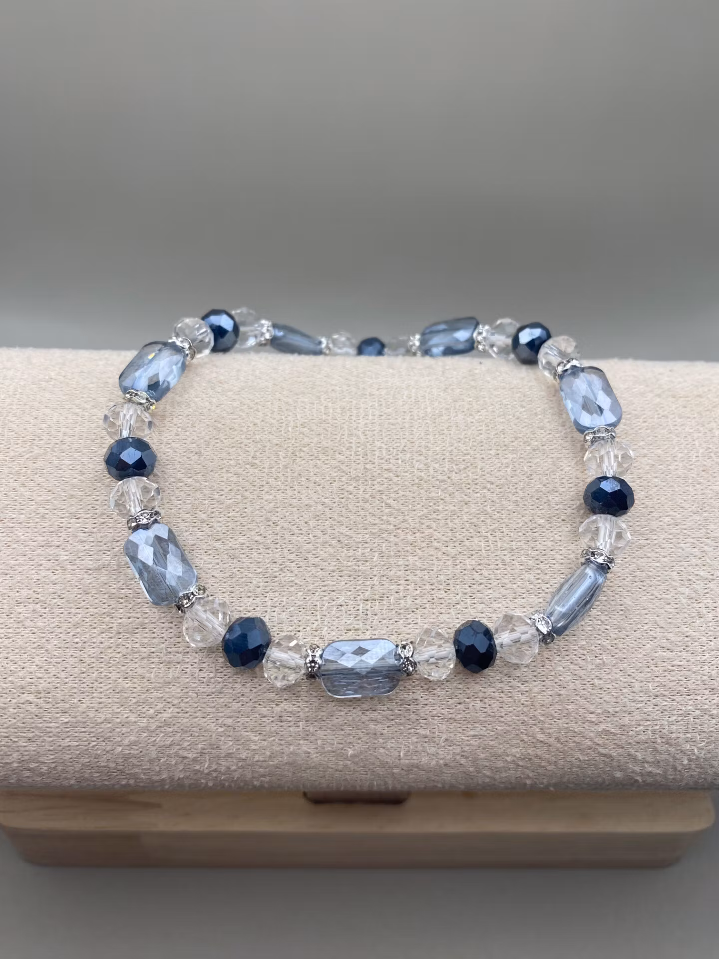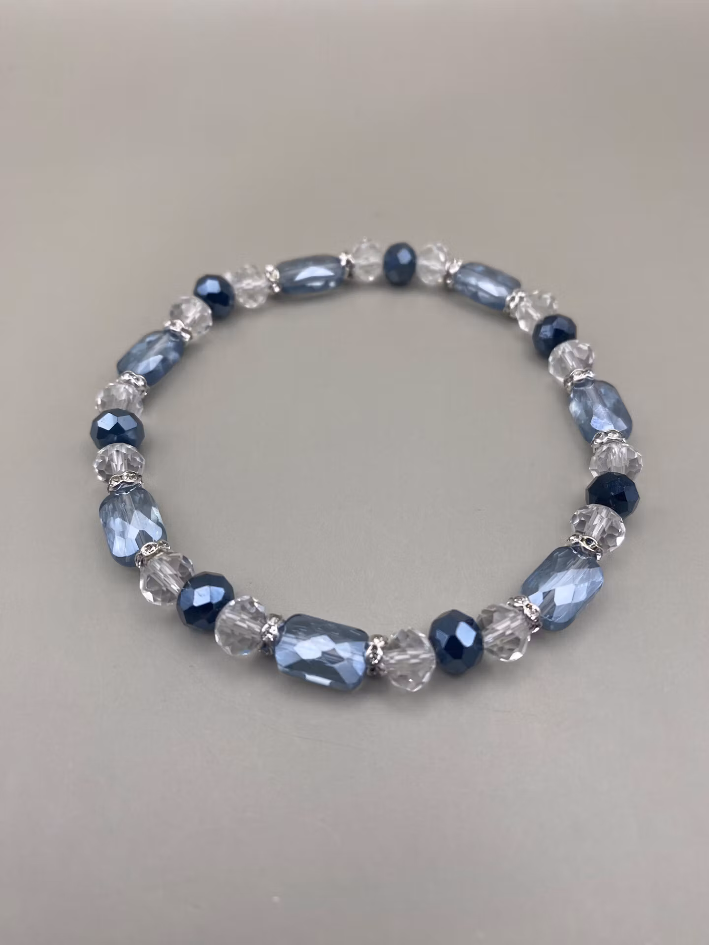 Vackert skimrande armband i en lyxig mix av midnattsblå, klara, genomskinliga facetterade kristallglaspärlor och dimblå avlånga platta facetterade glaskristallpärlor varvat med strass.