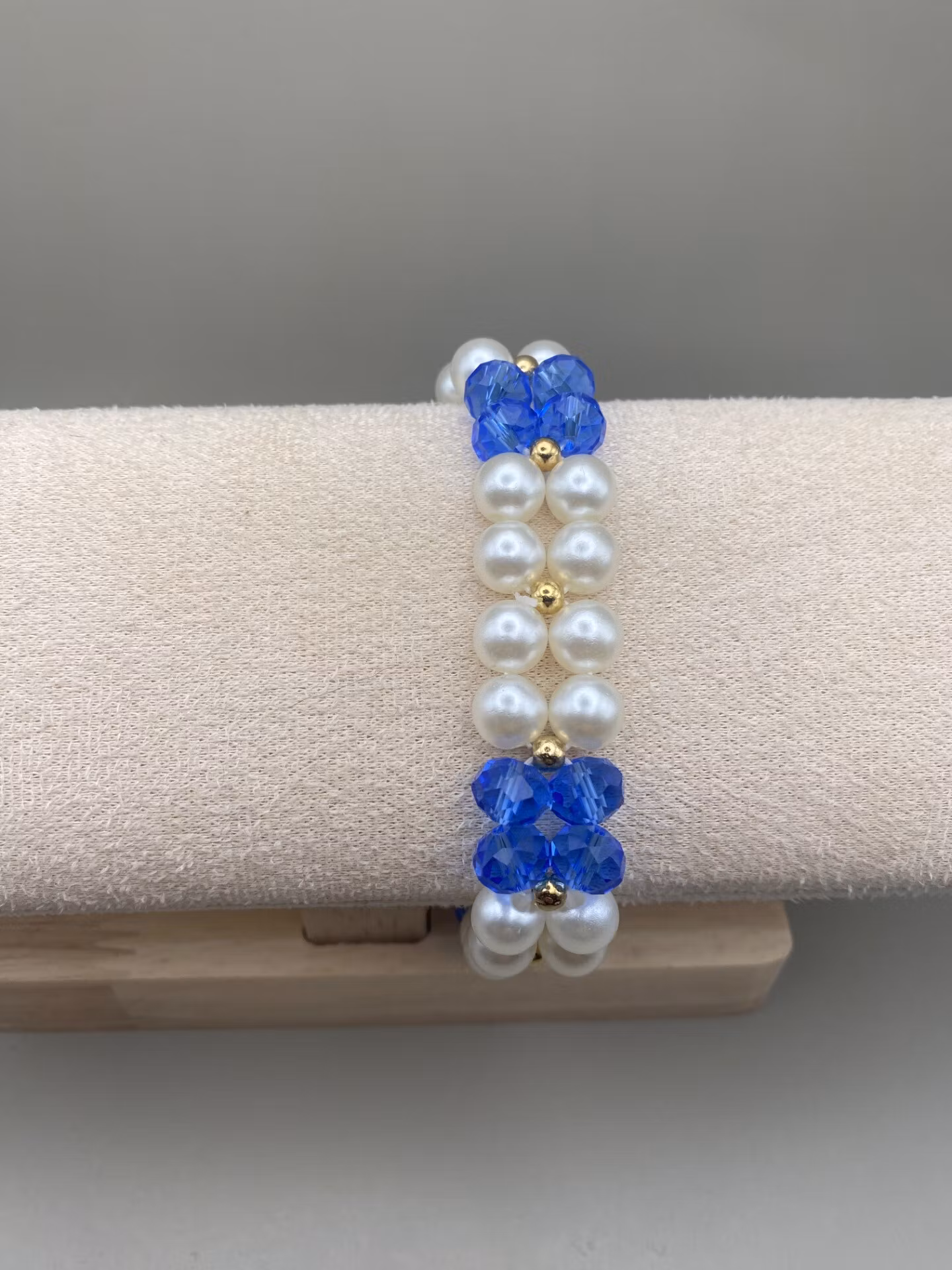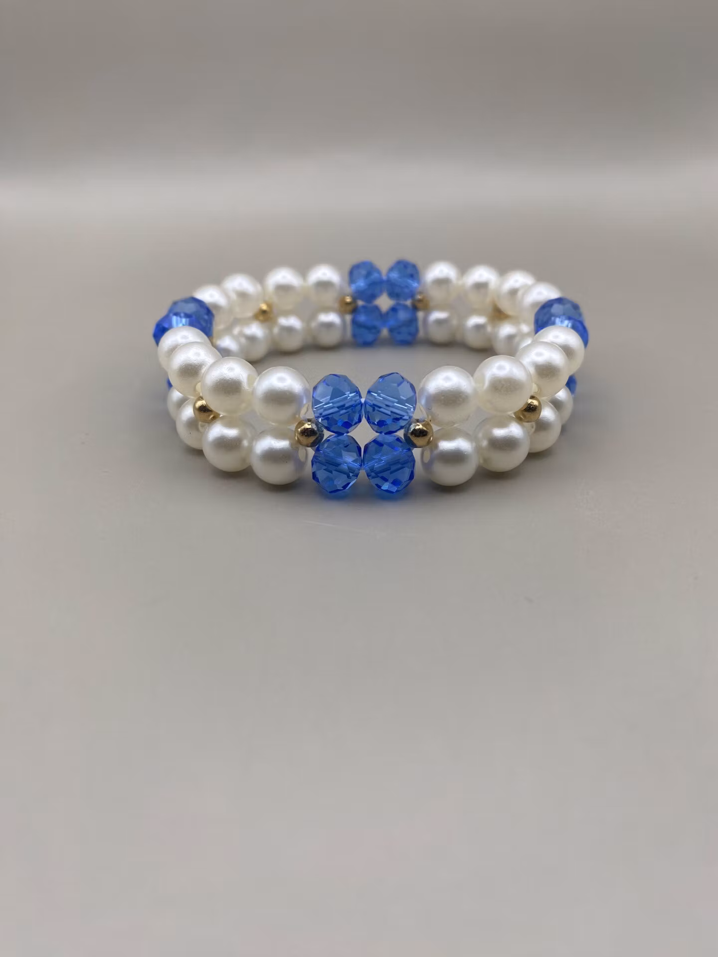 Vackert elegant tvåradigt armband i en lyxig mix av stora elfenbensvita blanka pärlor i varvat fint mönster med stora blå facetterade glaskristallpärlor och små guldfärgade pärlor.