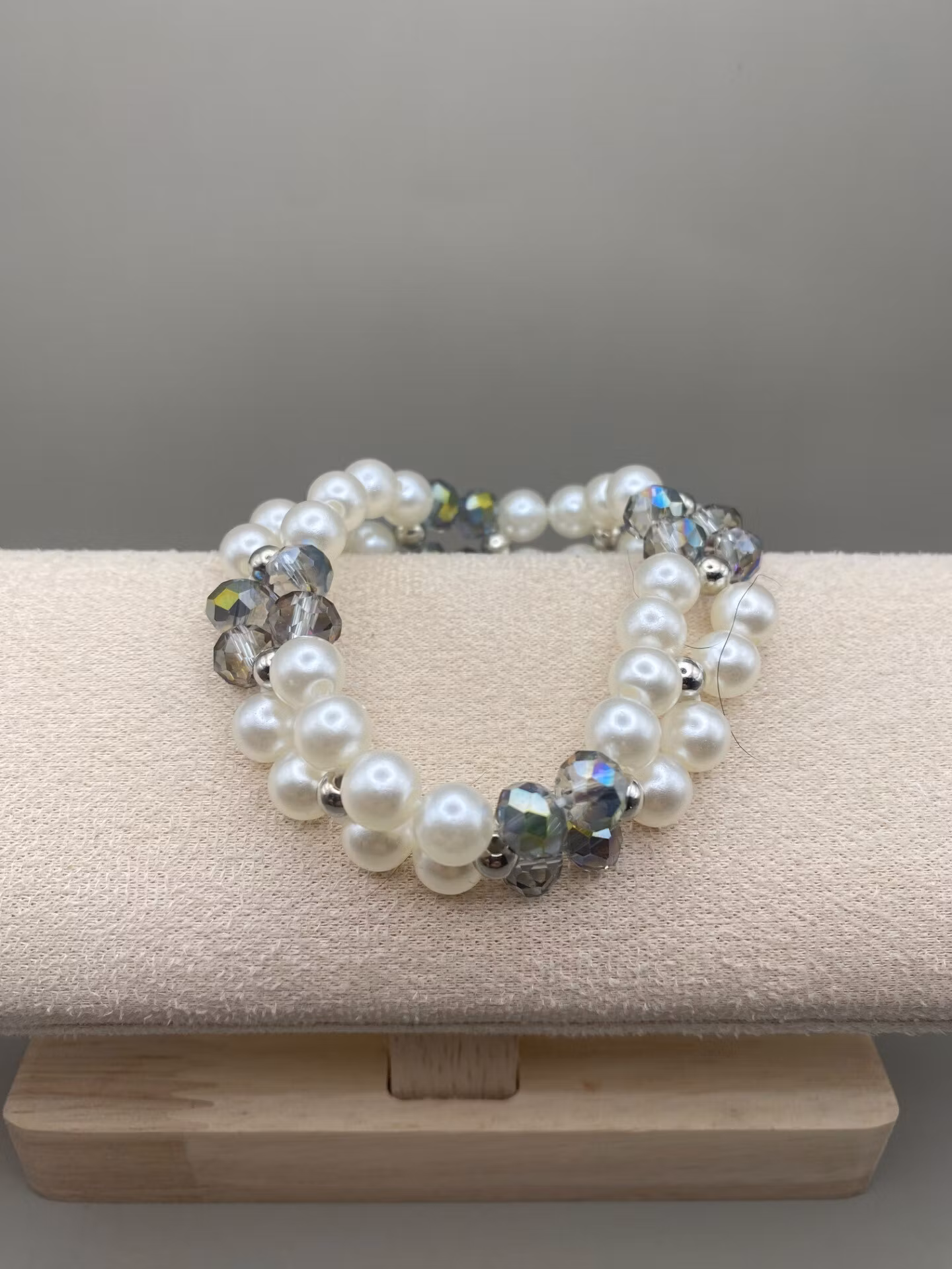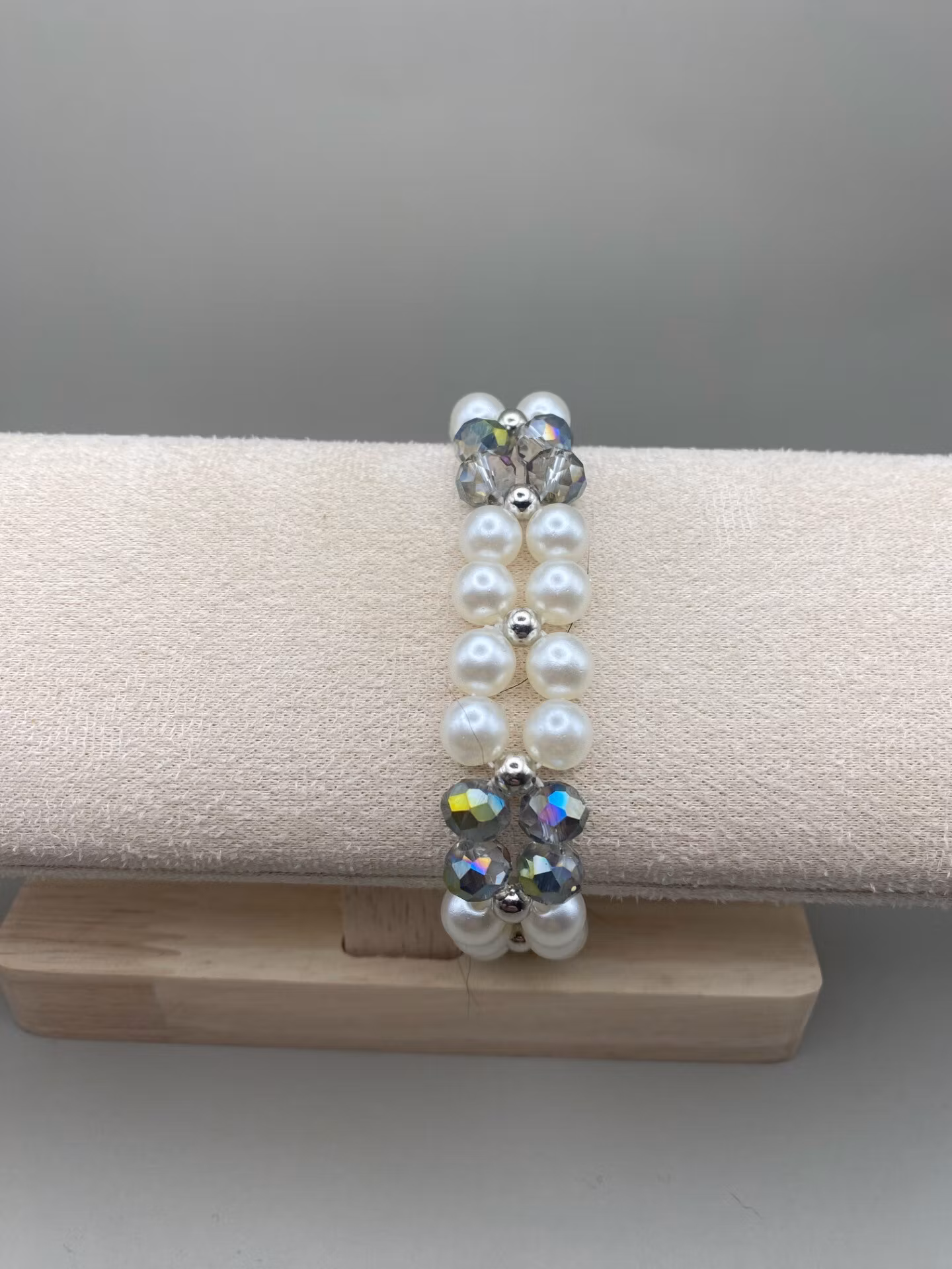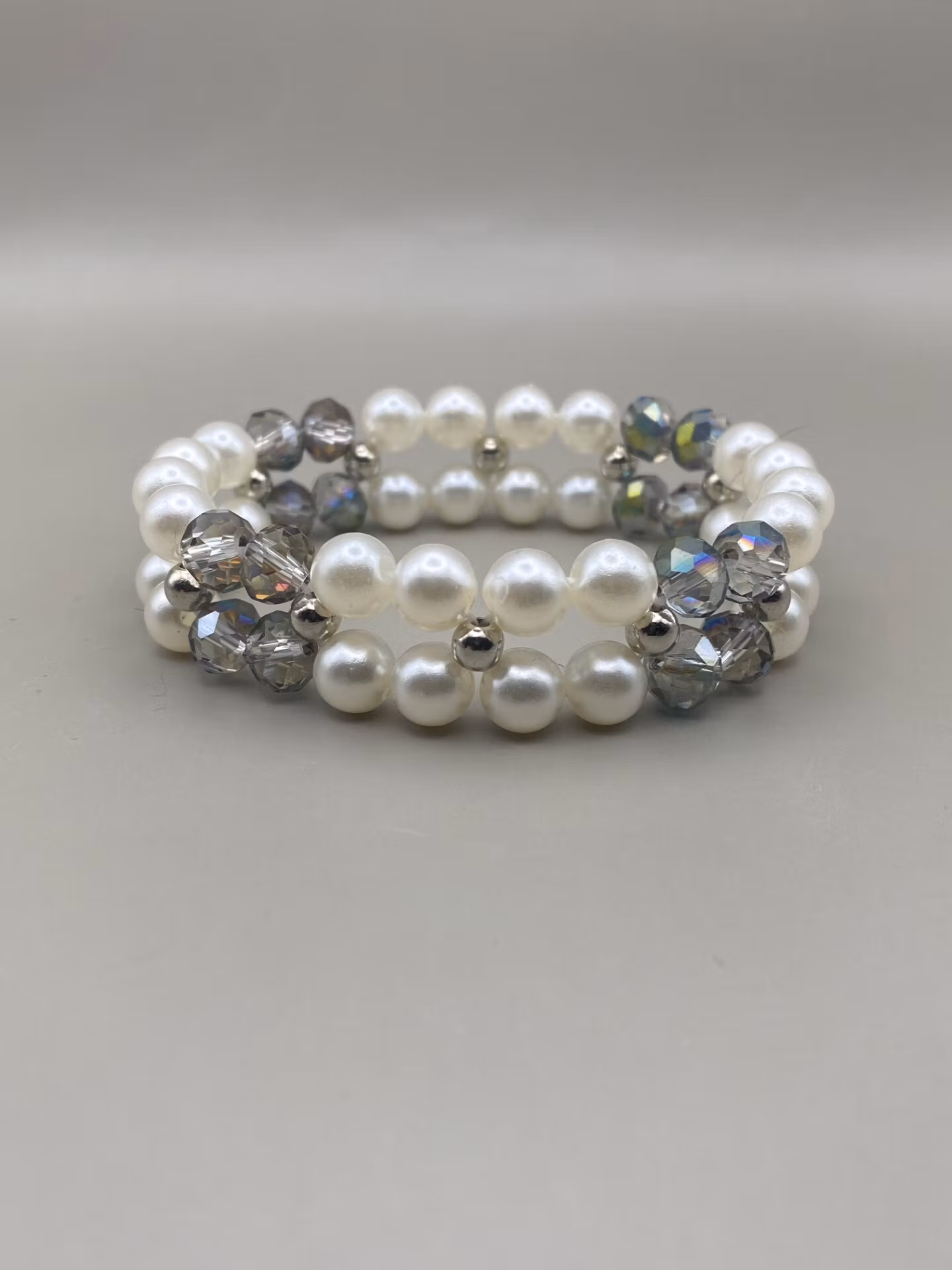 Vackert elegant tvåradigt armband i en lyxig mix av stora elfenbensvita blanka pärlor i varvat fint mönster med stora skimrande flerfärgade facetterade glaskristallpärlor och små silverfärgade pärlor.