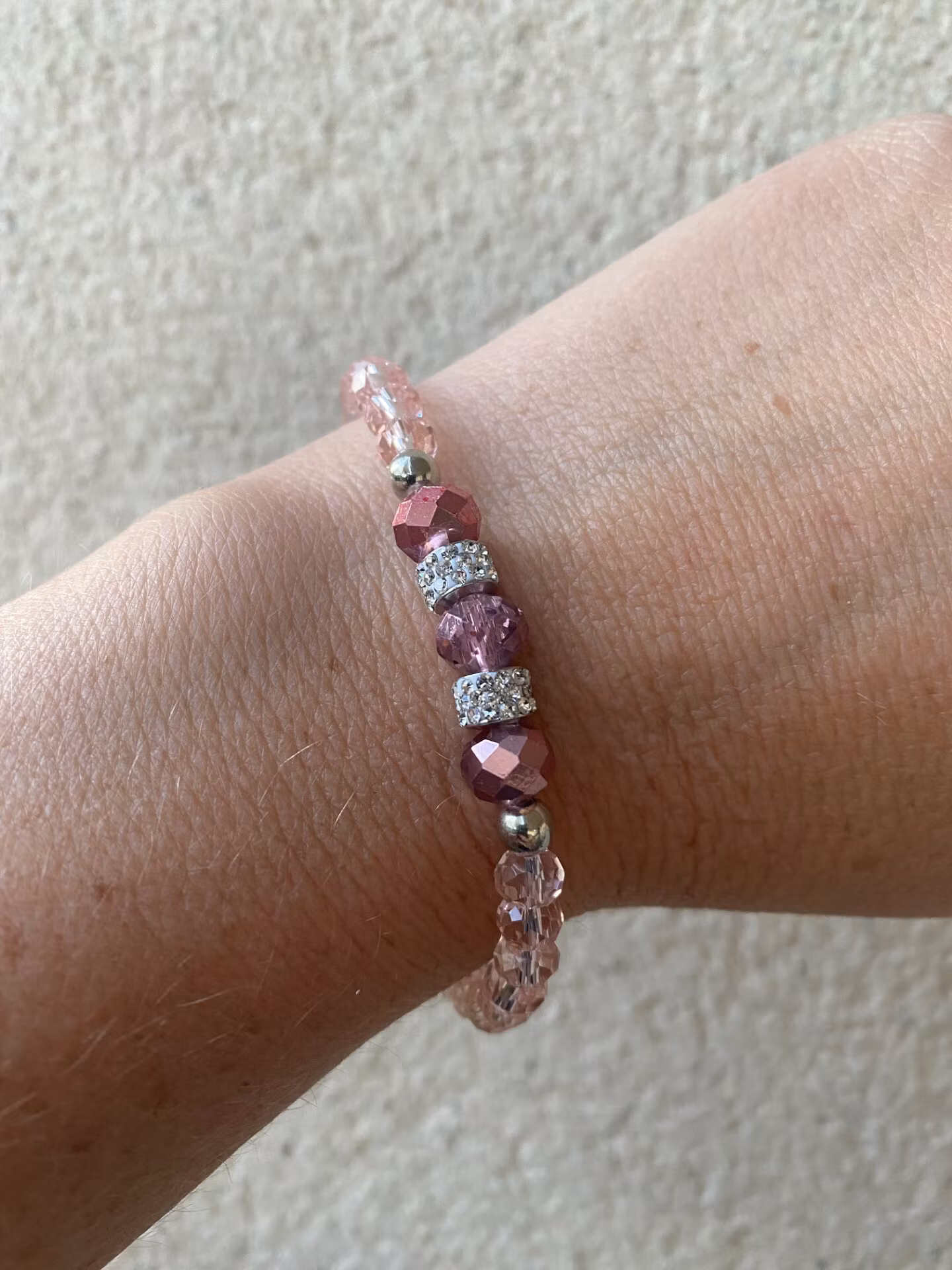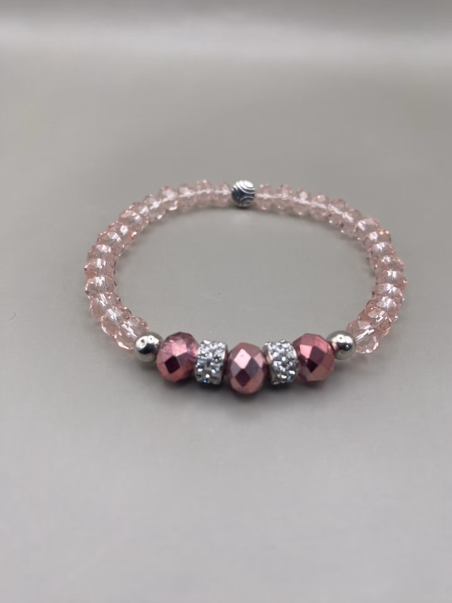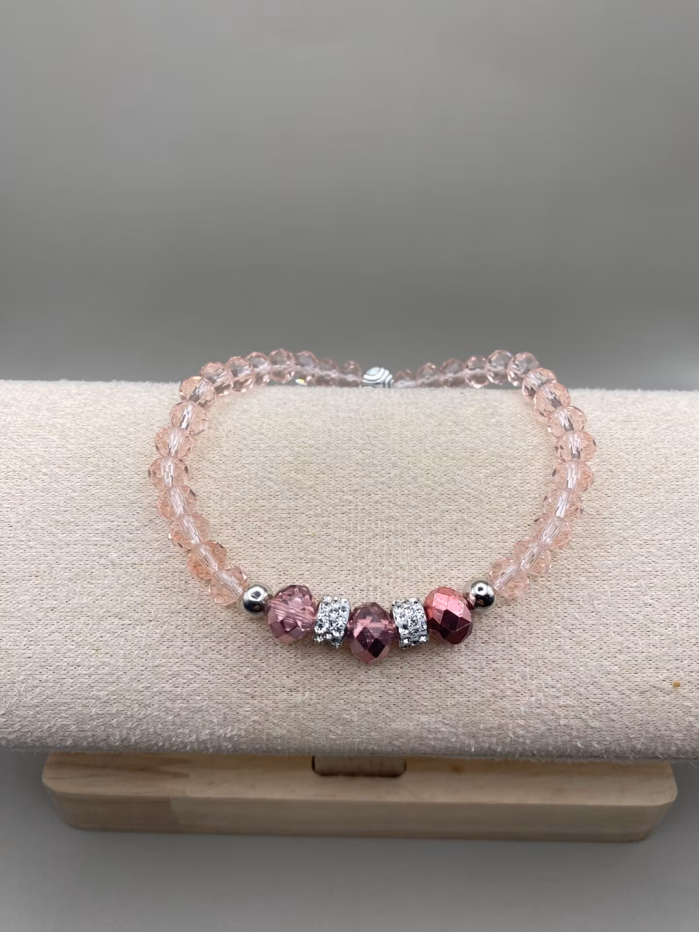 Vackert arbmand i ljusrosa glaskristallpärlor runt om och rosamellerade spegelblanka glaskristallpärlor står i blickfånget, varvat med silverfärgade små pärlor och strass.