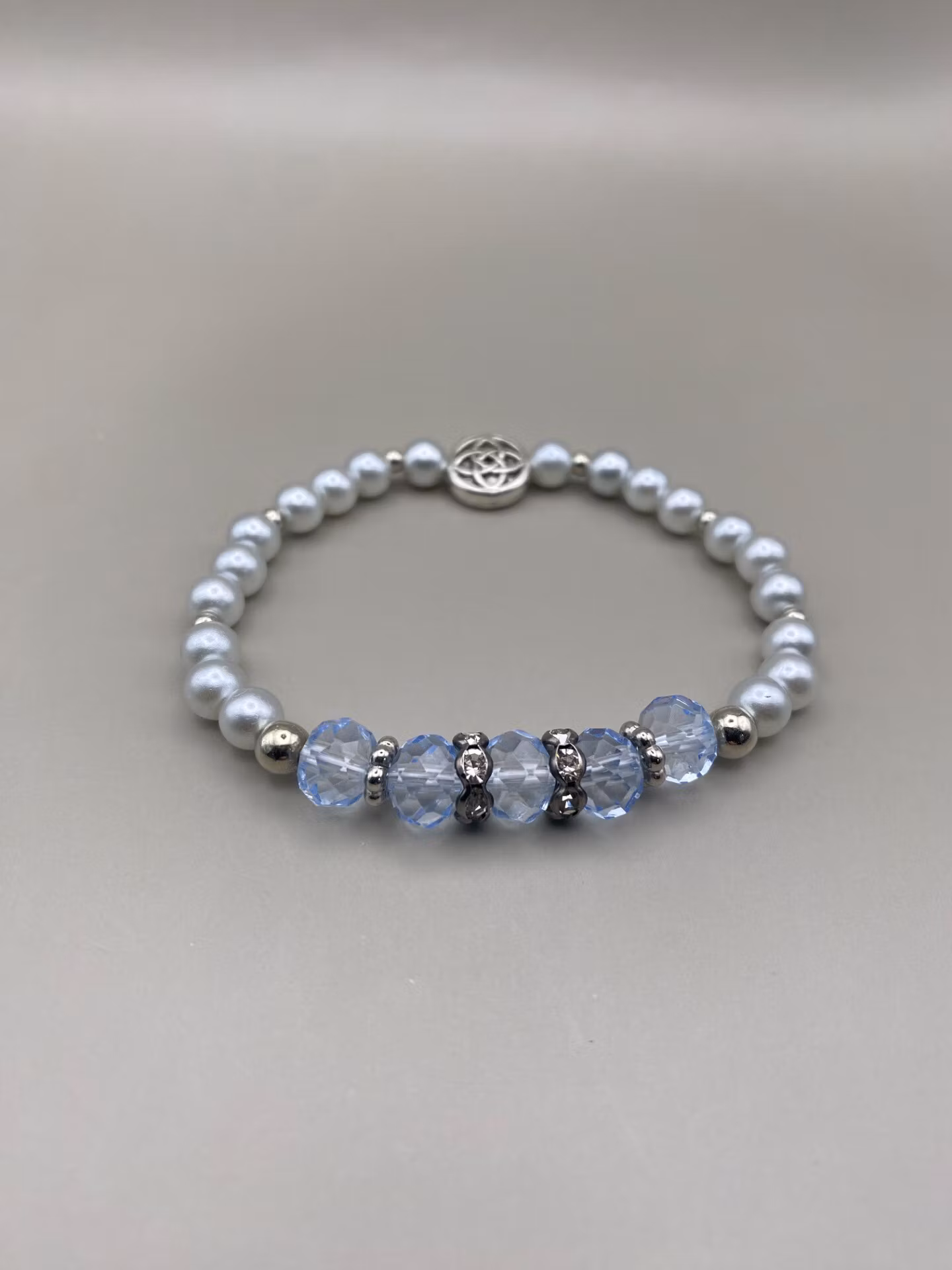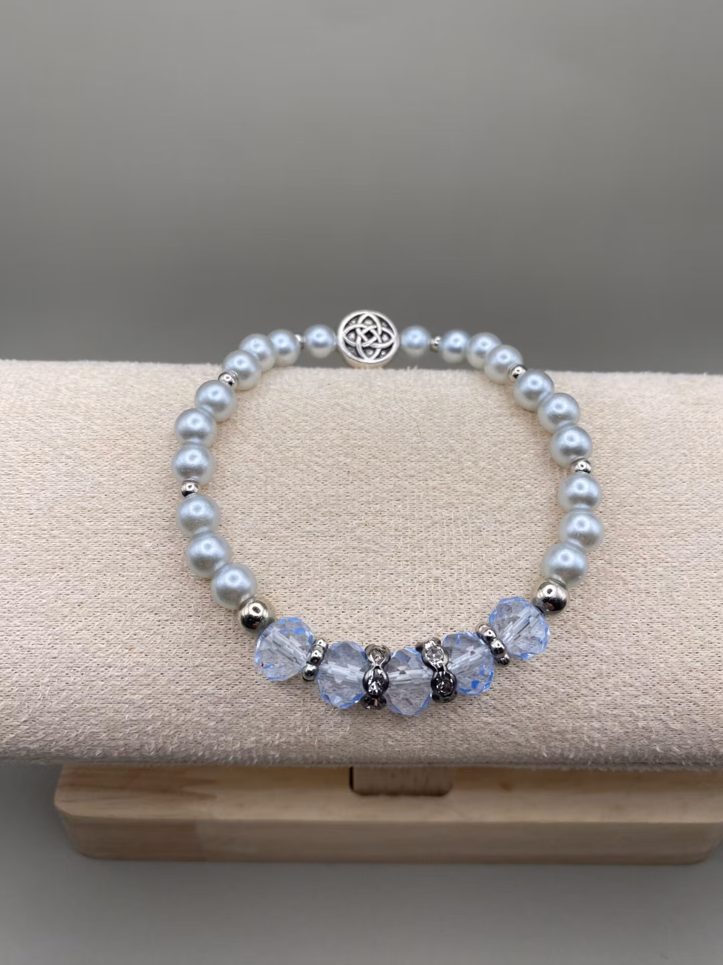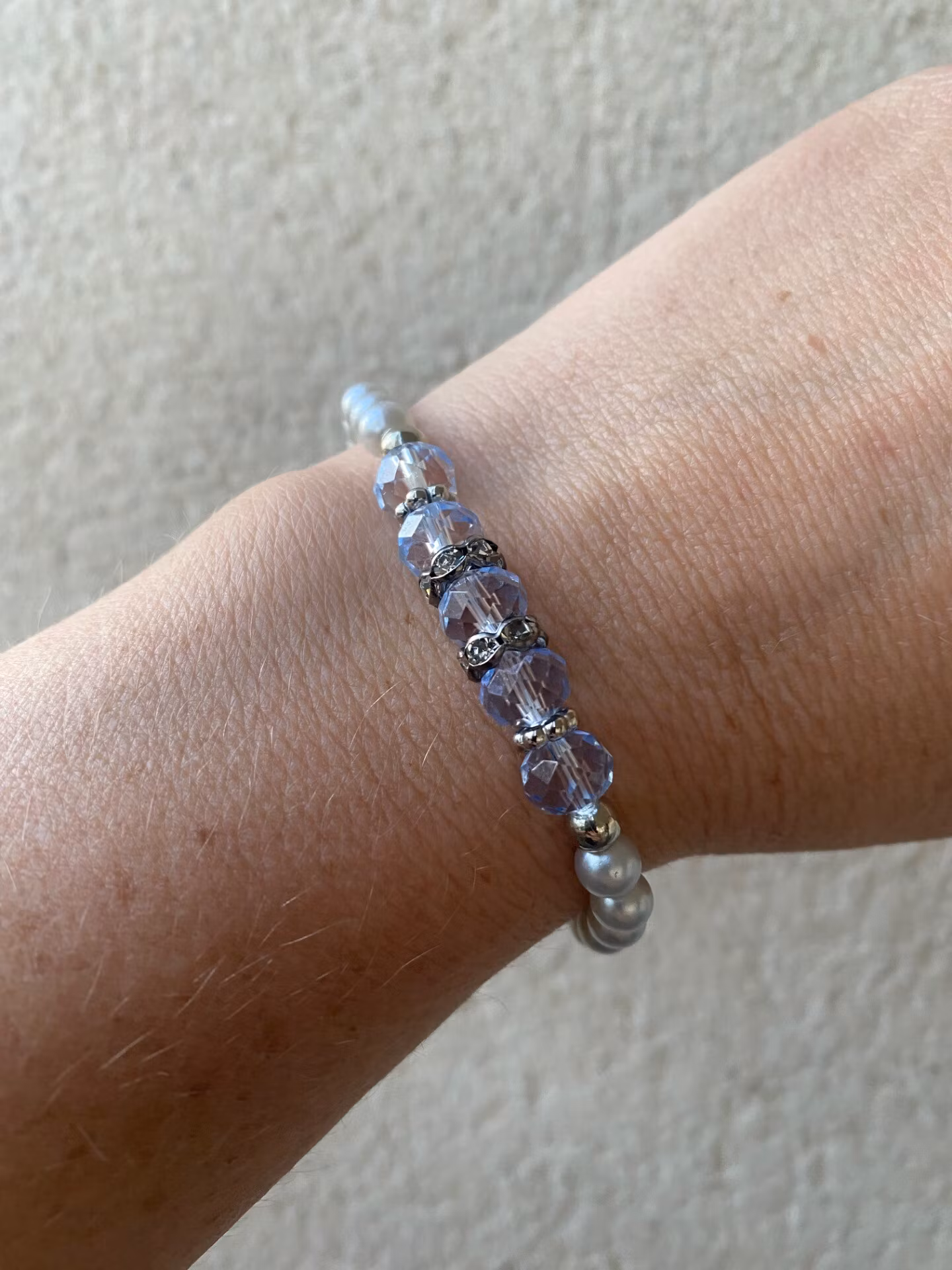 Vackert skimrande armband i elfenbensvita högblanka mindre pärlor runt om och i blickfånget skimrar fem stora, svagt ljusblå facetterade glaskristallpärlor, stålgrå strass och silverfärgade distanser och pärlor.