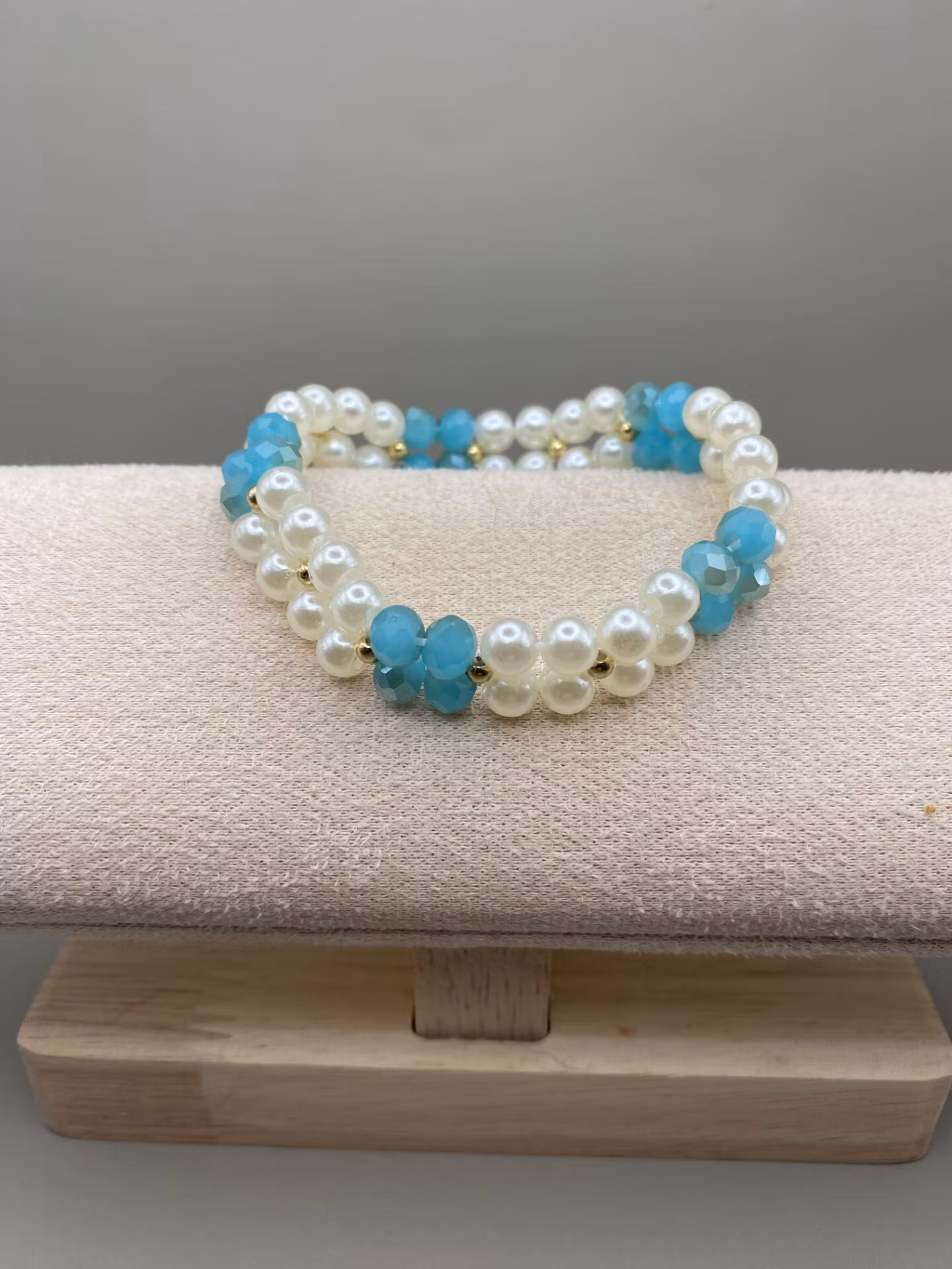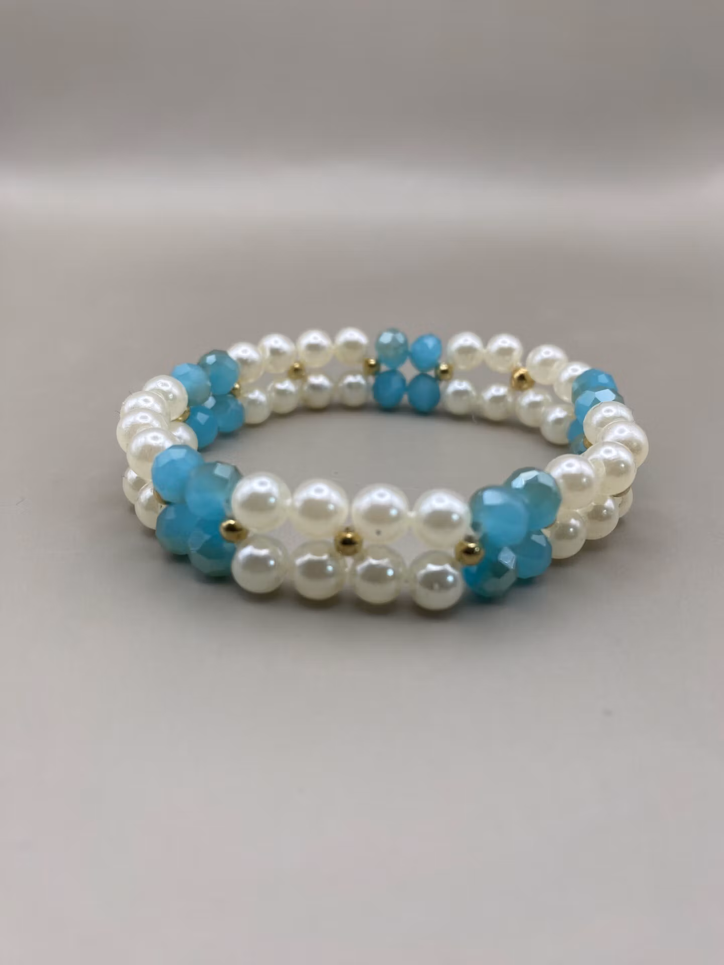 Vackert elegant tvåradigt armband i en lyxig mix av elfenbensvita blanka pärlor i varvat fint mönster med turkosmellerade facetterade glaskristallpärlor och små